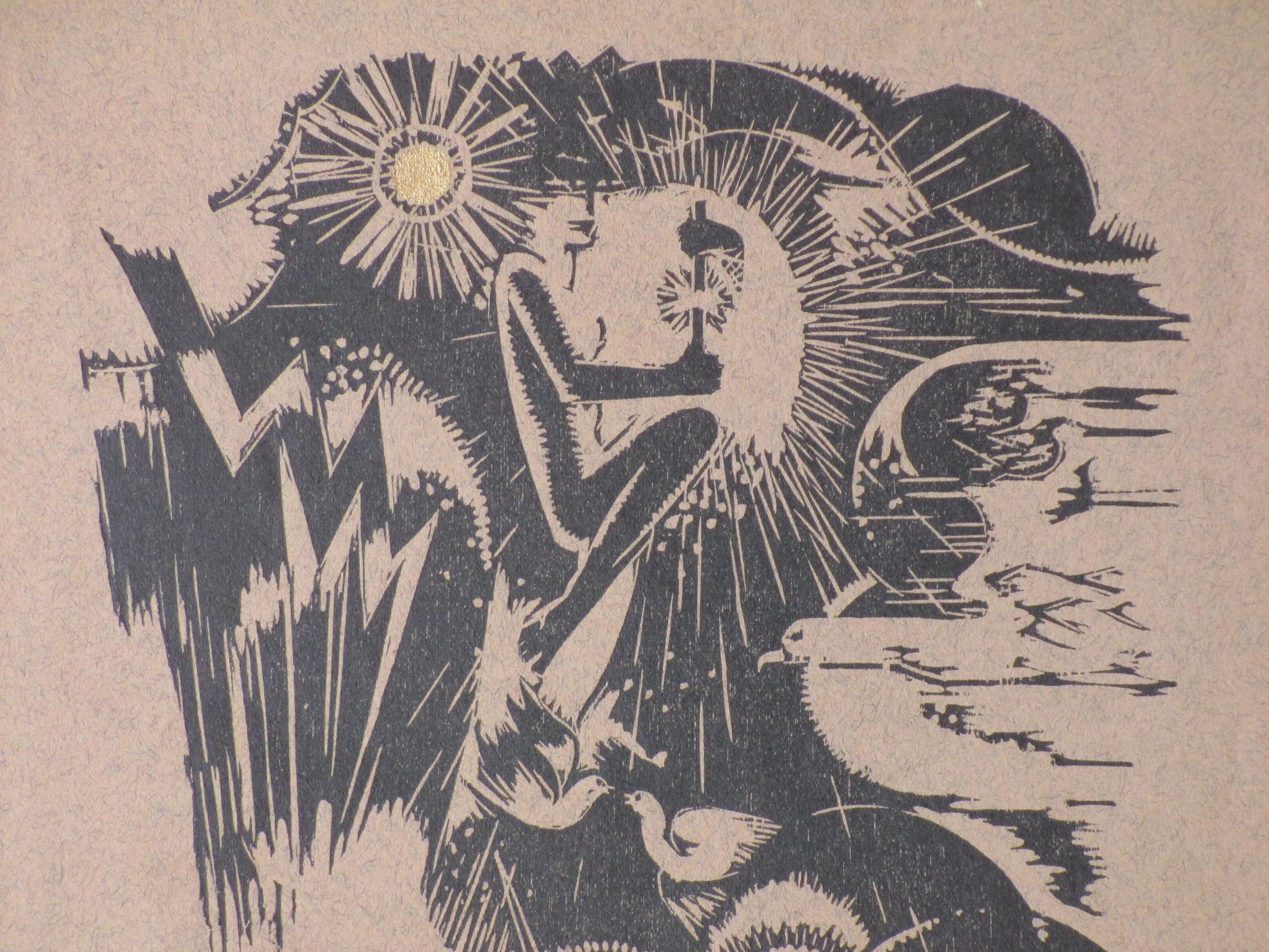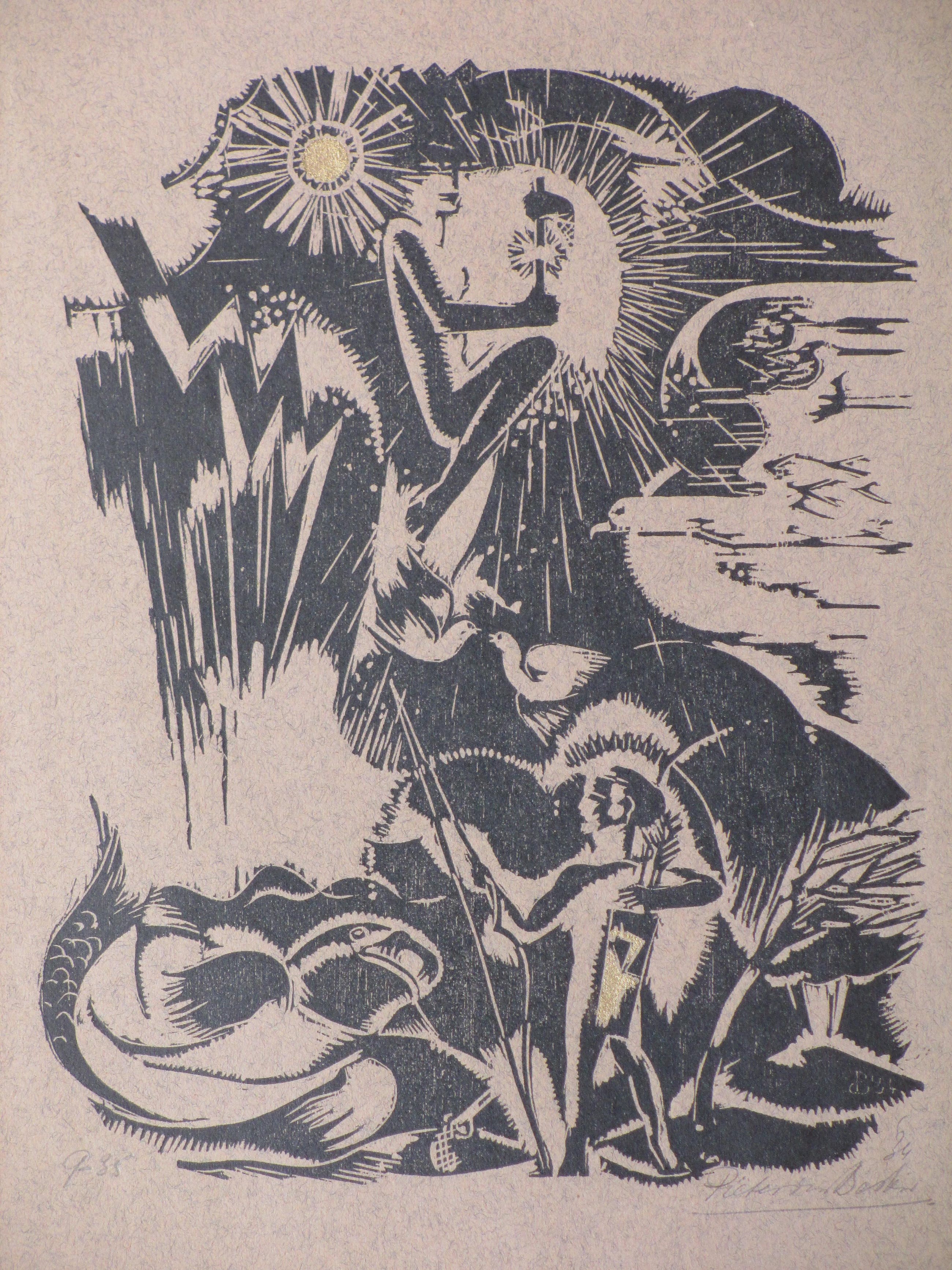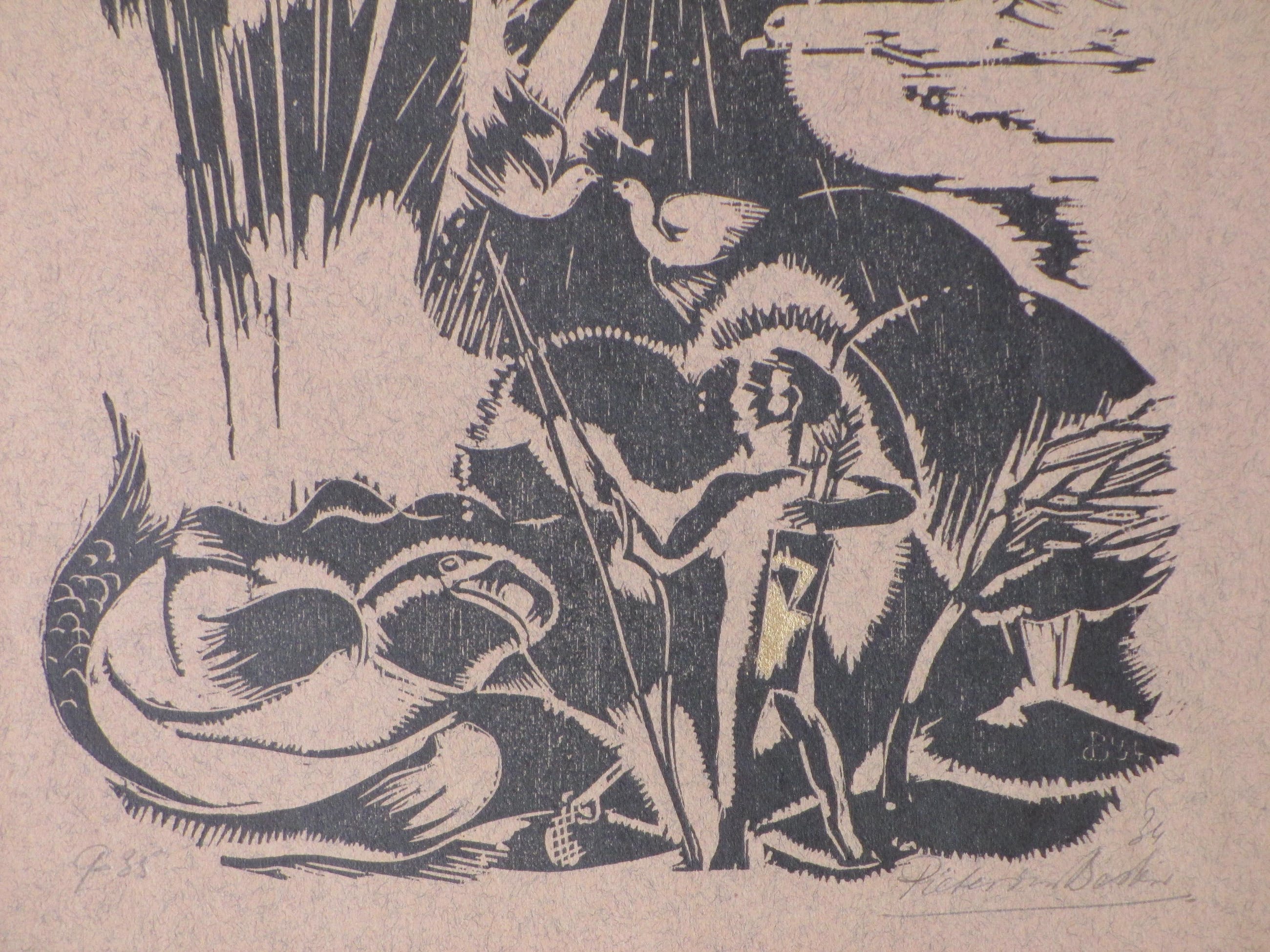 Vergulde houtsnede door Pieter den Besten Voorstelling van een vredig paradijs Losbladig, beeldmaat 25x20, bladmaat 38x30 Gesigneerd en gedateerd r.o. 'Pieter den Besten' en '34' Genummerd l.o. '9-35' Authenticiteit volledig gegarandeerd
