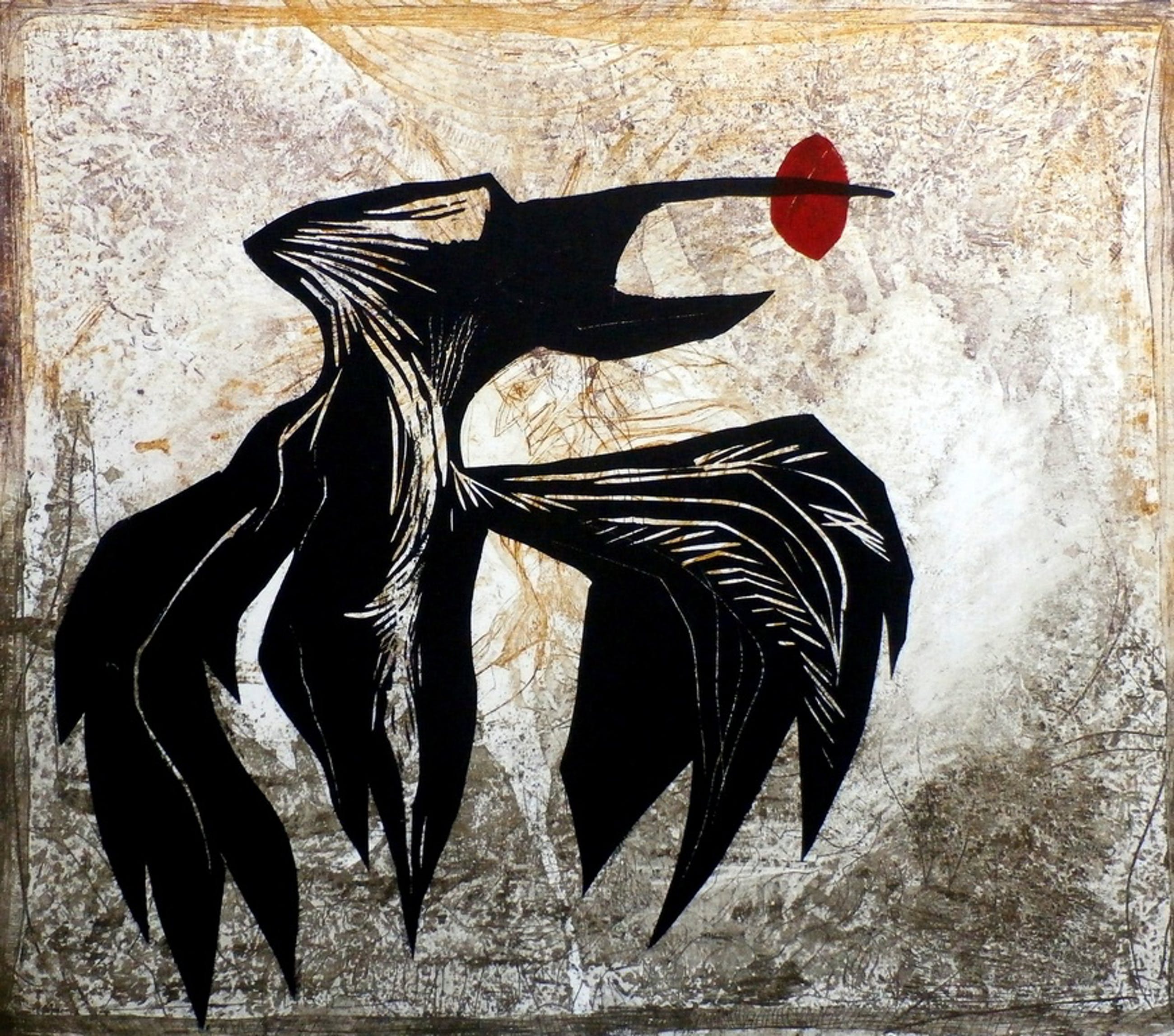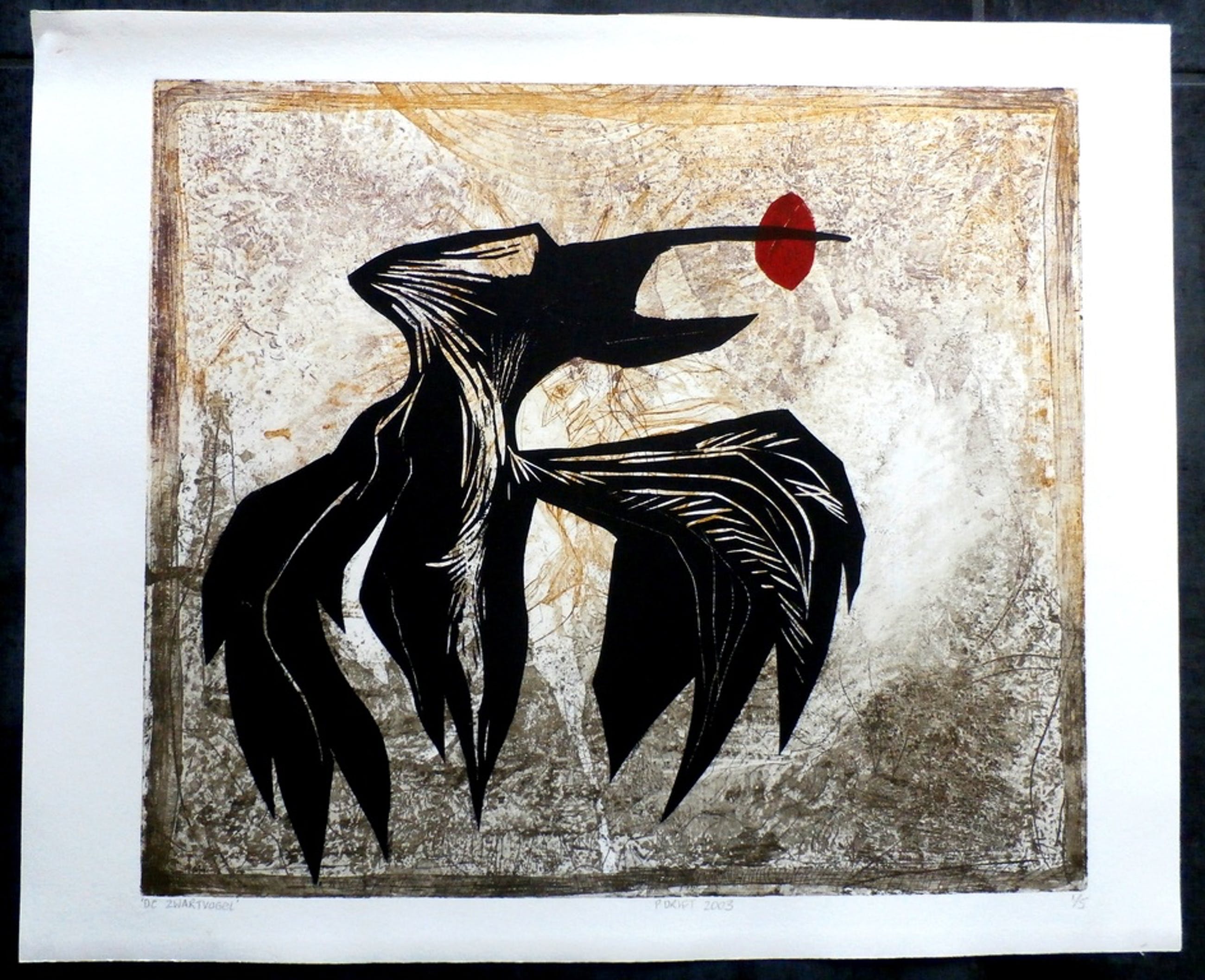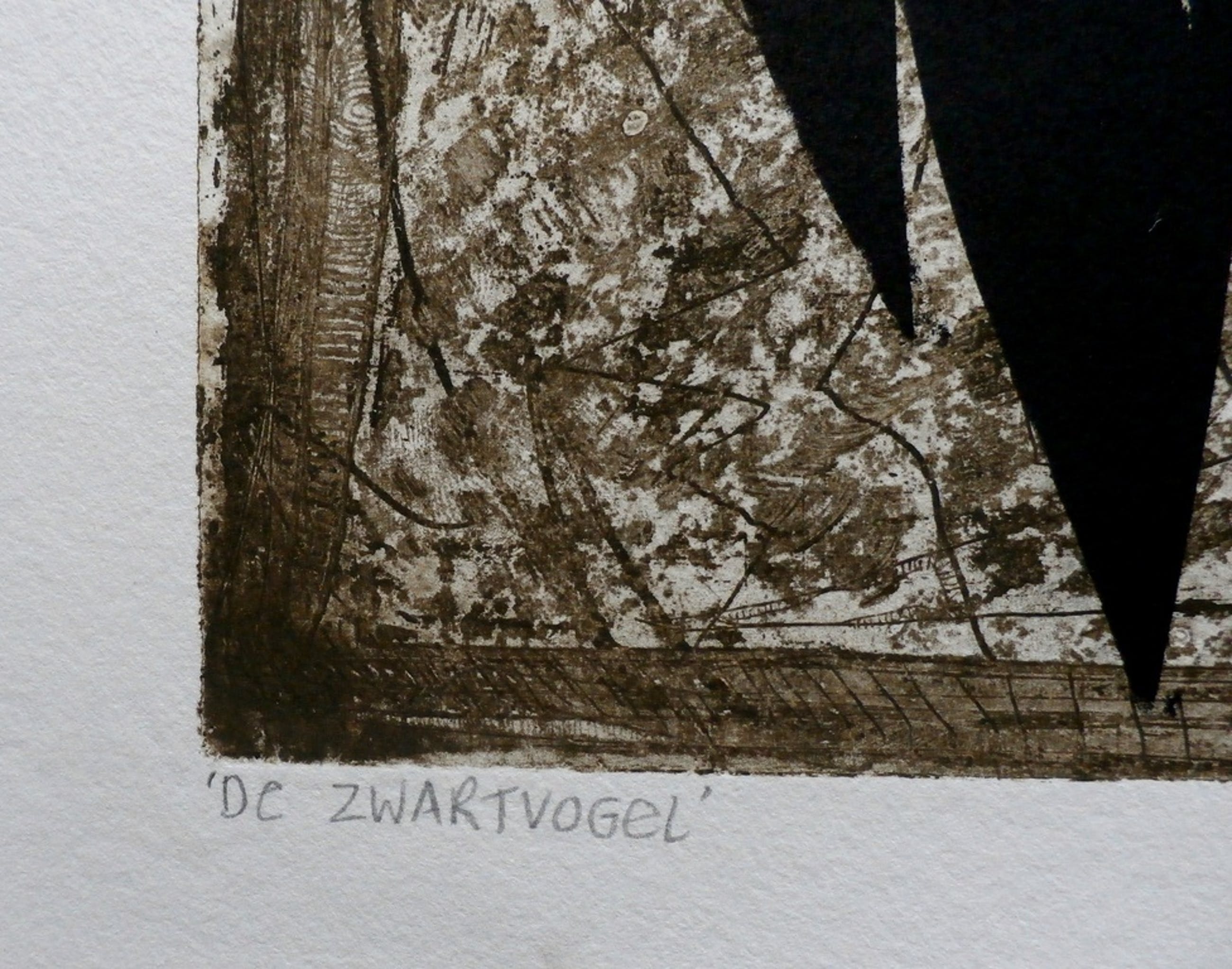 Ets van Pieter Drift uit 2003. Titel: De Zwartvogel. Afmetingen blad: H50 x b60,5 cm; Afmetingen voorstelling: H43,5 x b49,5 cm; Gesigneerd, middenonder, door de kunstenaar met potlood. Nummer: 1/5.