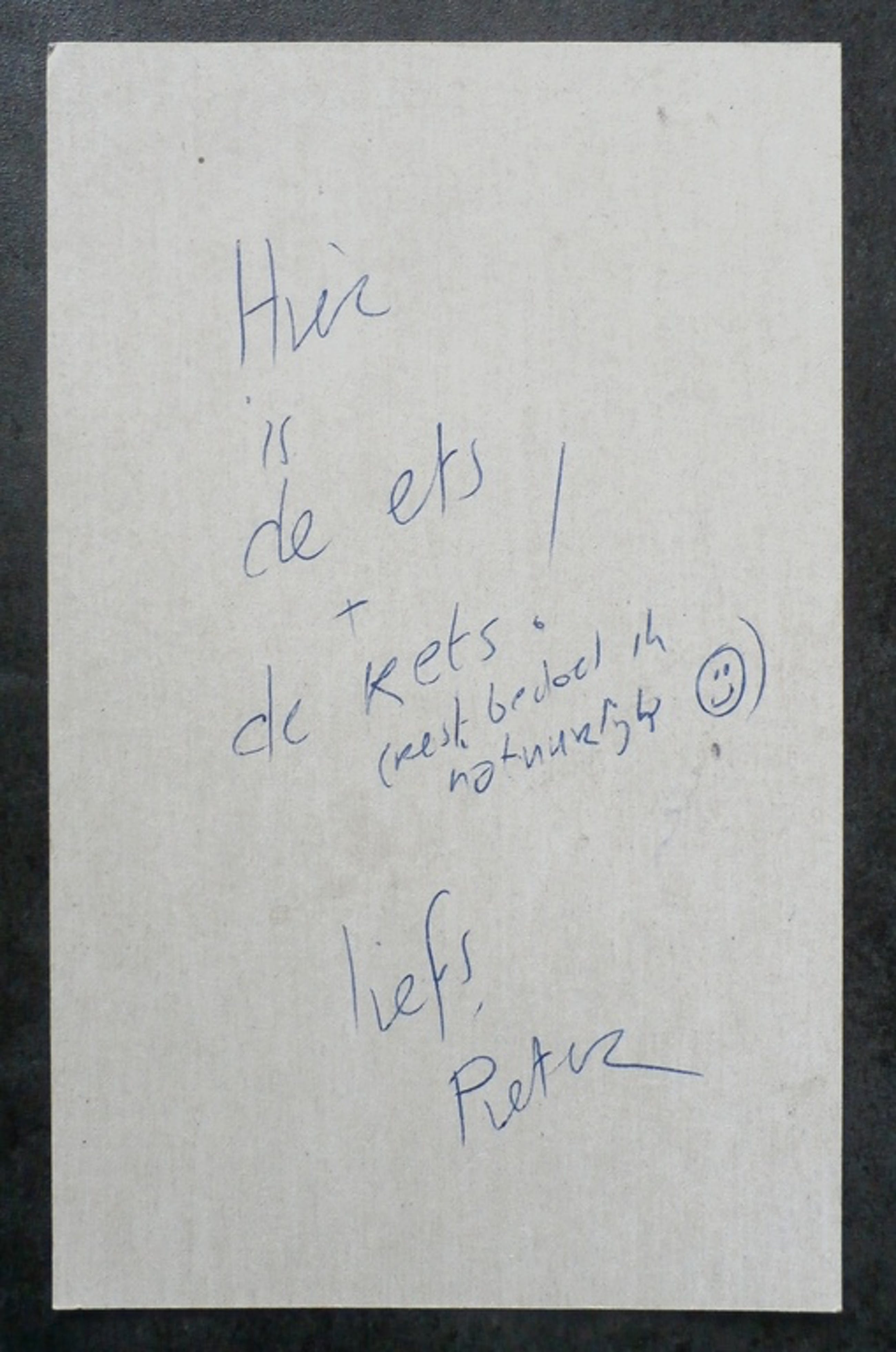 Inkt/ stifttekening van Pieter Drift. Het werk is aan de onderzijde gesigneerd. Jaar: 1997 (11) Afmetingen : h16 x b10 cm De authenticiteit van het aangeboden werk wordt voor 100% gegarandeerd. Een certificaat van echtheid kan, op aanvraag, worden meegestuurd. Tekst achterzijde: Hier is de ets + de rets (rest bedoel ik natuurlijk). Liefs Pieter. Conditie: in goede staat.