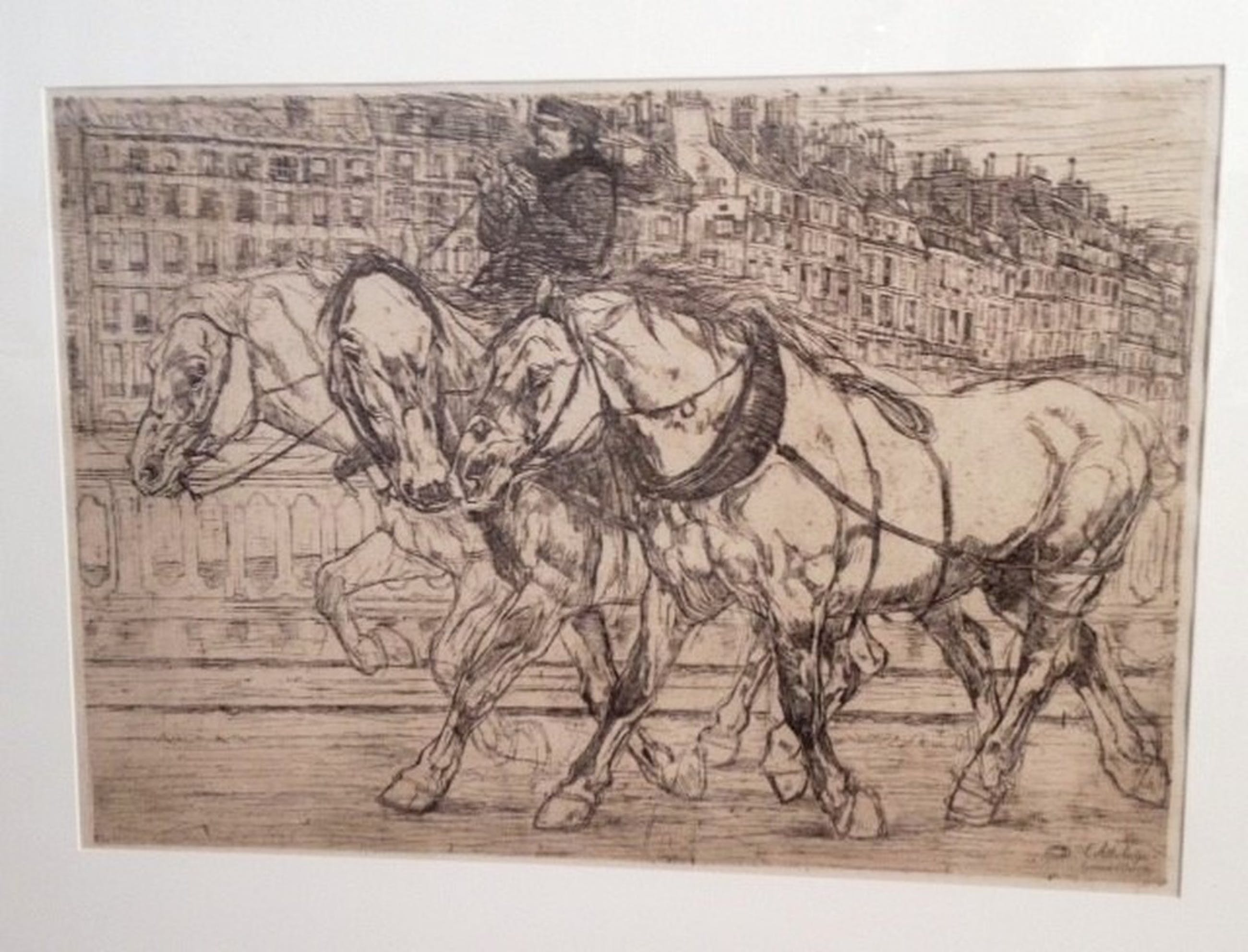 Zelden aangeboden! Ets op zink “Terug naar den stal” uit omstreeks 1896. Ets in Parijs gemaakt. Een opvallende fout op deze voorstelling is het aantal paardenbenen, dat slechts 11 bedraagt. Beeldmaat 44,2 cm x 64 cm. Catalogus van Wisselingh No. 329 in een oplage van slechts 25 exemplaren. Rechtsonder in de plaat het bekende atelierstempel. Ligt zuurvrij en niet in het geheel geplakt in een notenlijst.