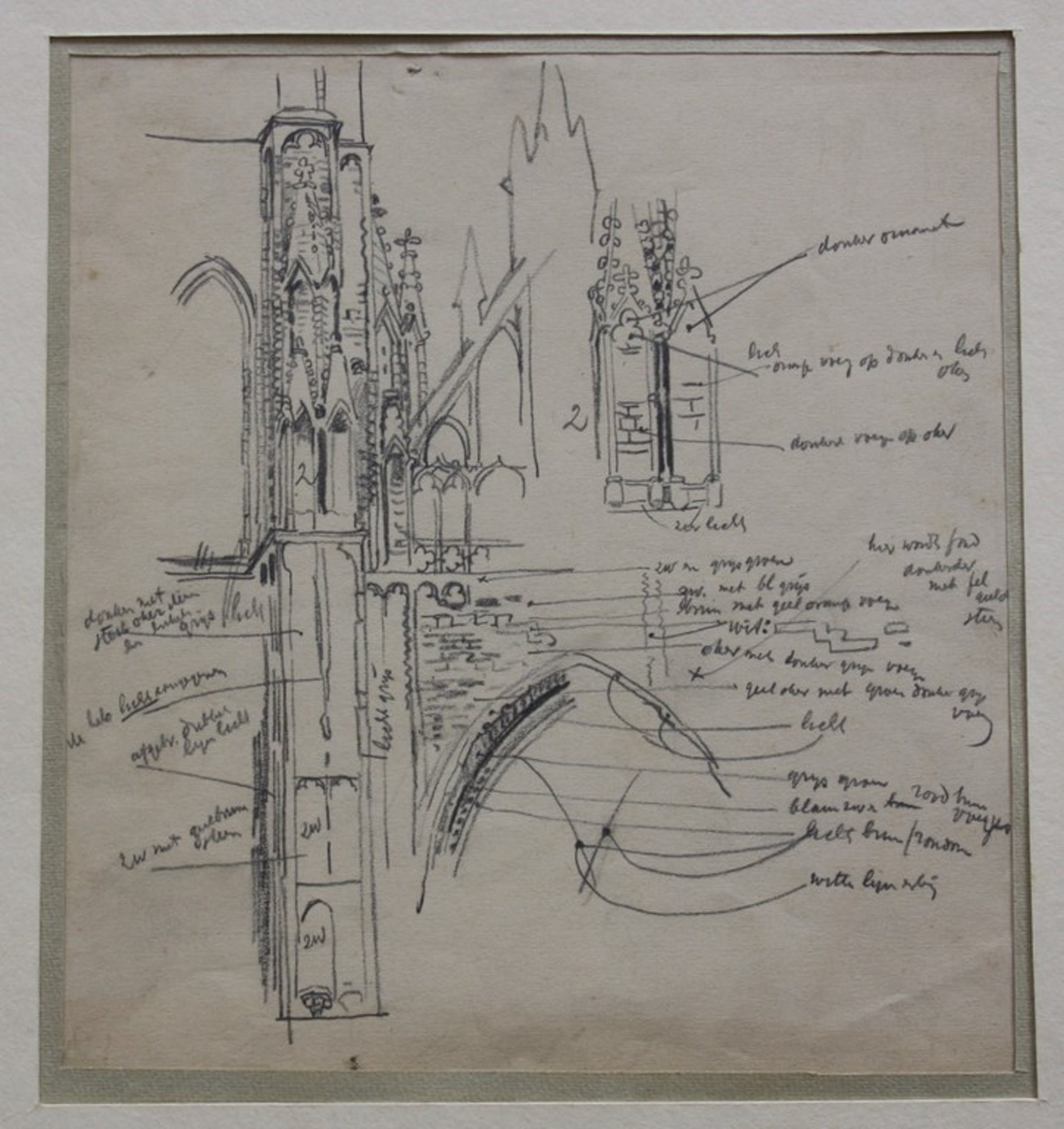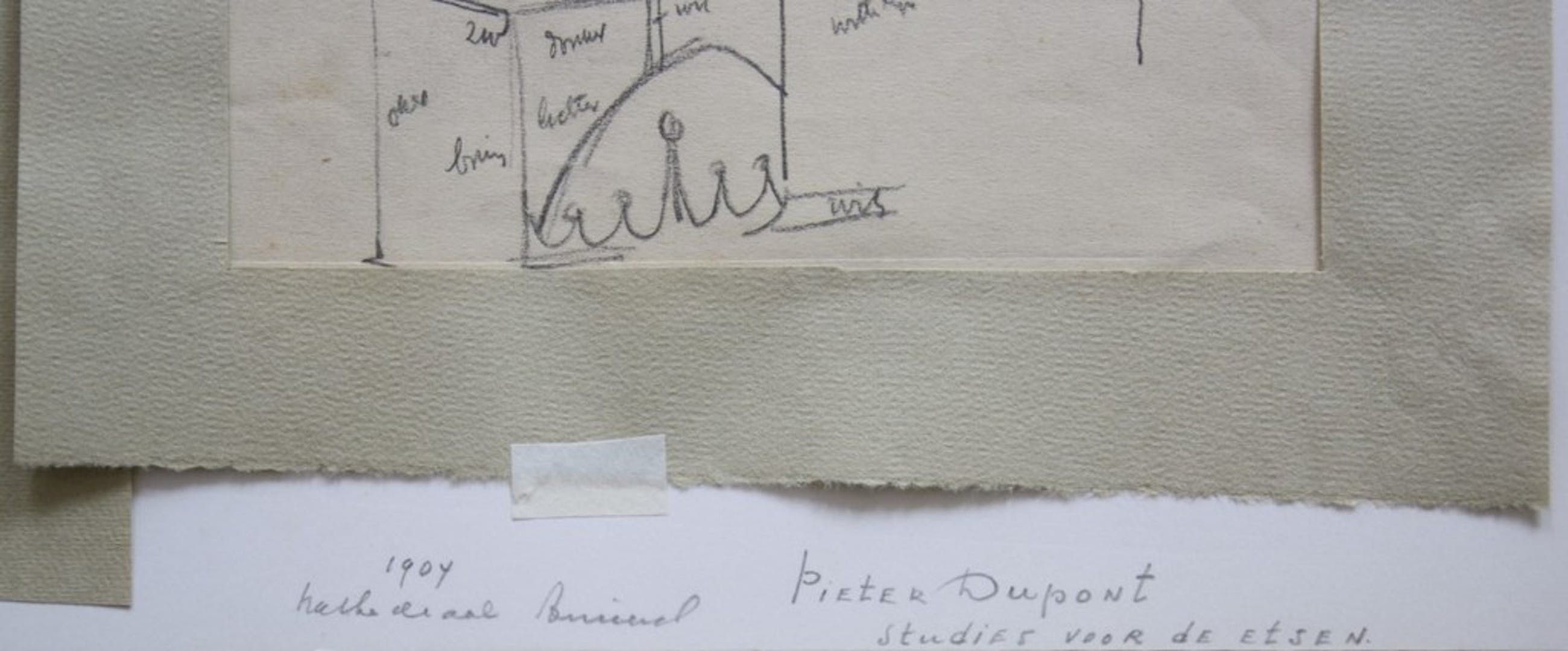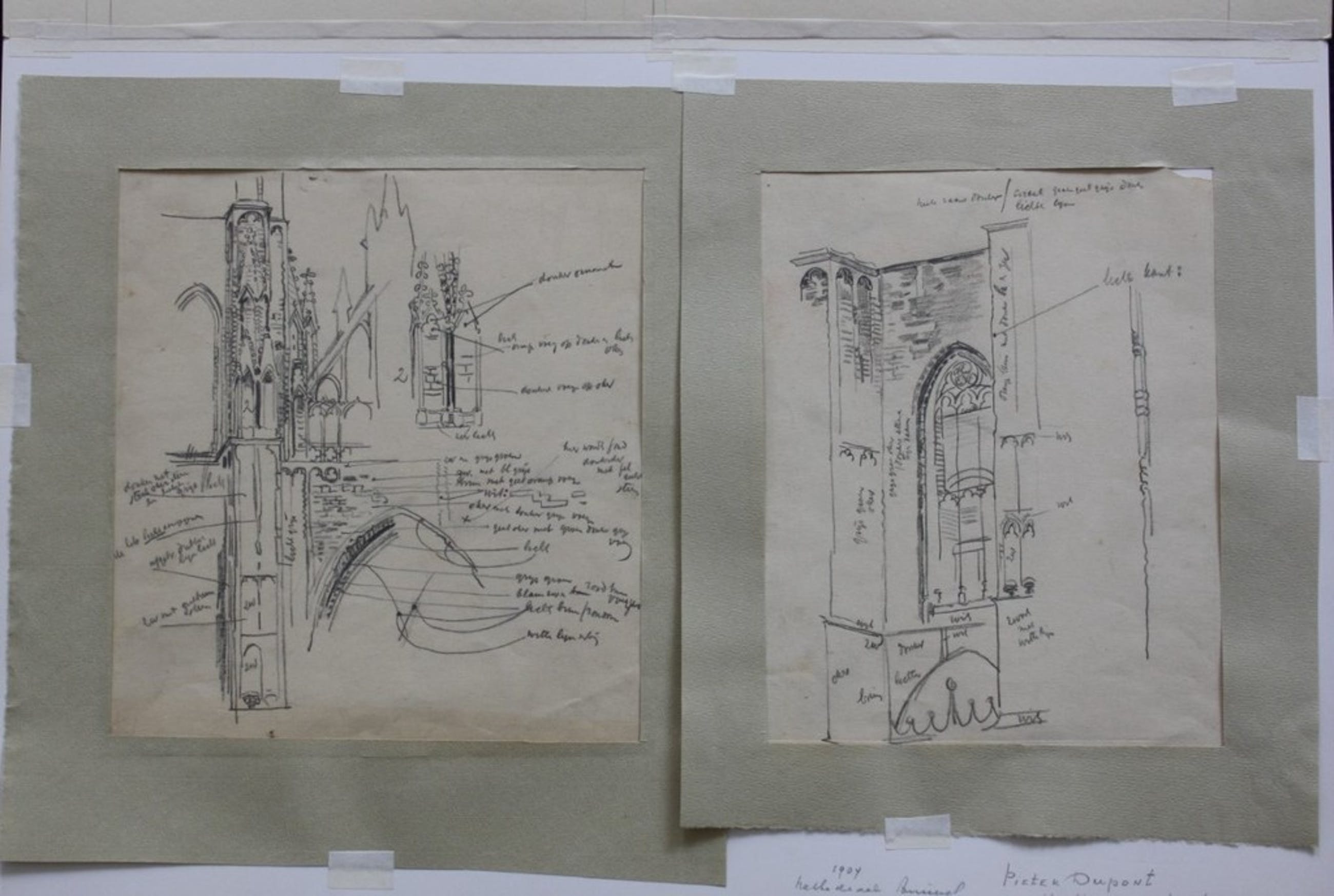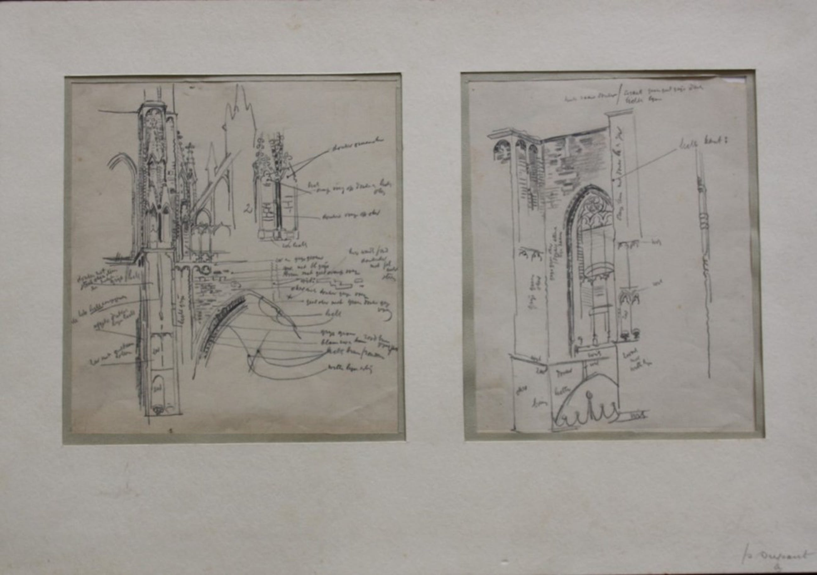 Twee originele studietekeningen uit 1904 van Pieter Dupont. Schetsen met potlood van de Kathedraal in Amiens. Beeldmaat tekening 1: 19,5 cm x 21 cm, tekening 2: 16,5 cm x 21,5 cm. Losbladig in de oude map. Uniek en leuk om als collage samen in te lijsten.