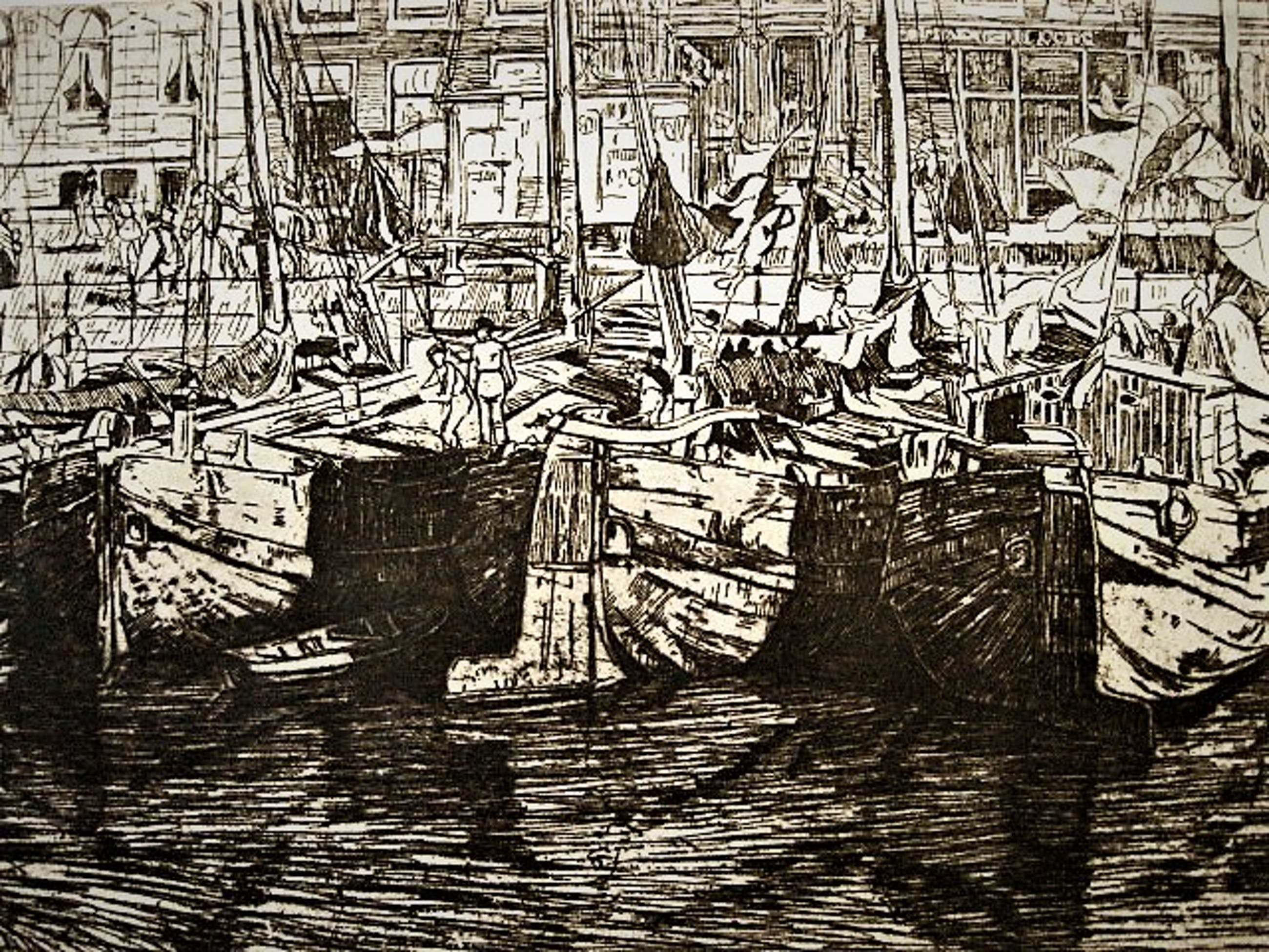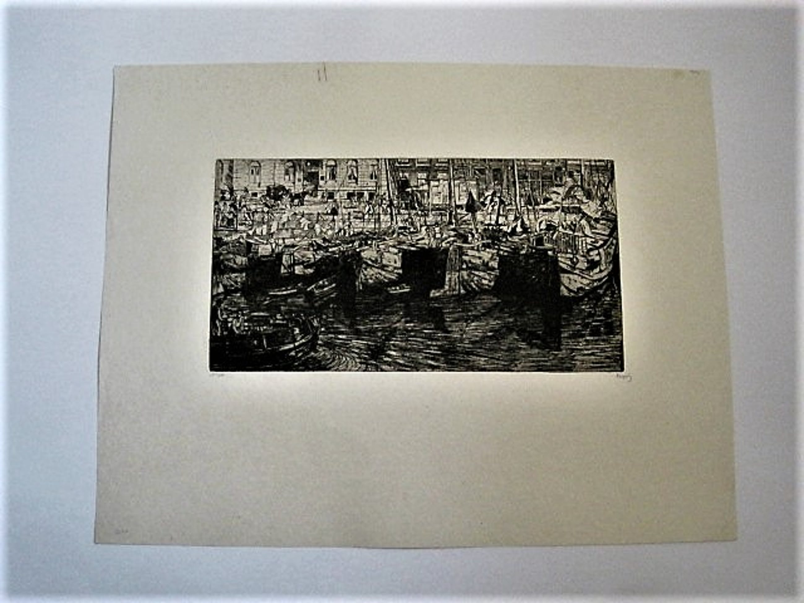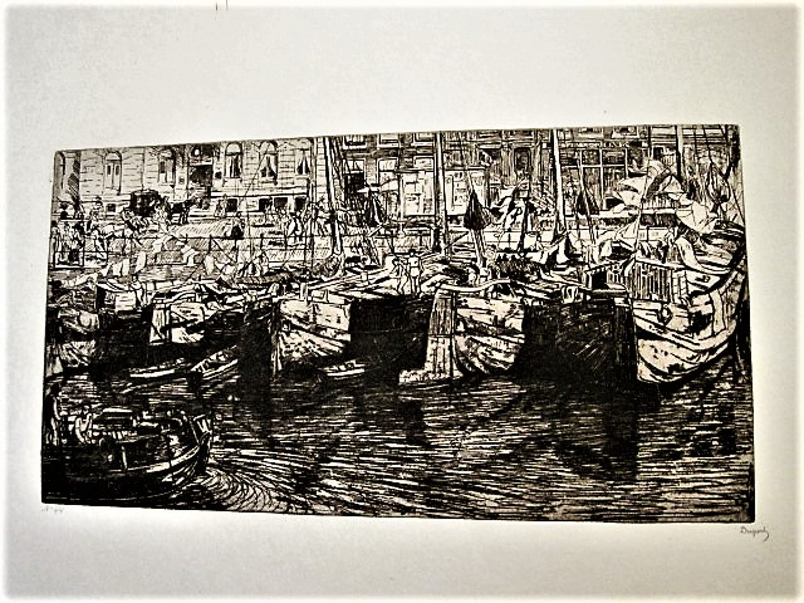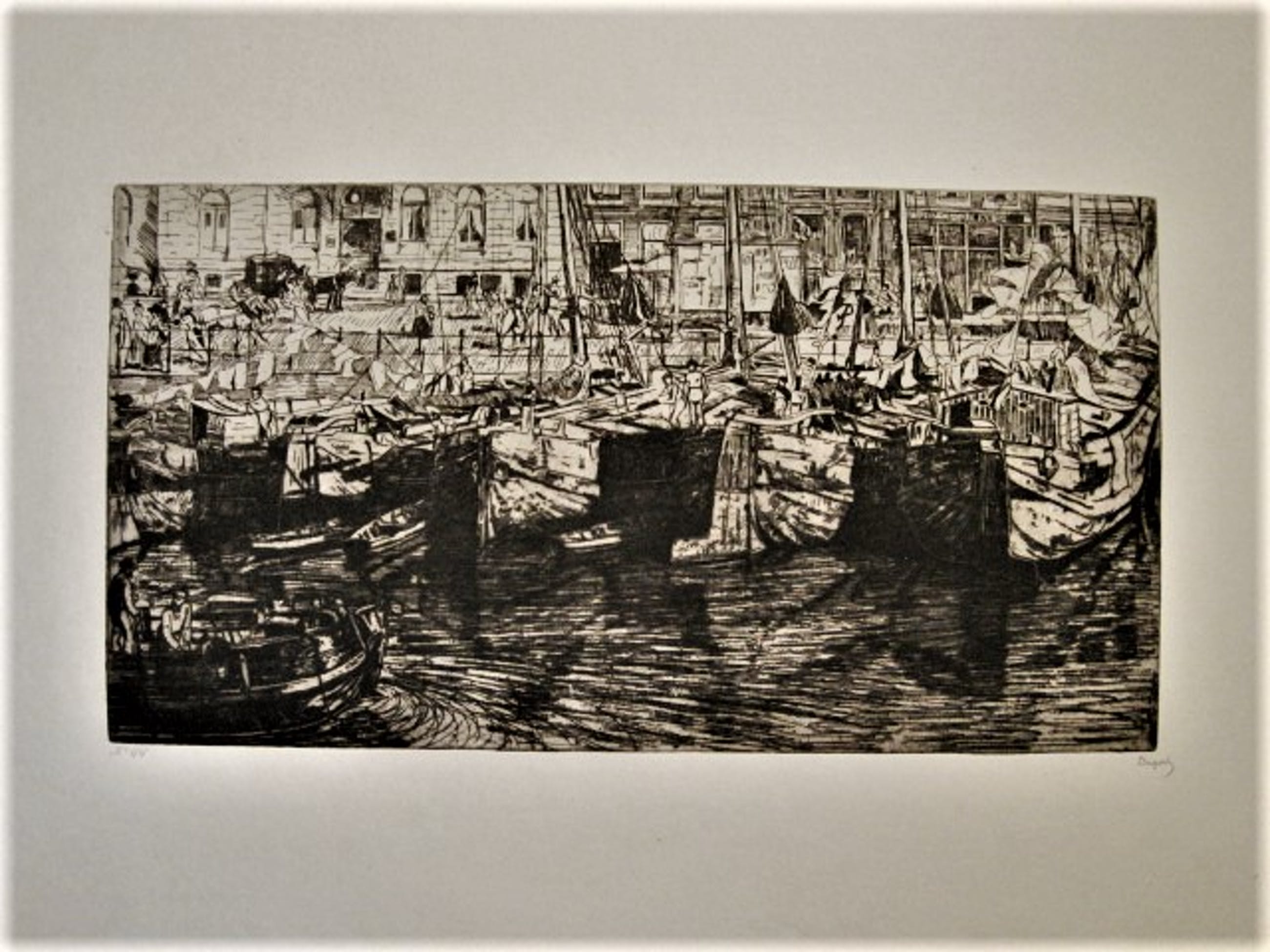 Pieter Dupont (1870-1911) Grote potloodgesigneerde Ets op papier "Bedrijvigheid aan het Damrak te Amsterdam" 100 genummerde exemplaren. Deze ets heeft nummer 44 Mooie scherpe Ets.