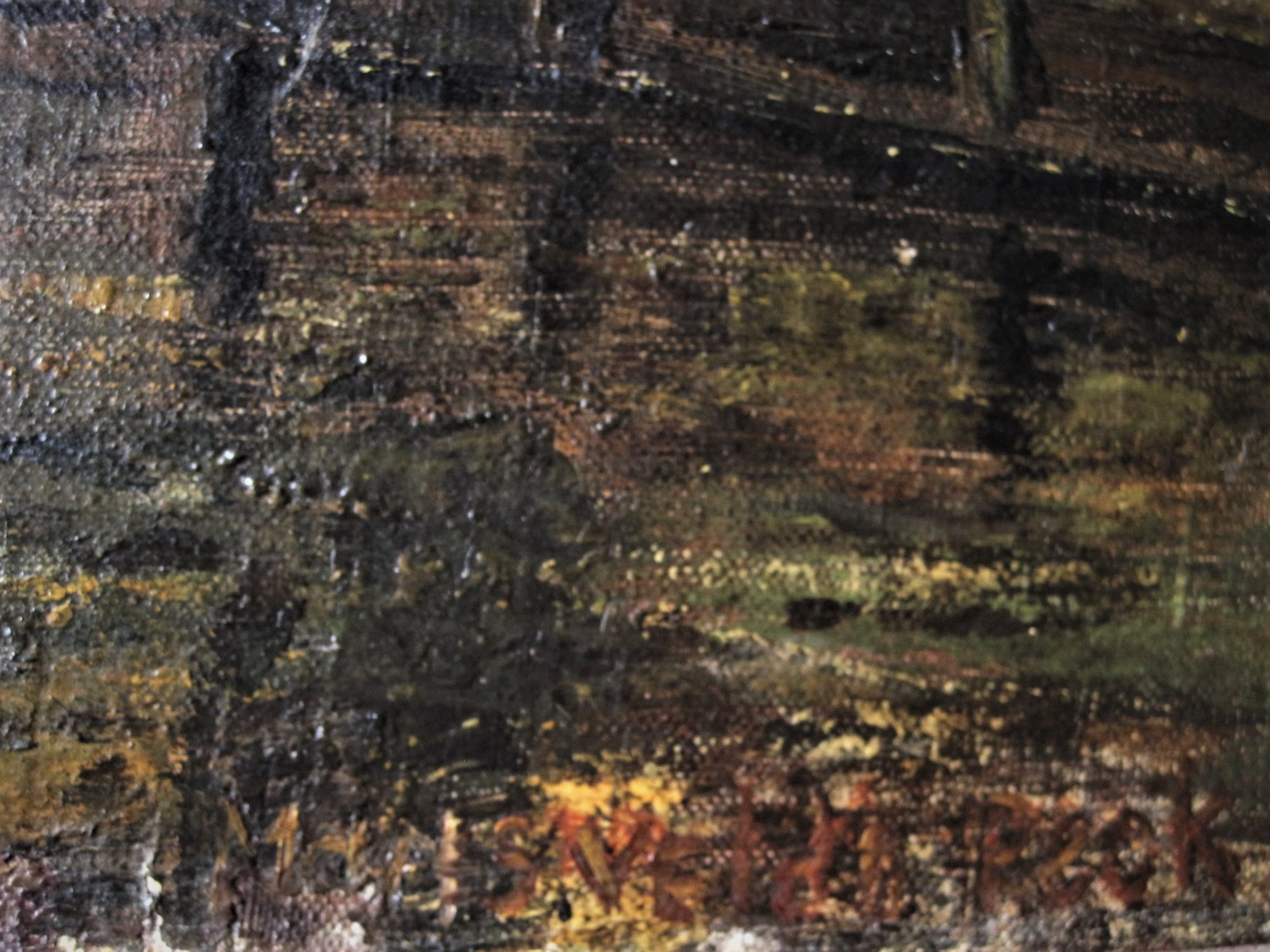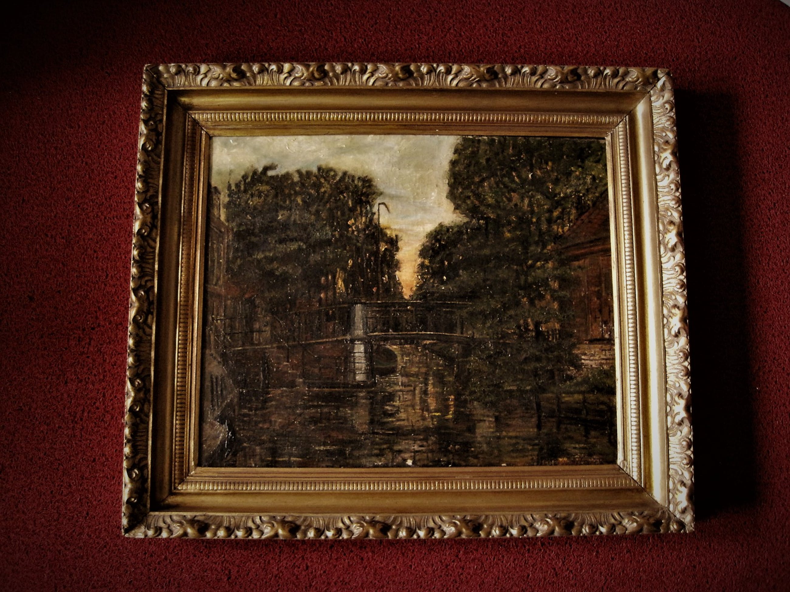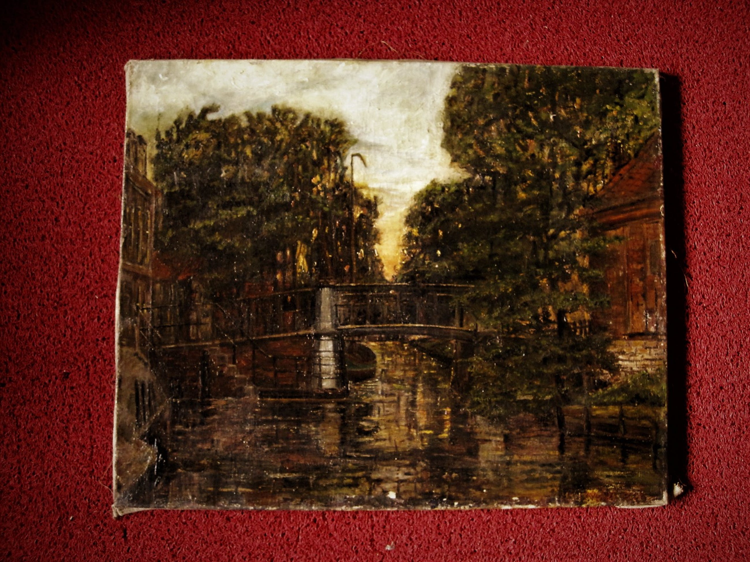 - GROOT omstreeks 1920 geschilderd olieverf op doek schilderij met voorstelling van een Hollandse gracht met afgemeerde zeilboot aan het begin van de dag. Rechtsonder gesigneerd Mansvelt Beck (Pieter Mansvelt Beck 1880-1968)