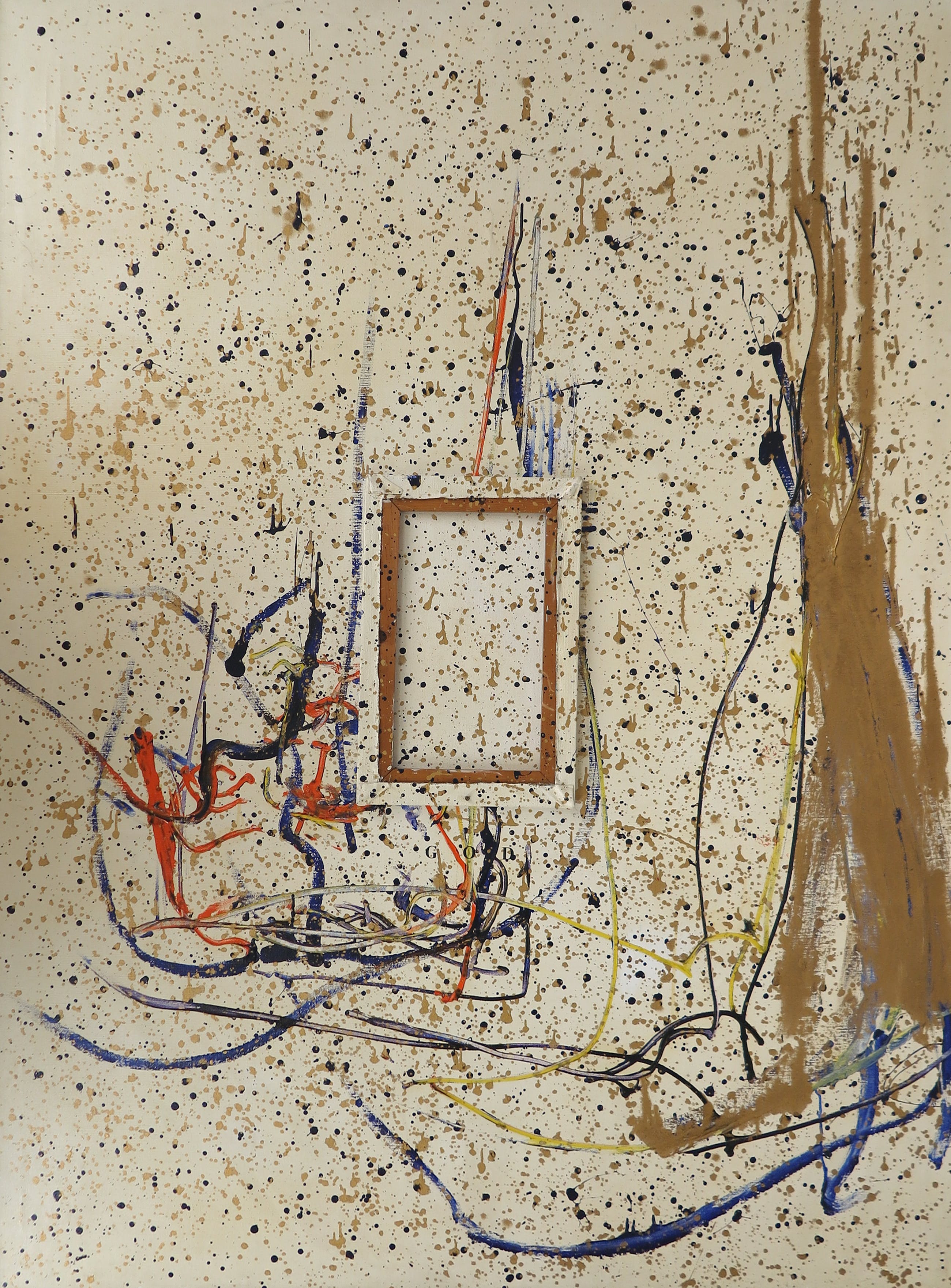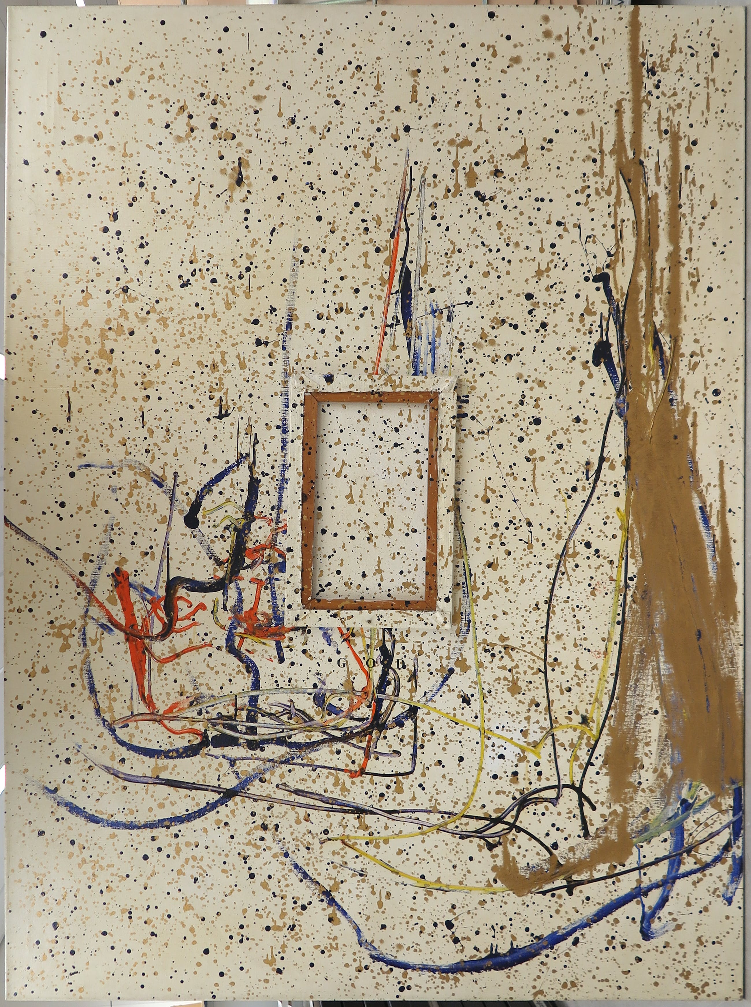 In het midden is op het werk een kleiner spieraam bevestigd.