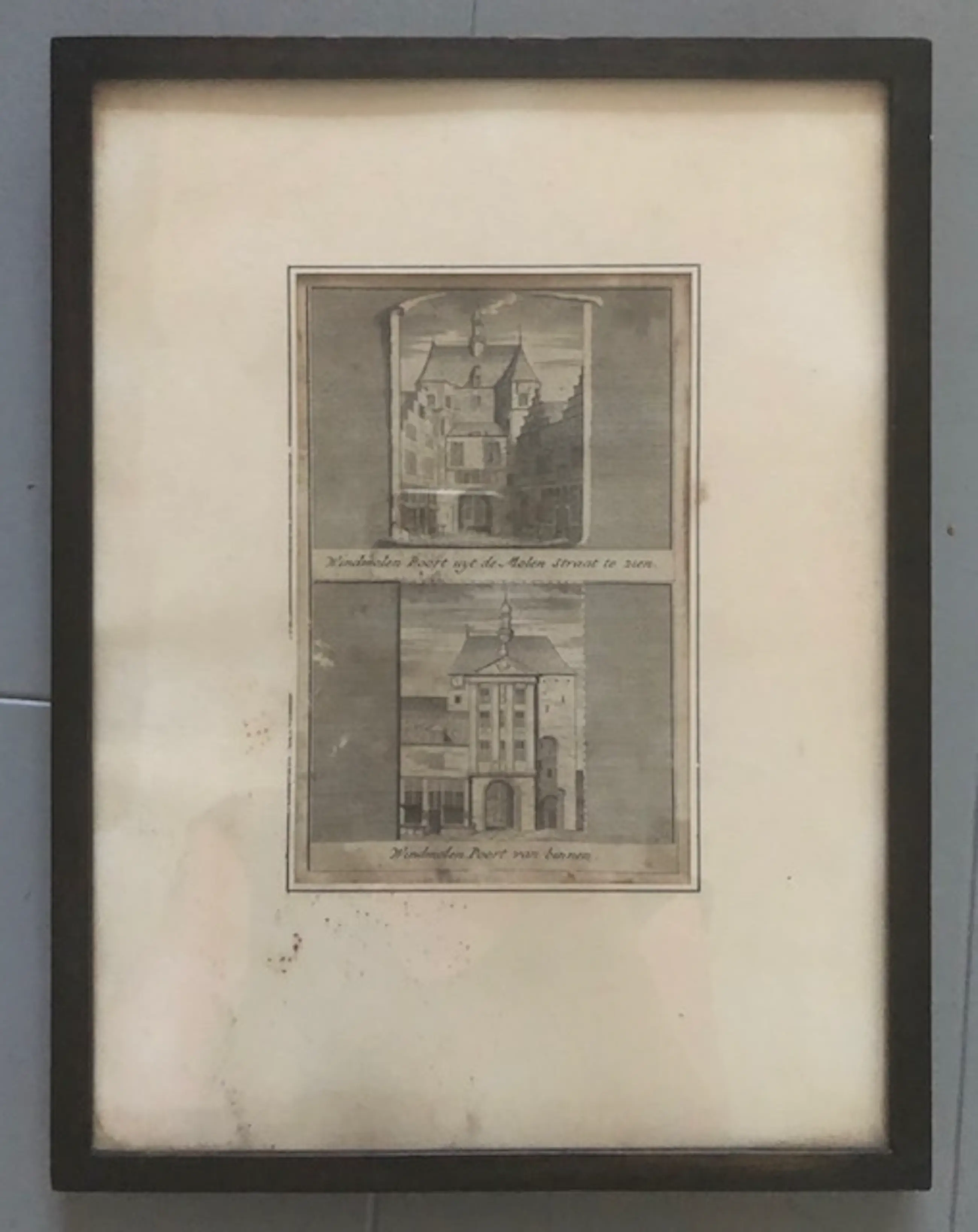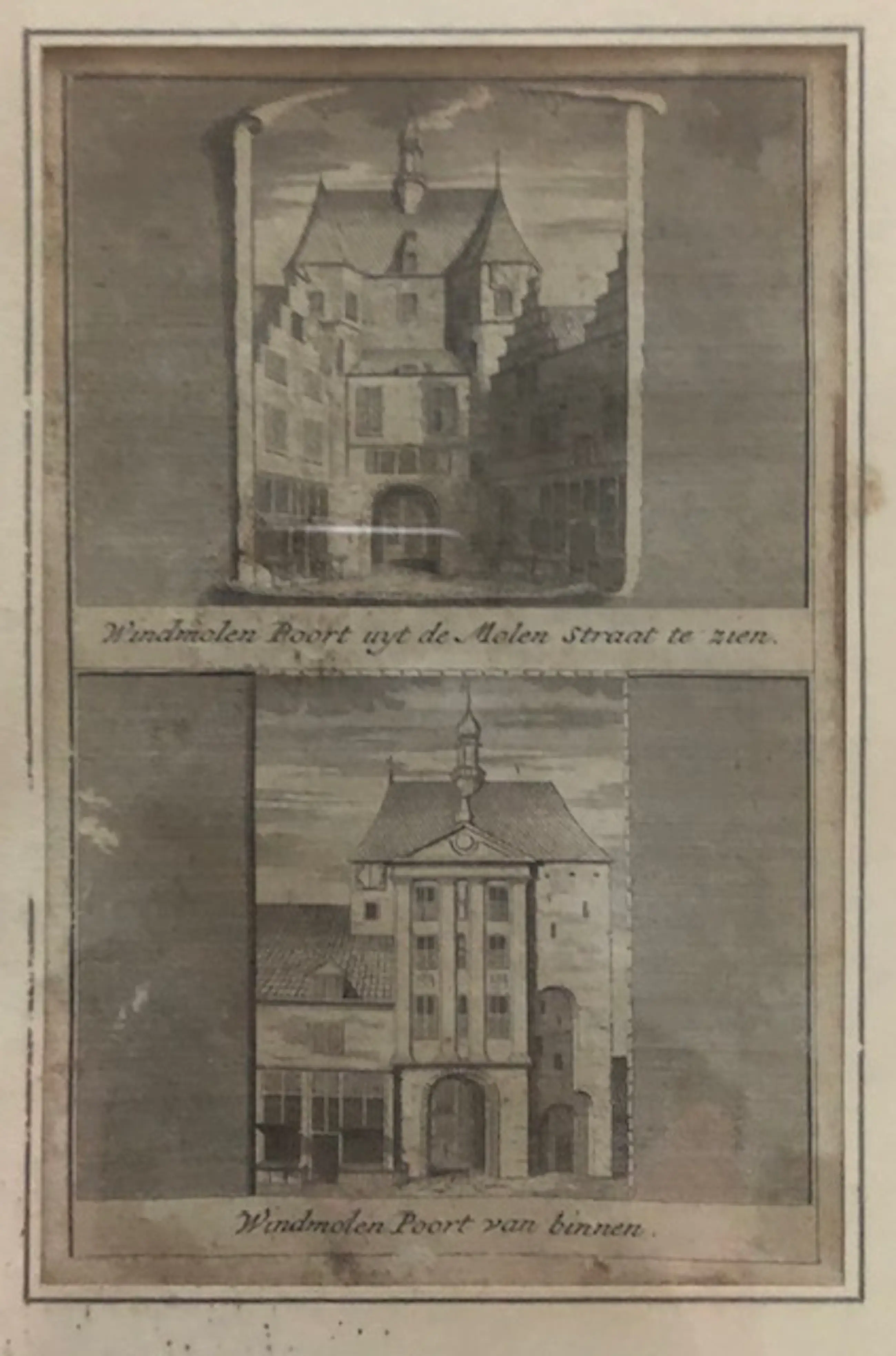 Eén koper gravure van Nijmegen met een tweetal afbeeldingen in 1 gravure, met als titel "Windmolenpoort uyt de Molenstraat gezien/ Windmolenpoort van binnen". Deze is in matige staat. 30 x 23 x 1 cm.