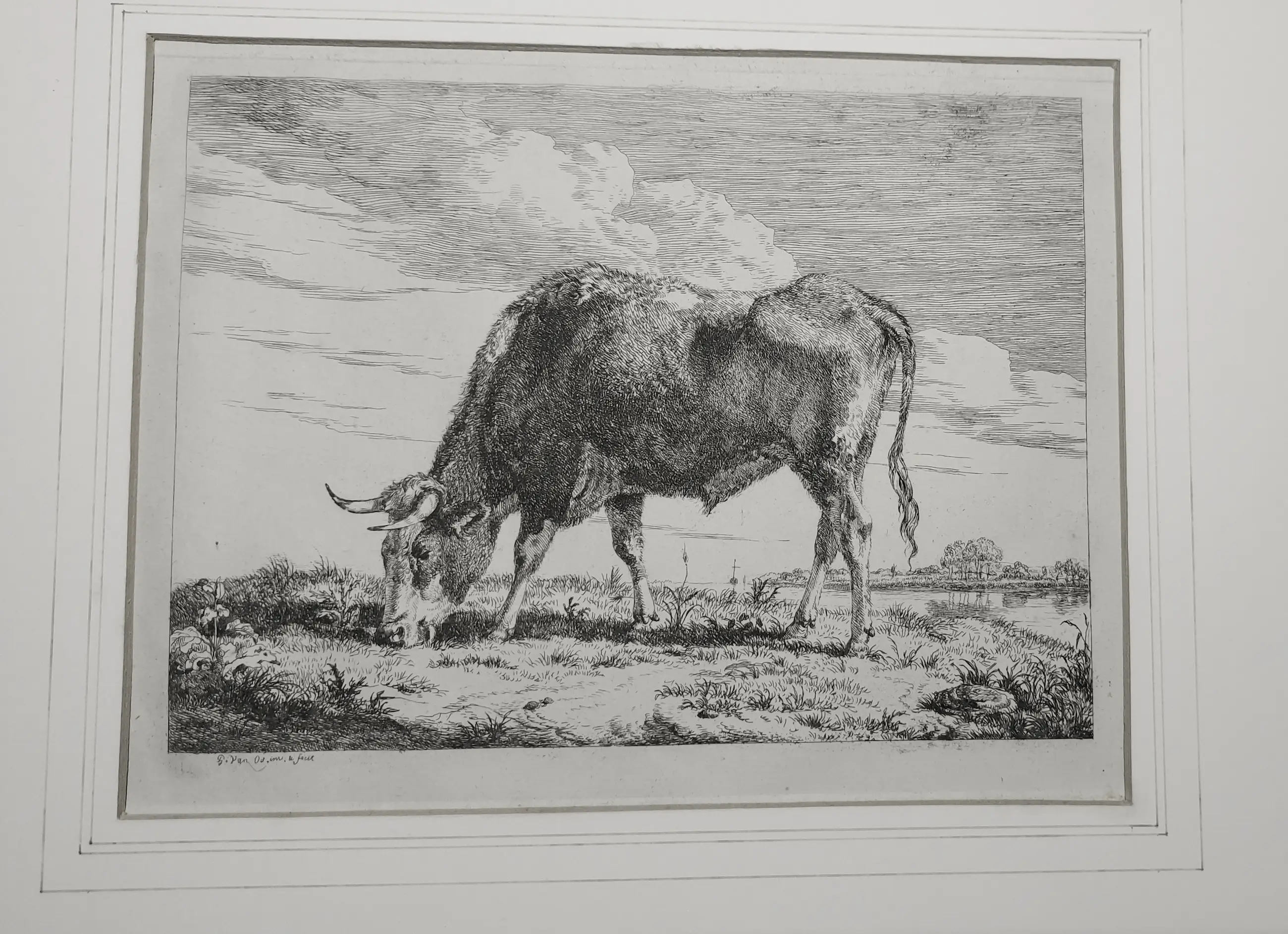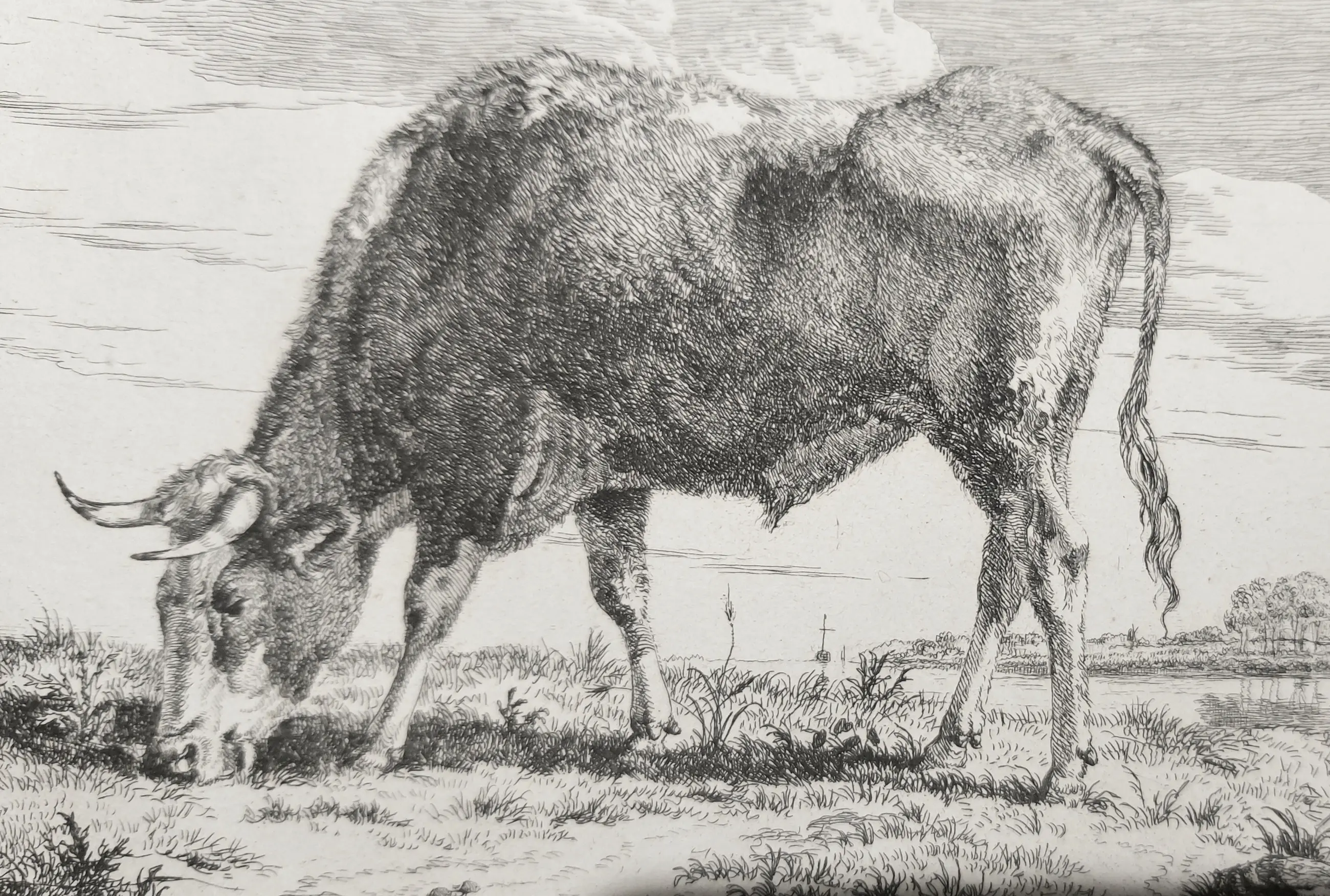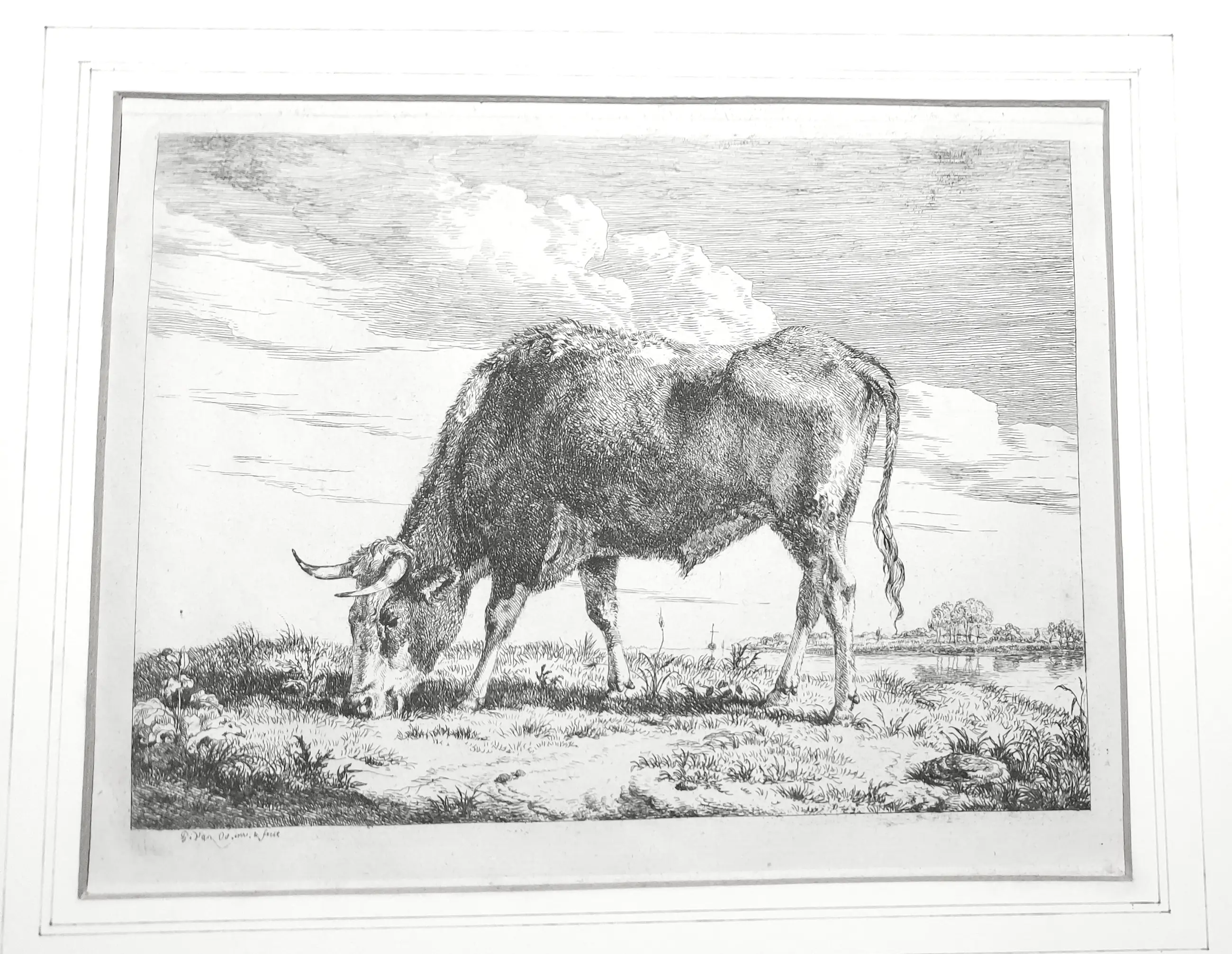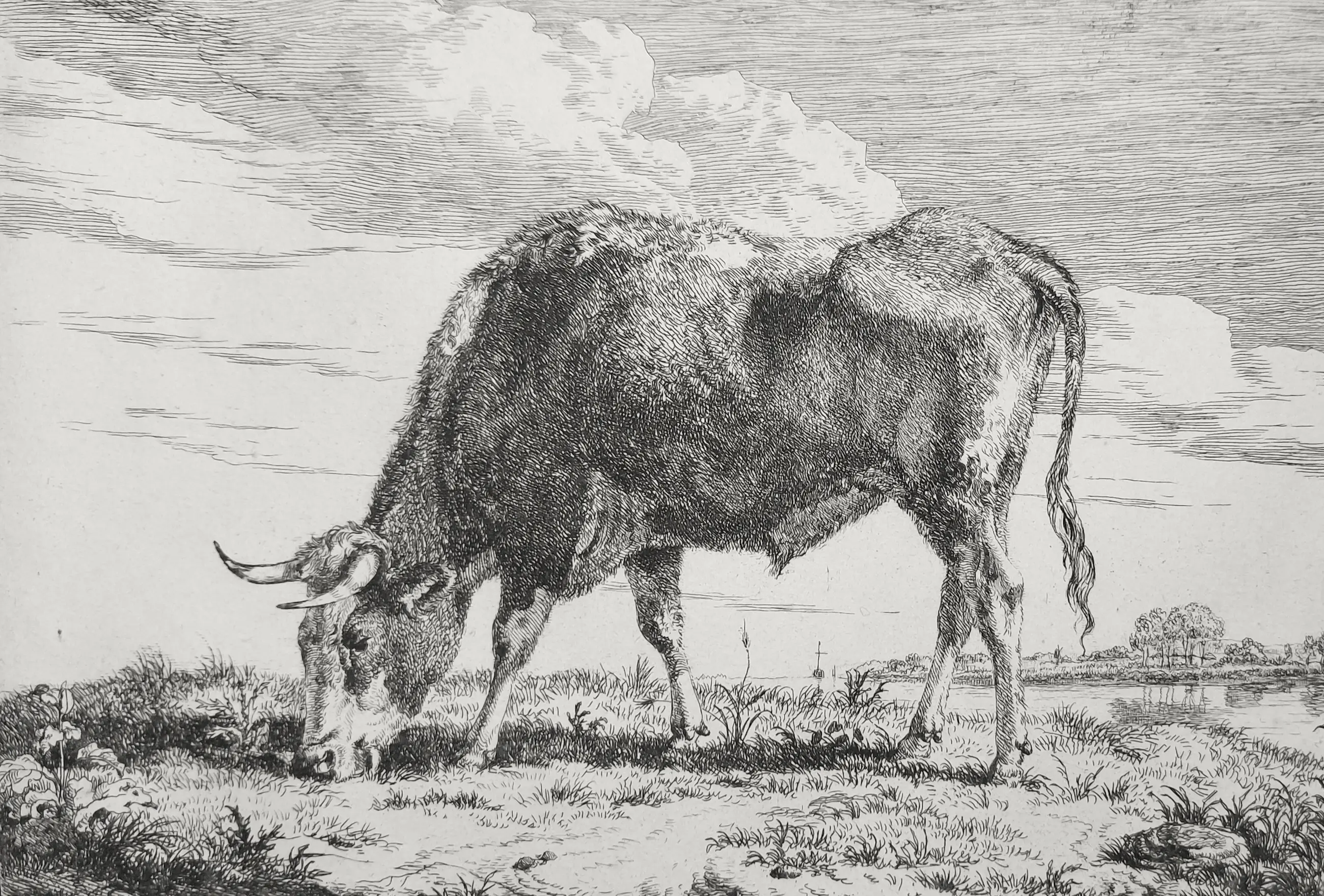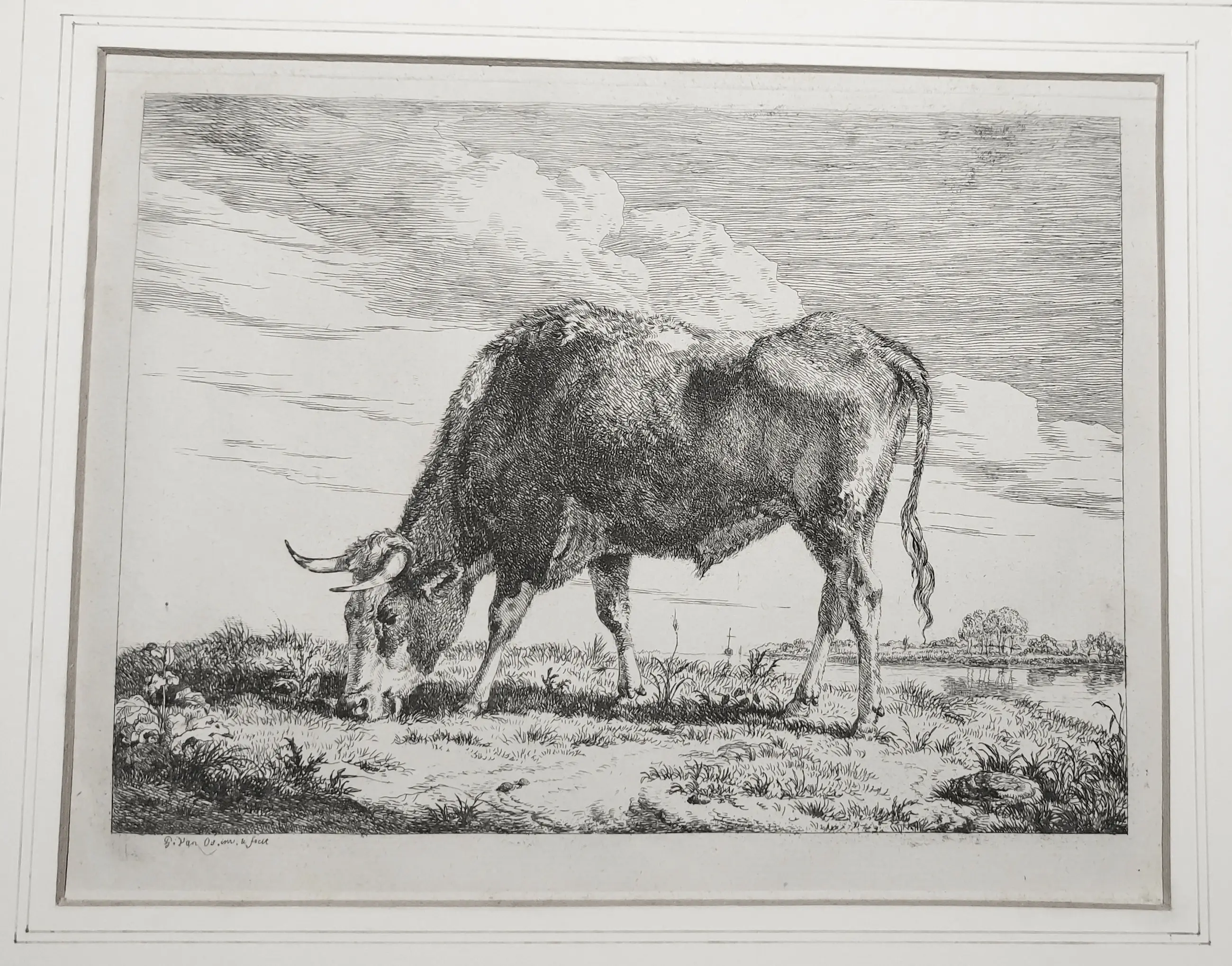 Grazende koe in landschap met rivier en bewolkte lucht. Gesigneerd in de plaat G J va n Os fecit.
