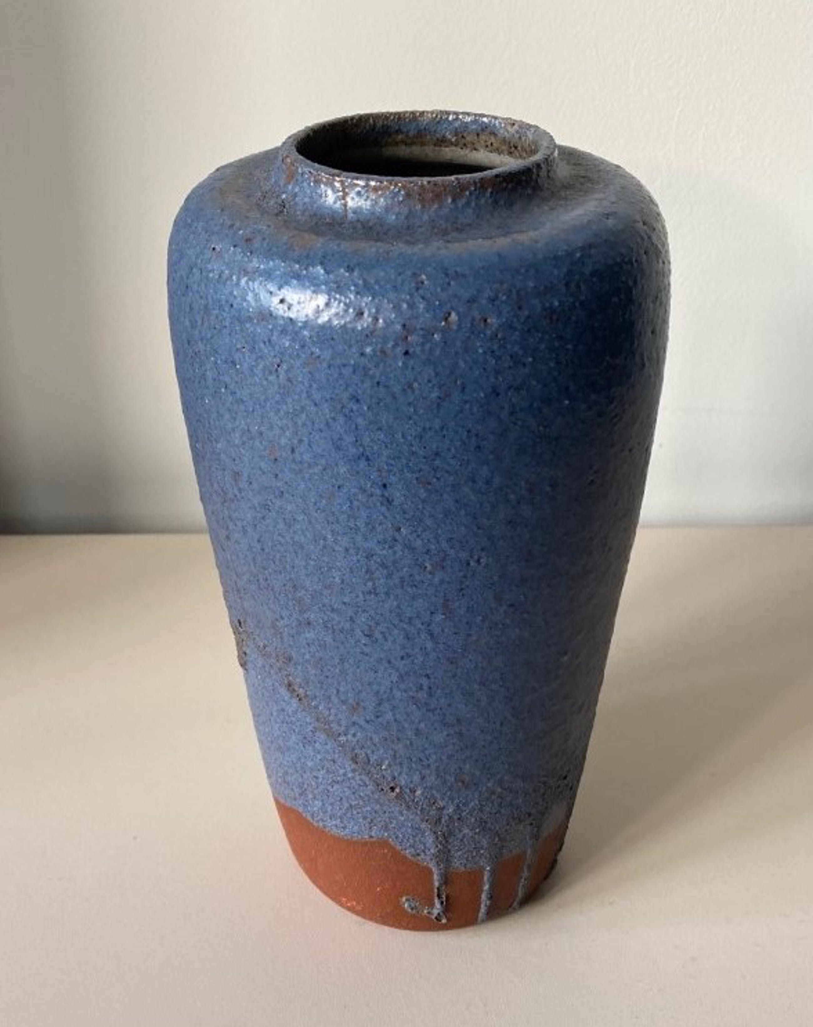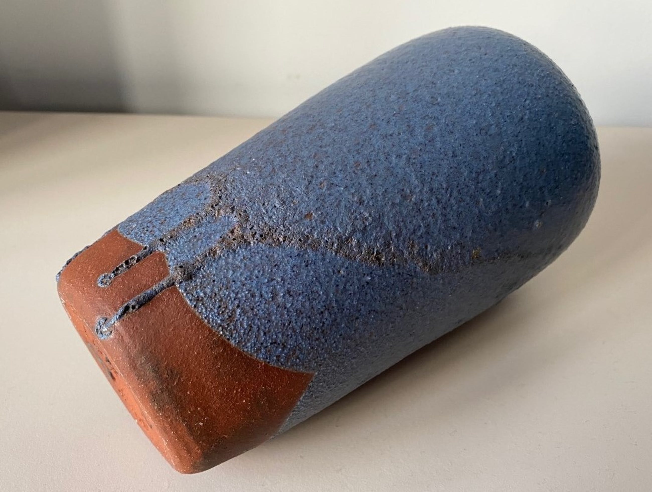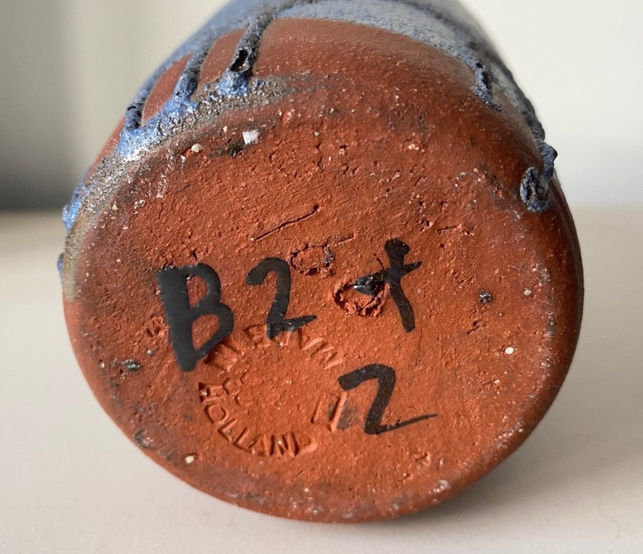 Vaas model 160 met blauw druipglazuur van Pieter Groeneveldt uit Voorschoten. In prima conditie voorzien van ingedrukt blindmerk uit de periode; 1950-1960 en voorzien van ingekrast modenummer 160 en met zwarte verf de letters; B2 + 2.