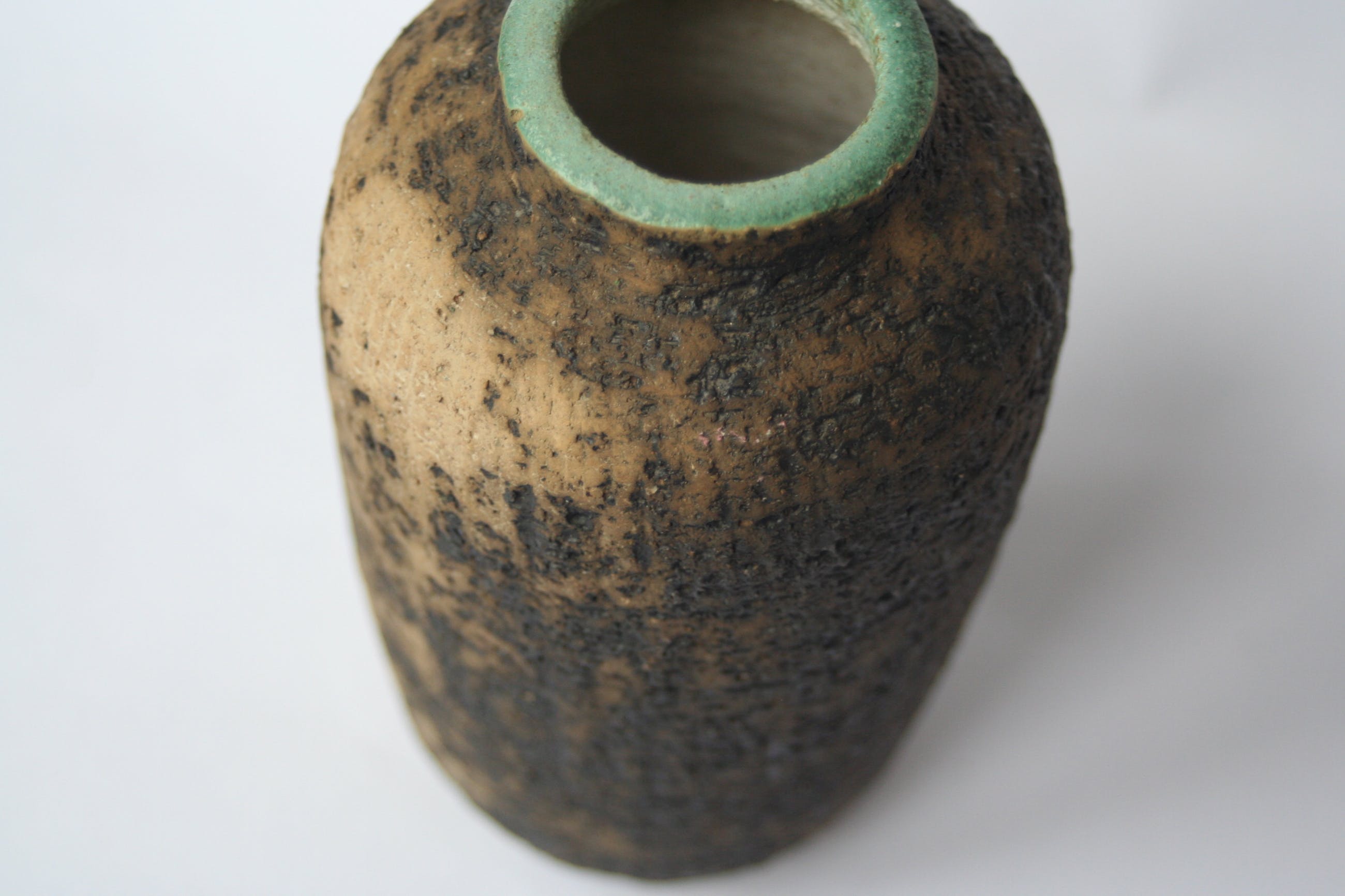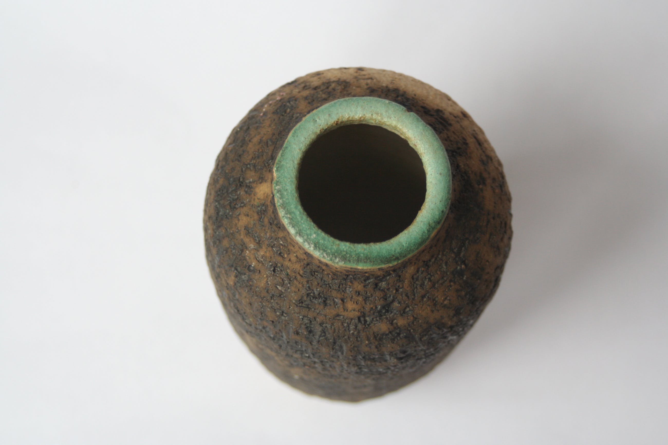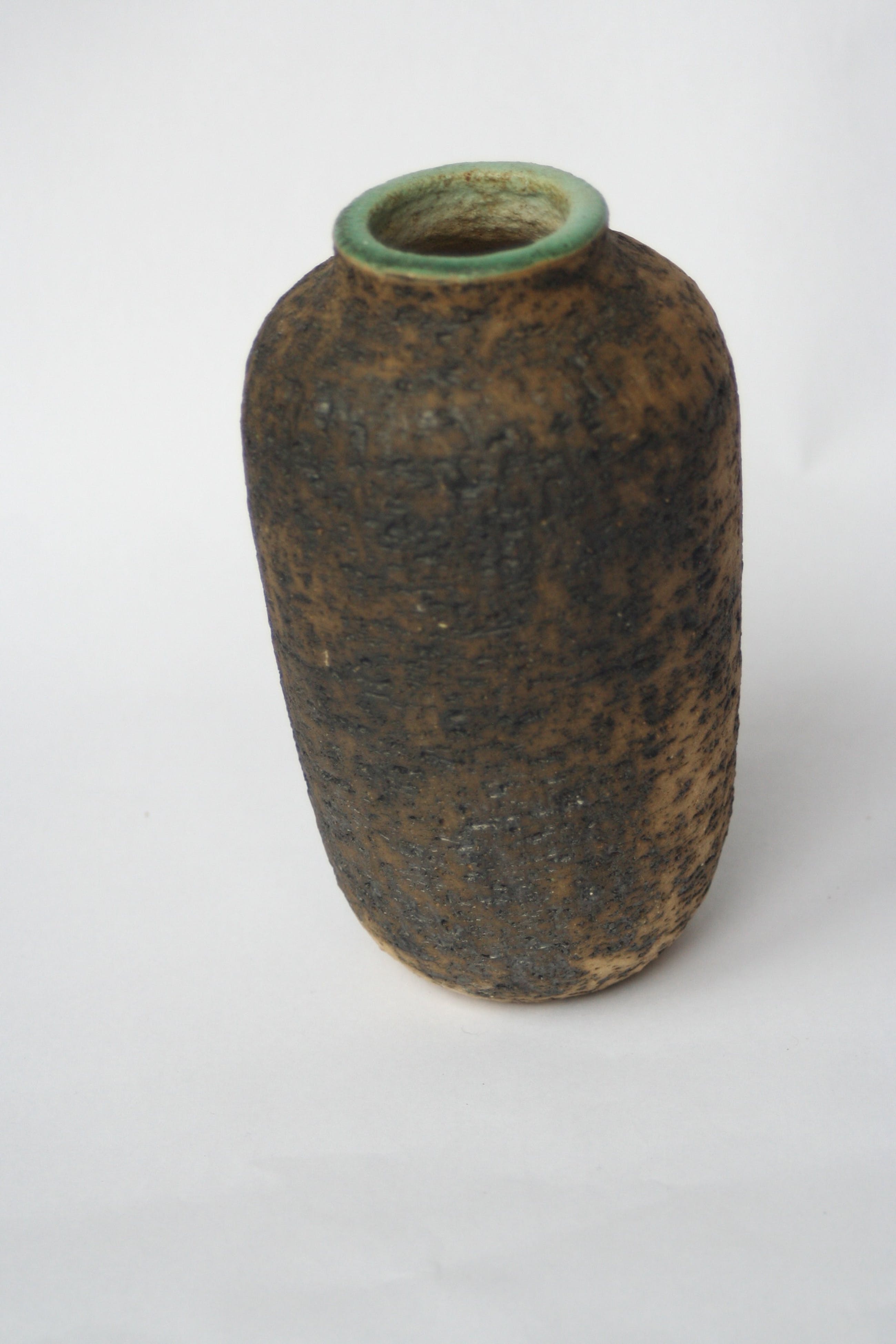 Handgedraaid vaasje met zogenaamd berkenbast decoratie, een grove matkleurige structuur. Voor conditie zie omschrijving. Gesigneerd met stempel Pieter Groeneveldt, rond, met tekst made in Holland.