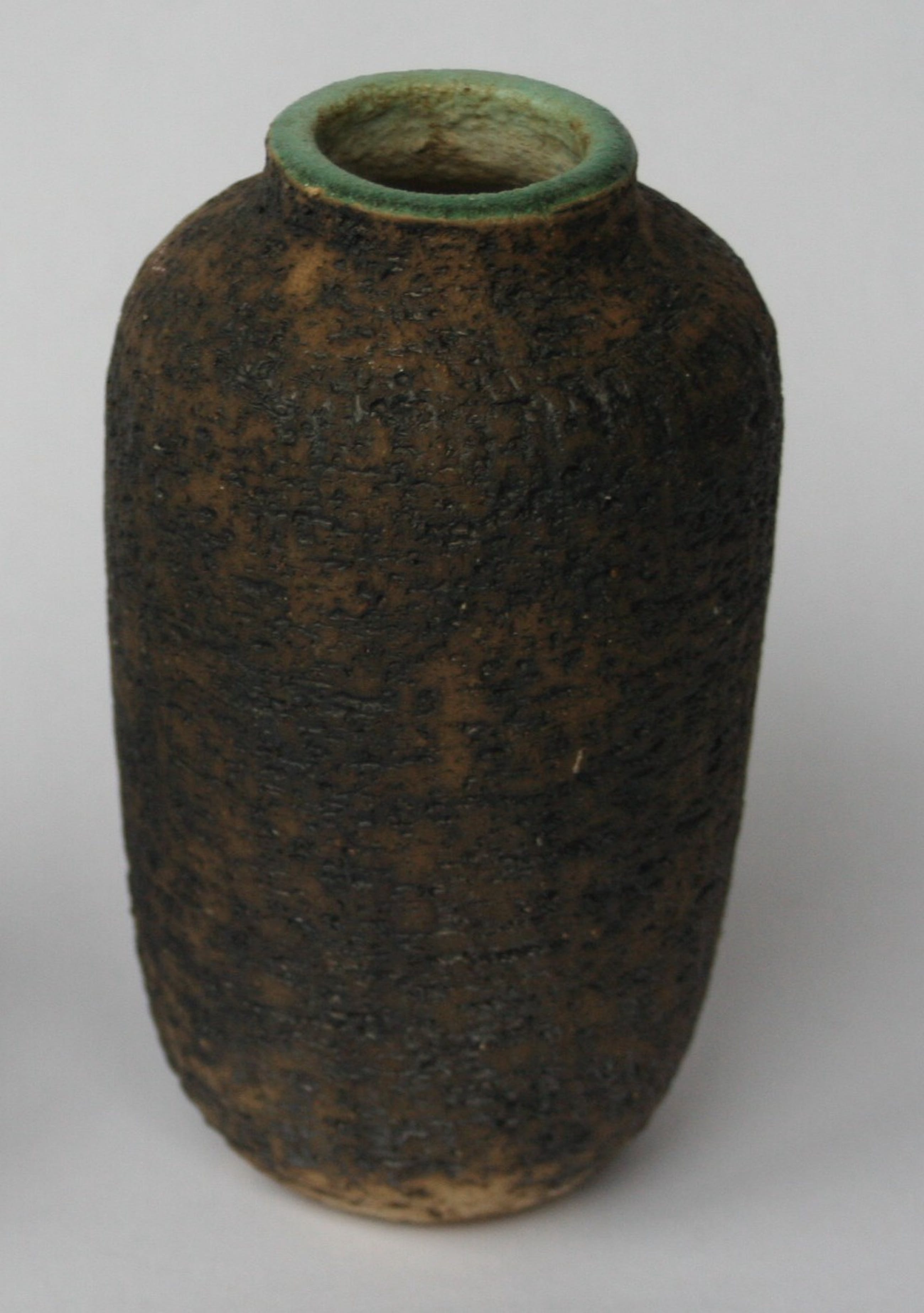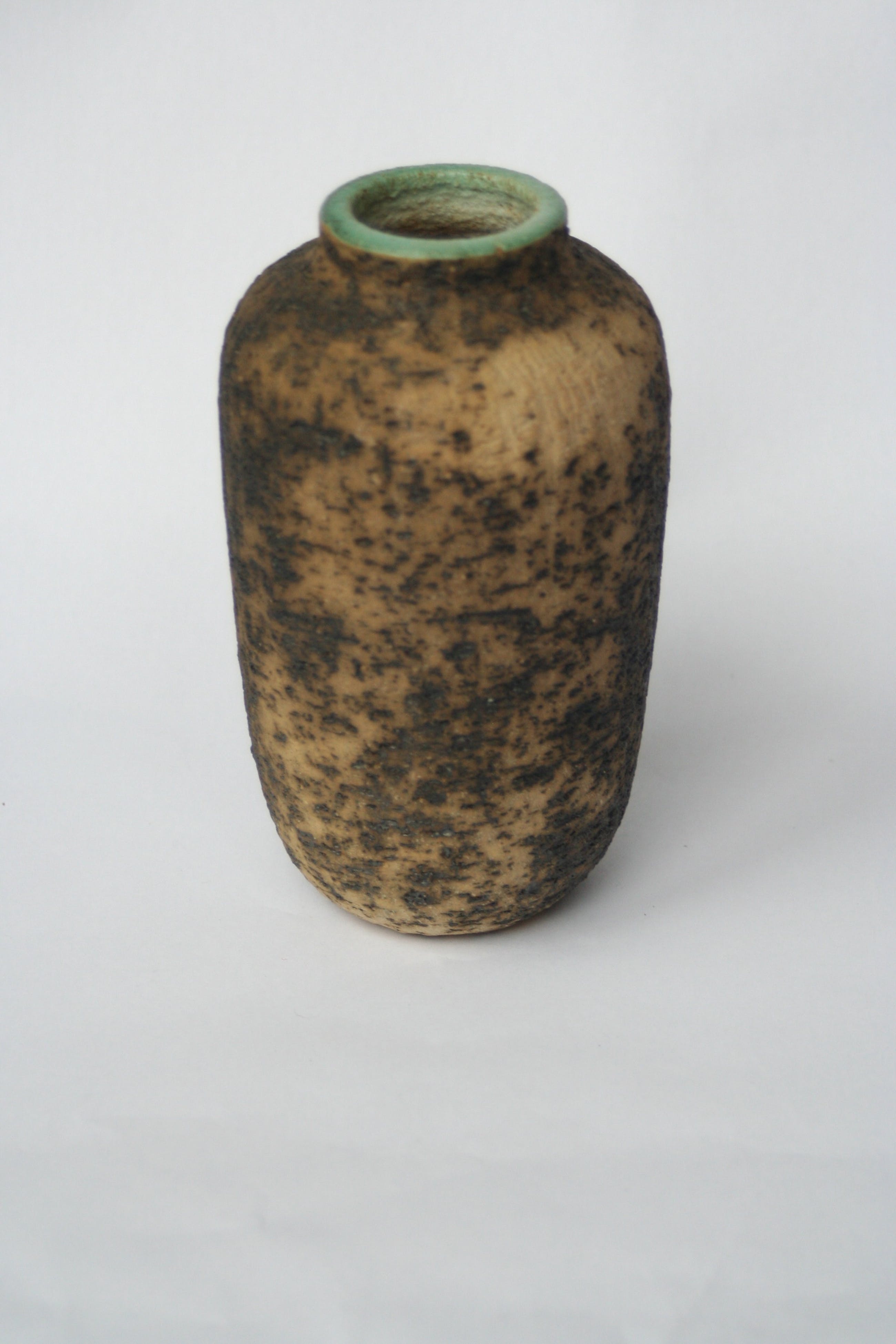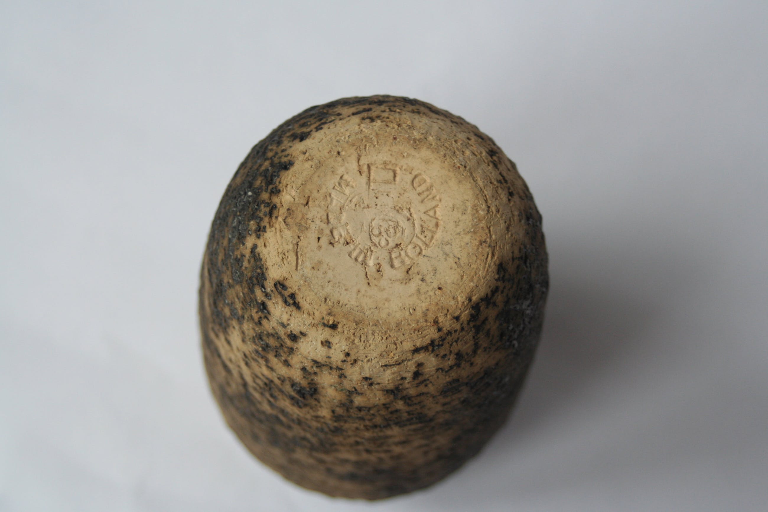Handgedraaid vaasje met zogenaamd berkenbast decoratie, een grove matkleurige structuur. Voor conditie zie omschrijving. Gesigneerd met stempel Pieter Groeneveldt, rond, met tekst made in Holland.
