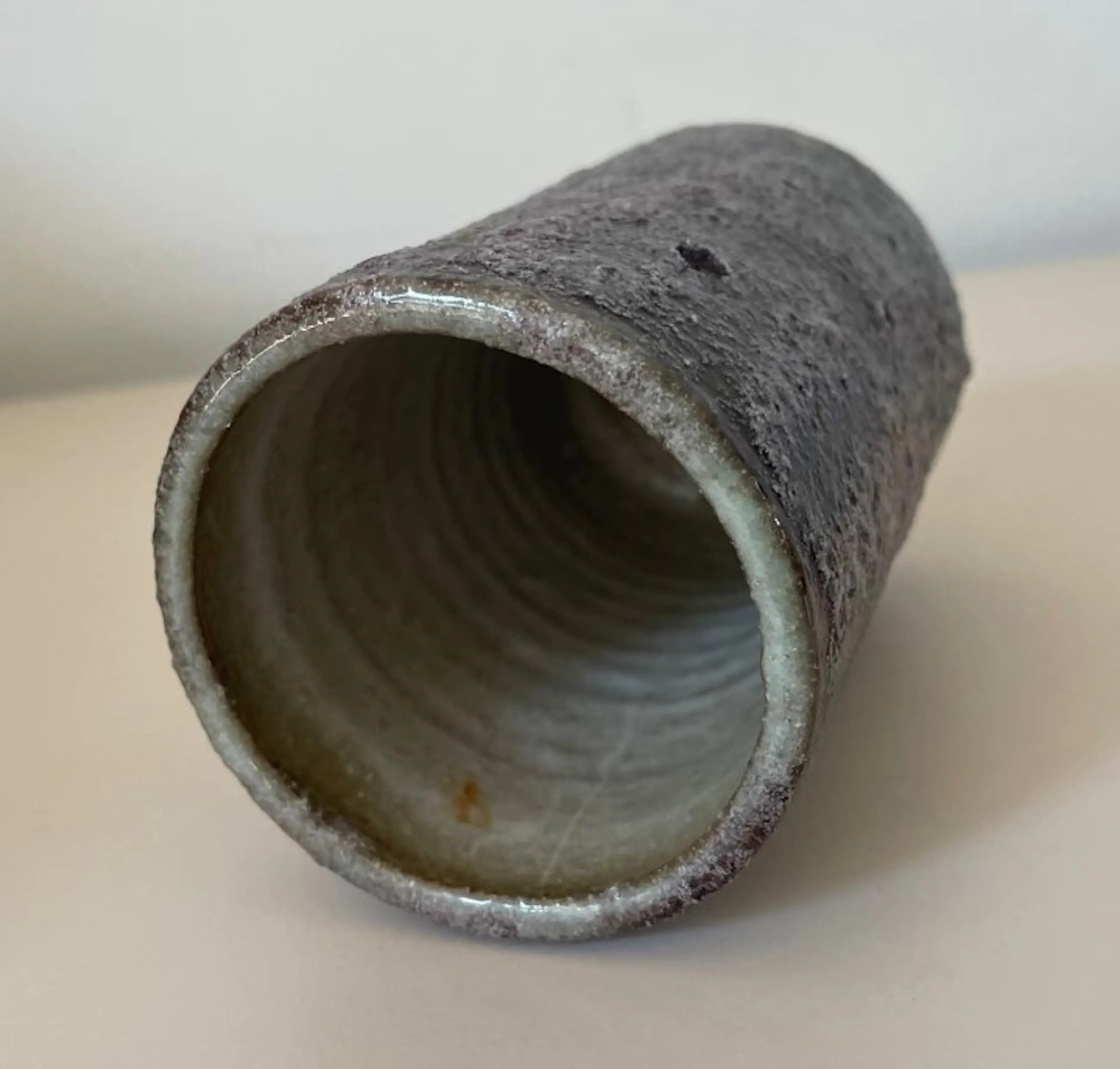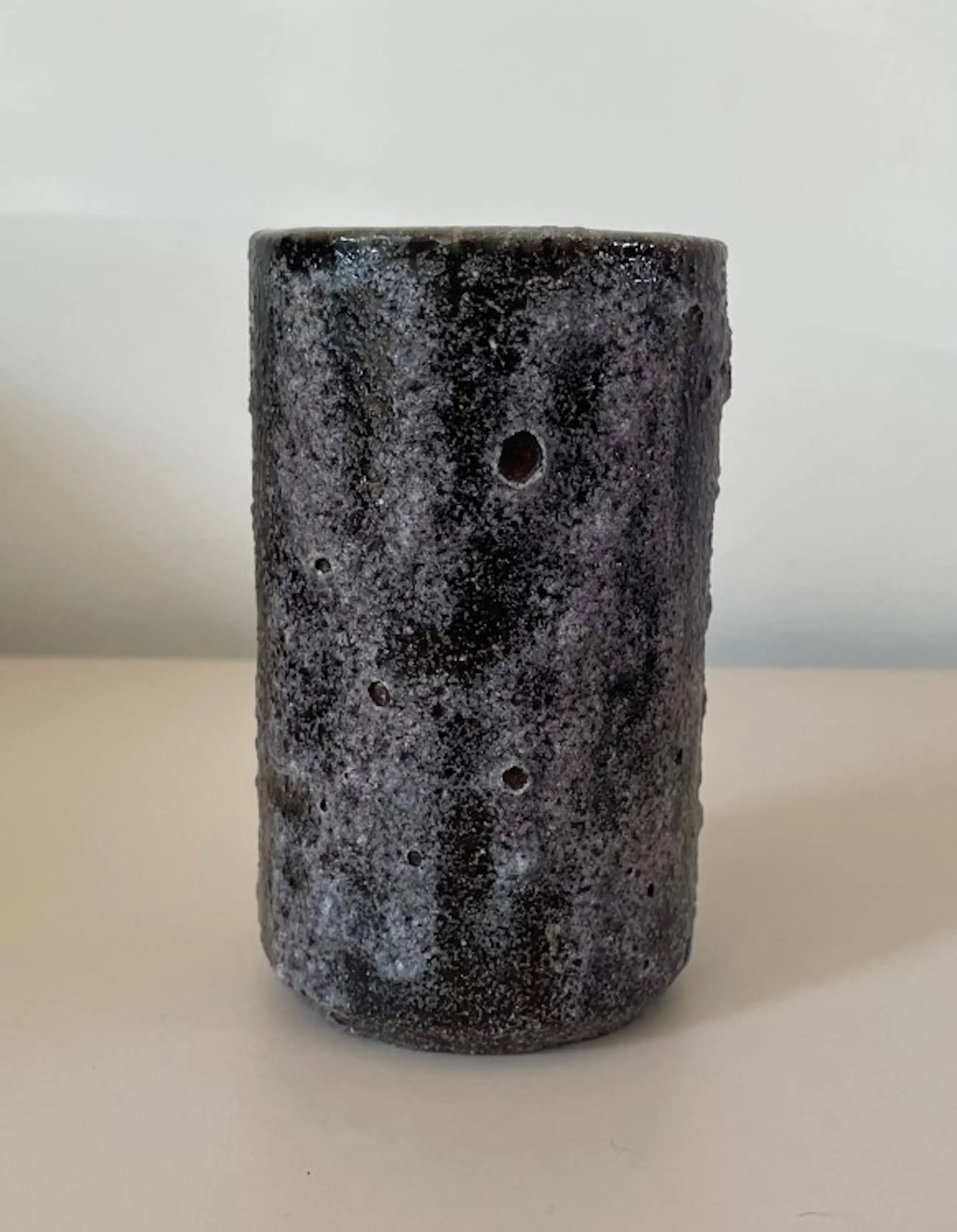 Vintage paars aardewerk vaasje voorzien van bruisglazuur - model 104/11 uitgevoerd bij Pieter Groeneveldt in Voorschoten. In onbeschadigde conditie. Gemerkt aan de onderzijde met ingedrukt blindmerk PG en modelnummer.