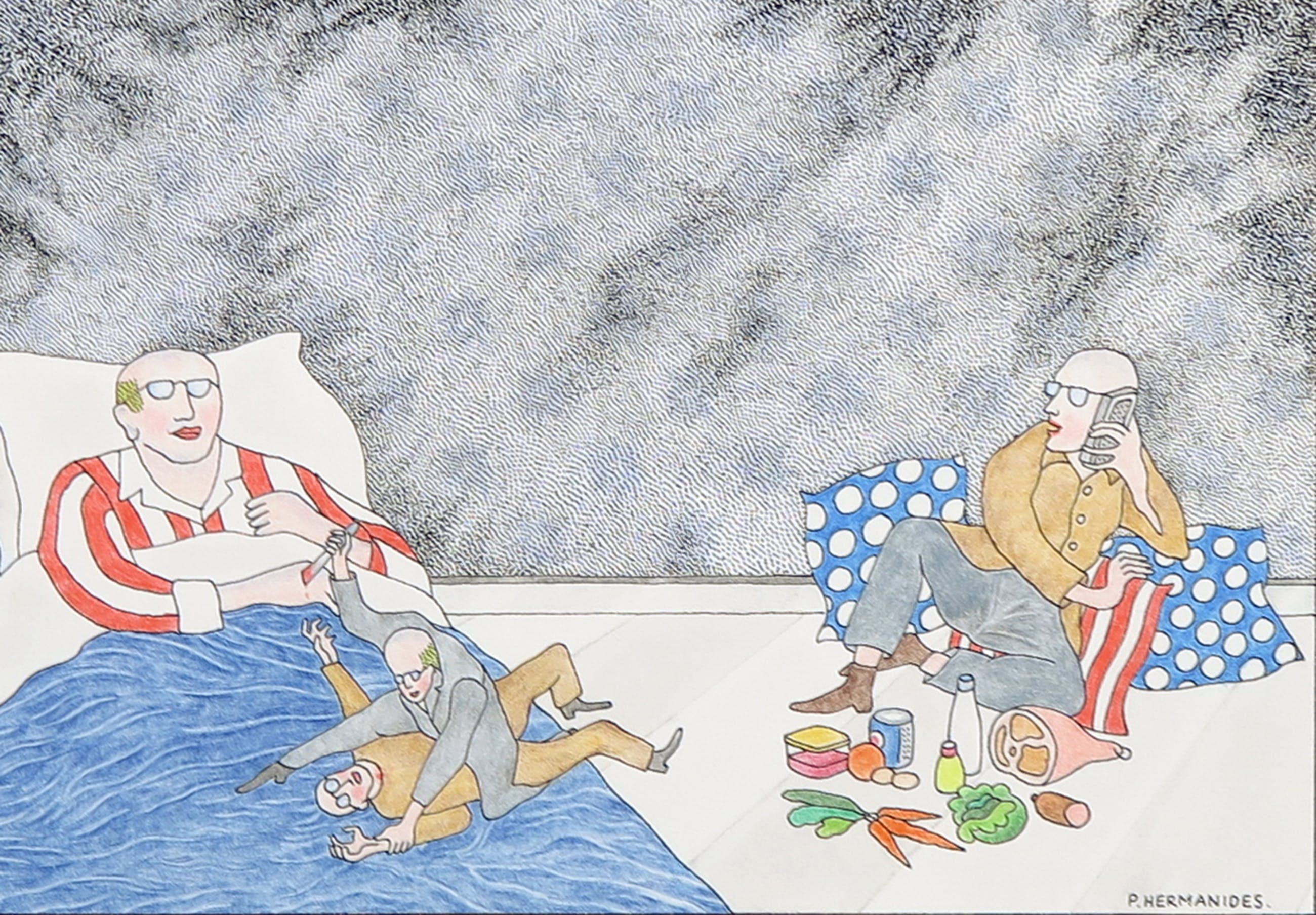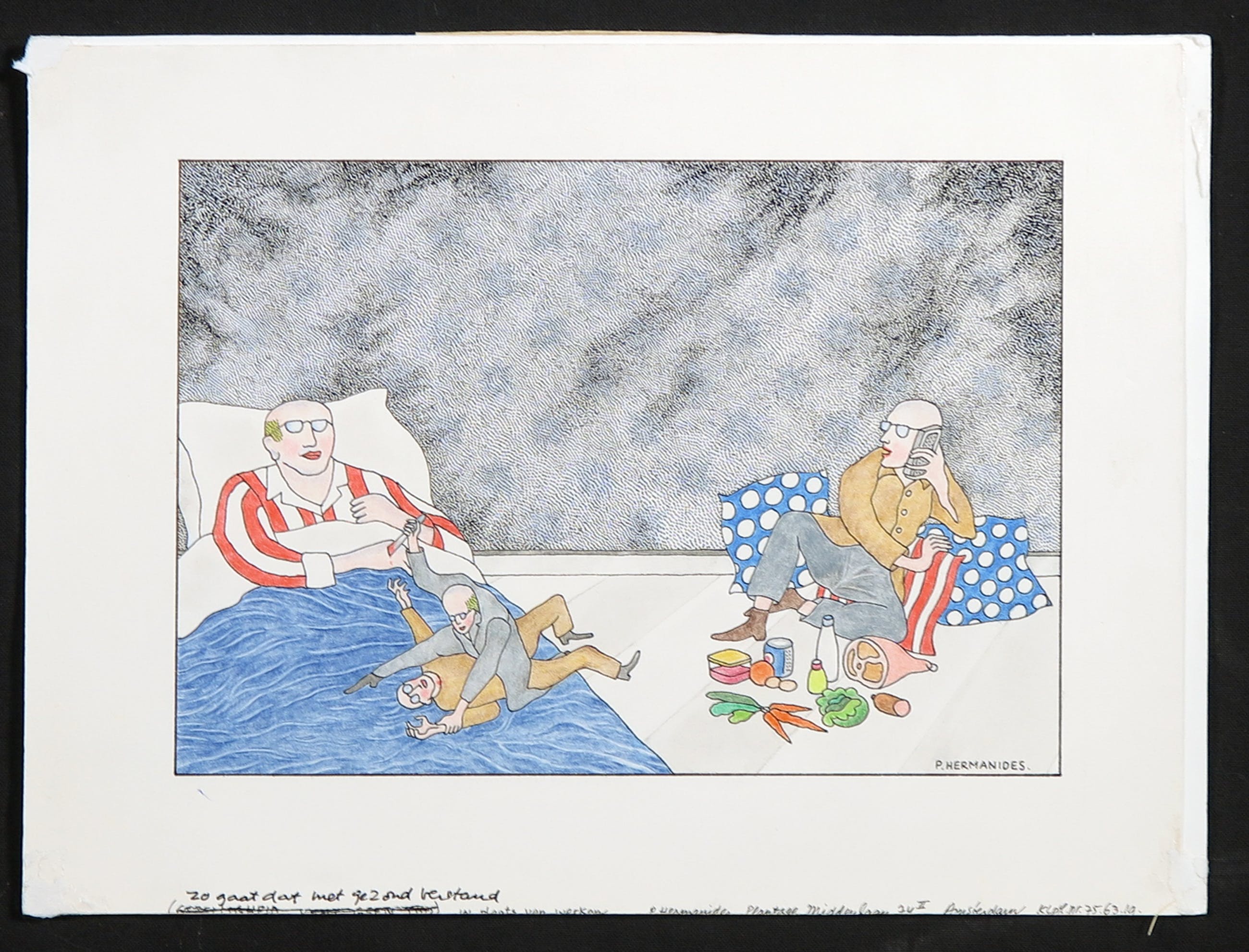 Het lijkt er op dat de basis van de tekening is gedrukt als lithografie, en de voorstelling vervolgens met pen en inkt en (kleur)potlood is uitgewerkt en ingekleurd.