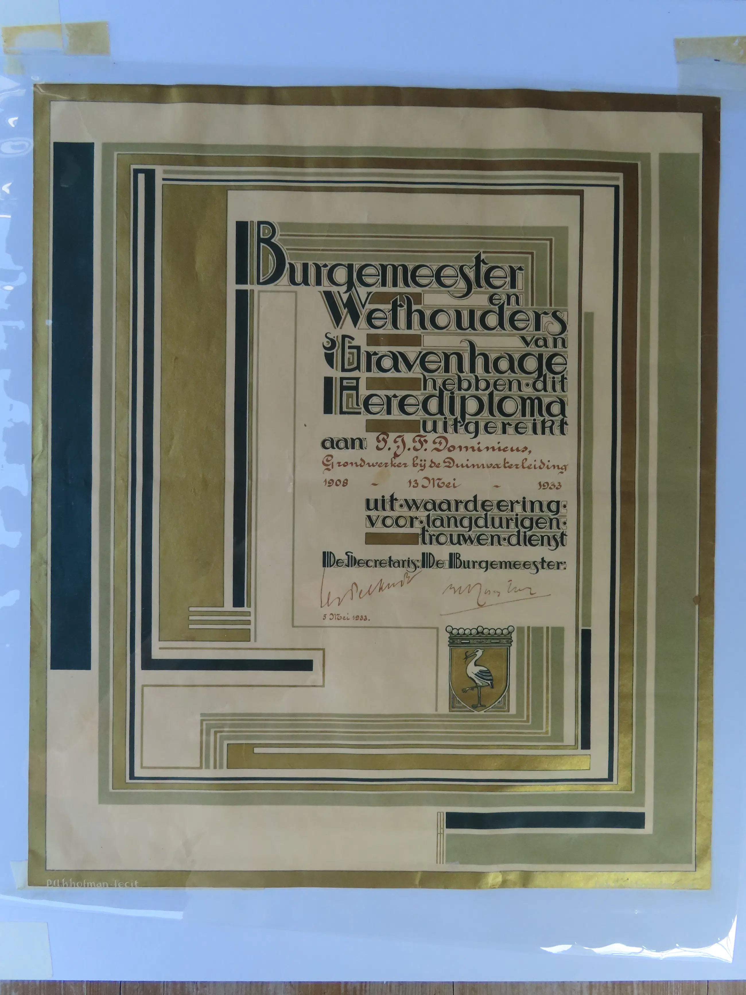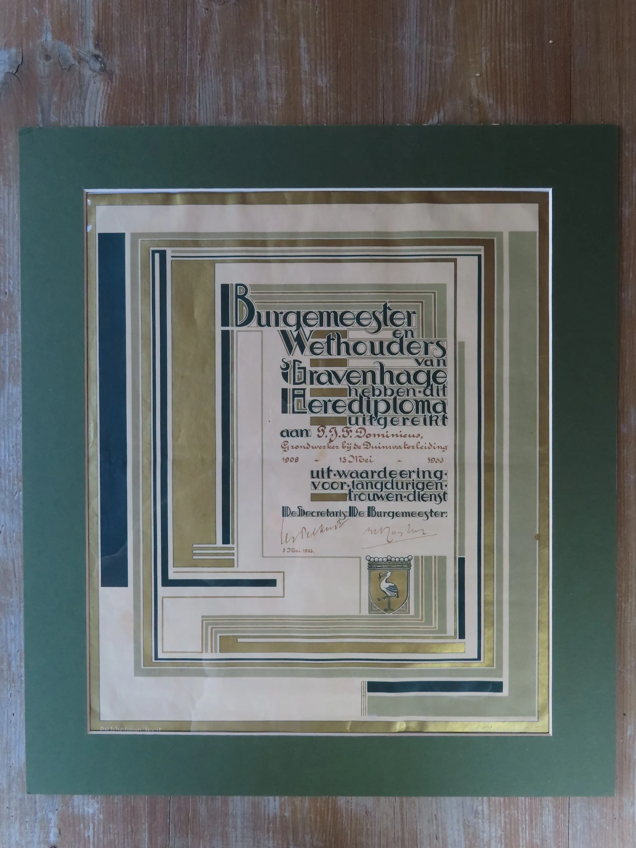 Uitgereikt aan dhr. Dominicus in 1933. Prachtig en zeldzaam ontwerp van P.A.H. Hofman.