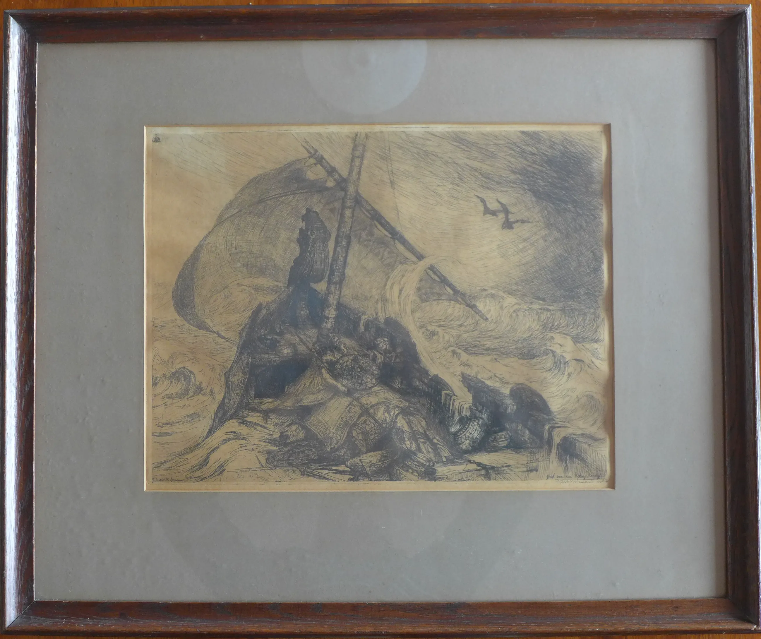 Overleden Viking koning op drakenschip met grafbijgaven. Wilde zee, donkere lucht. Wegvliegende vogels: betekenis mij niet geheel duidelijk.