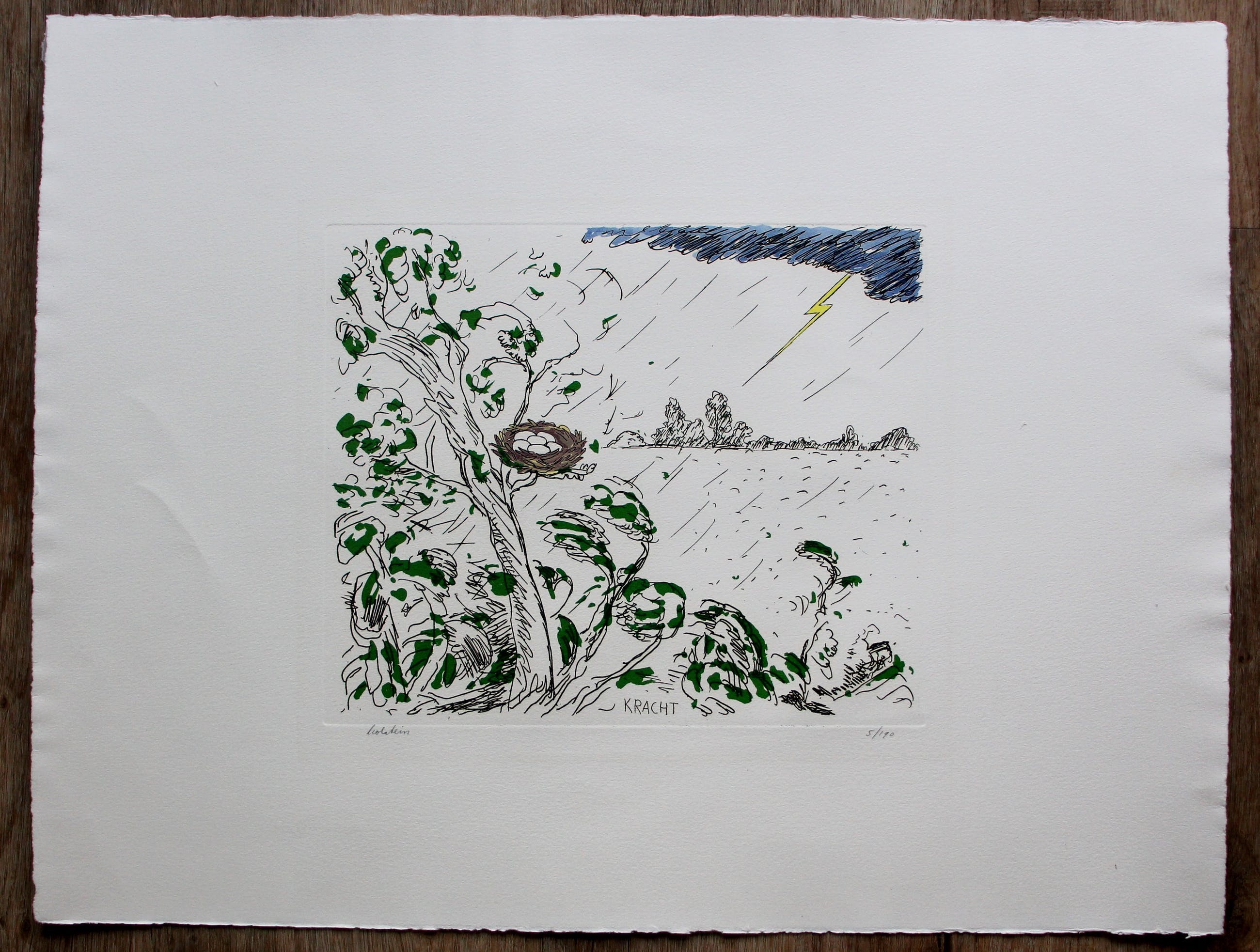 Met de hand ingekleurde ets van Pieter Holstein. Titel: Kracht. Nummer: 5/190. Het werk is linksonderaan gesigneerd door de kunstenaar. De authenticiteit van het, aangeboden, werk wordt volledig gegarandeerd. Een certificaat van echtheid kan, op aanvraag, worden gemaild.