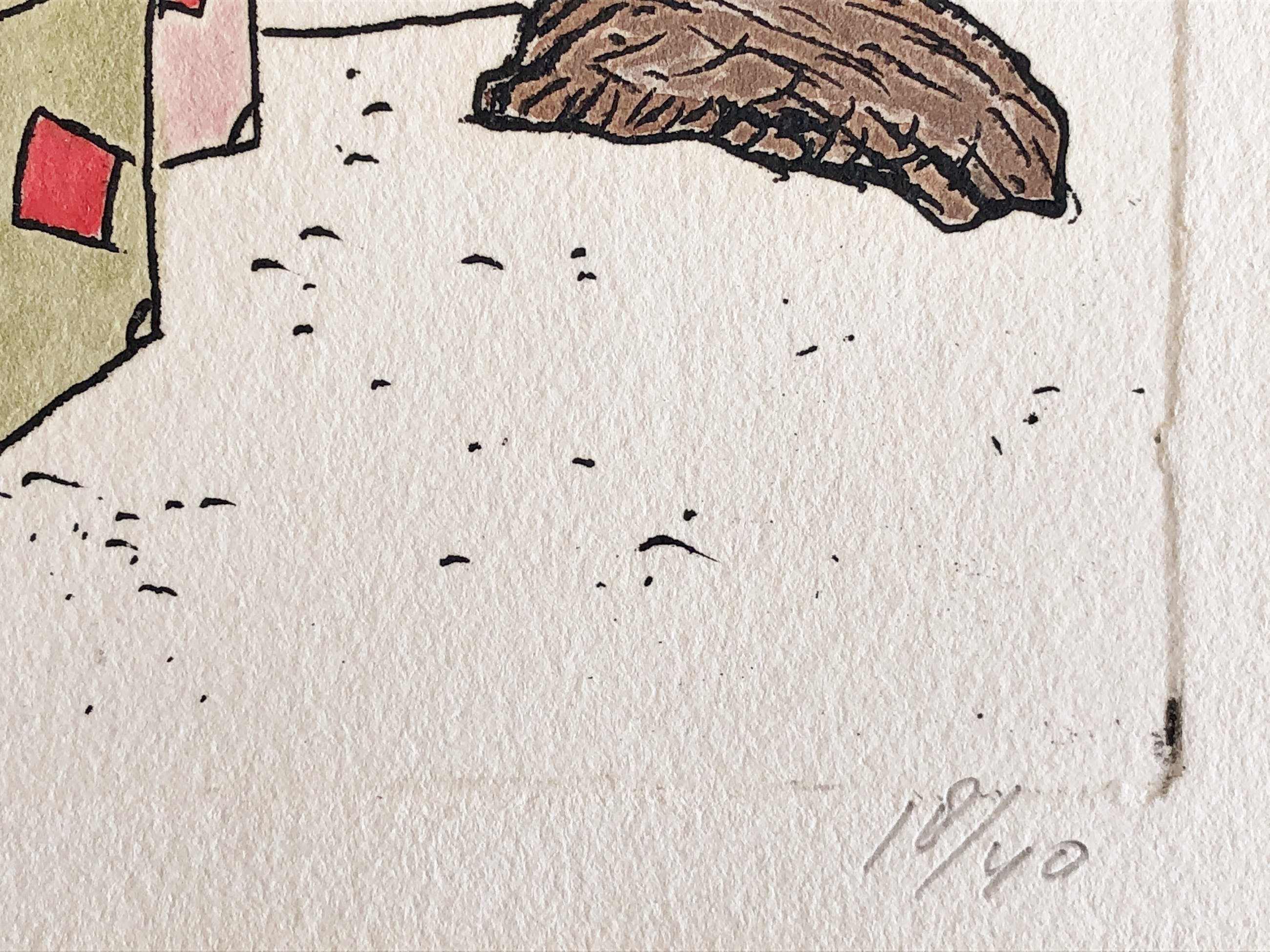 Formaat beeld 21x27,5 cm, etspapier 32x38 cm. Het werk is los gehecht, met een