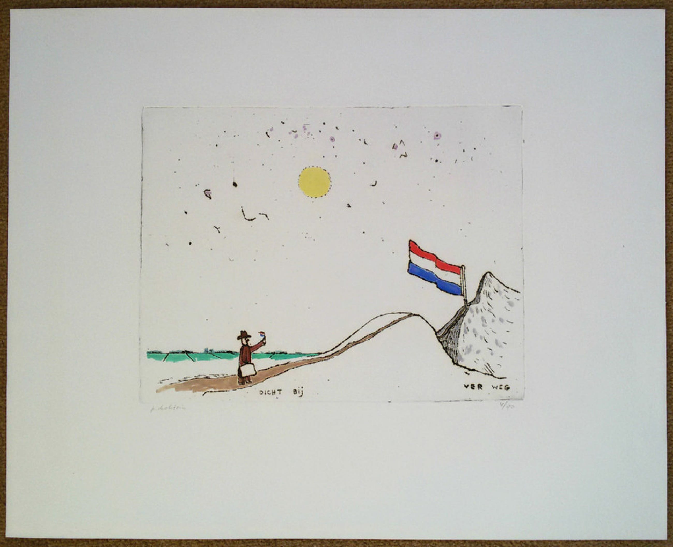 Mooie, met de hand ingekleurde ets van Pieter Holstein. Met potlood gesigneerd en genummerd (4/90). Nooit ingelijst geweest, in uitstekende staat.