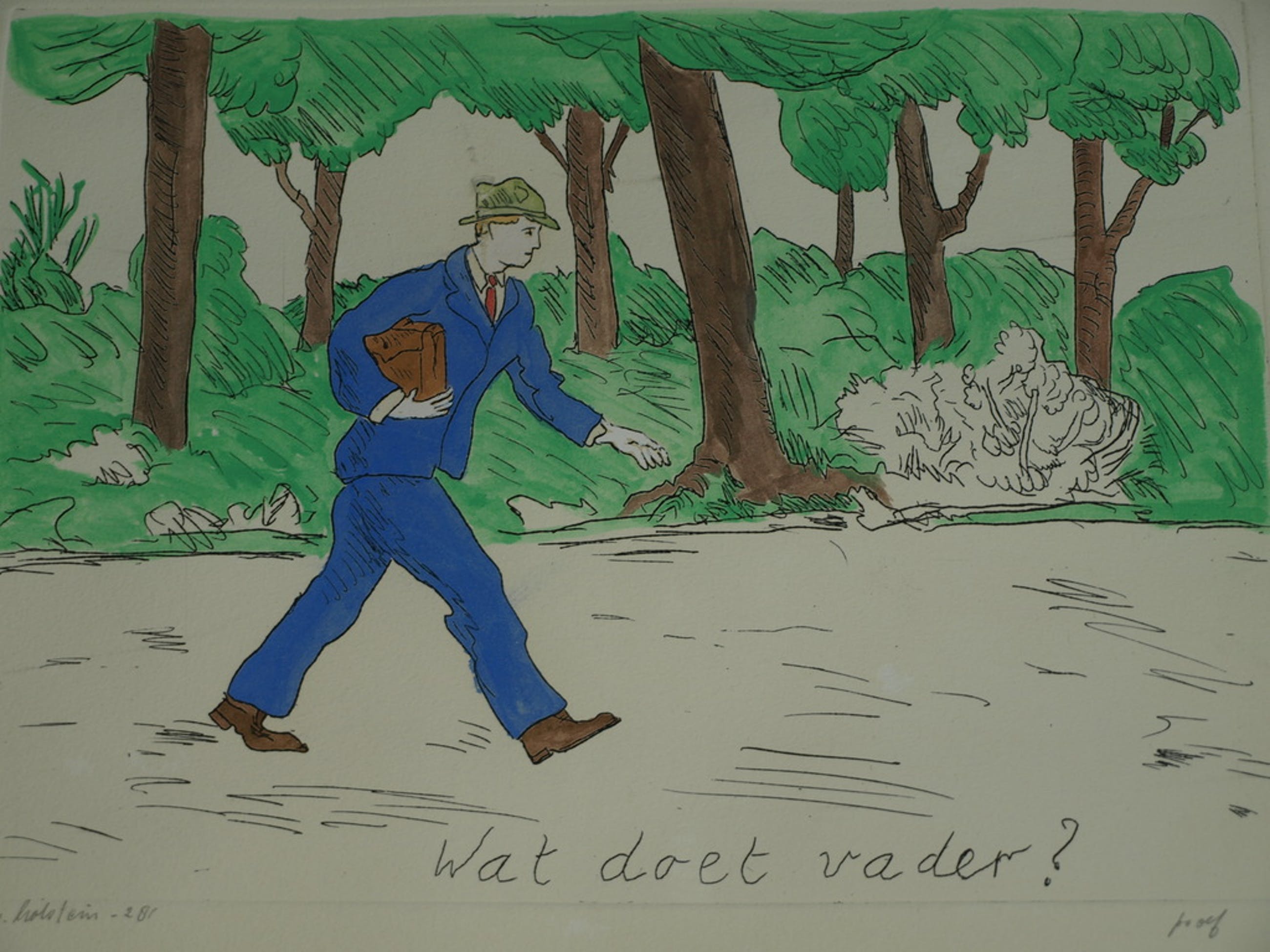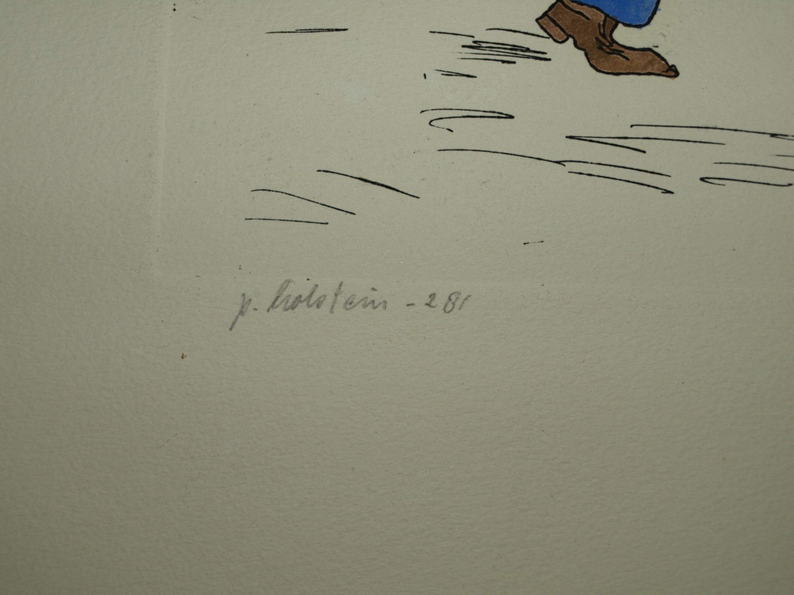 Een ingekleurde ets van de kunstenaar Pieter Holstein uit ca 1975. Het betreft hier een ‘proefdruk’ van de kunstenaar.