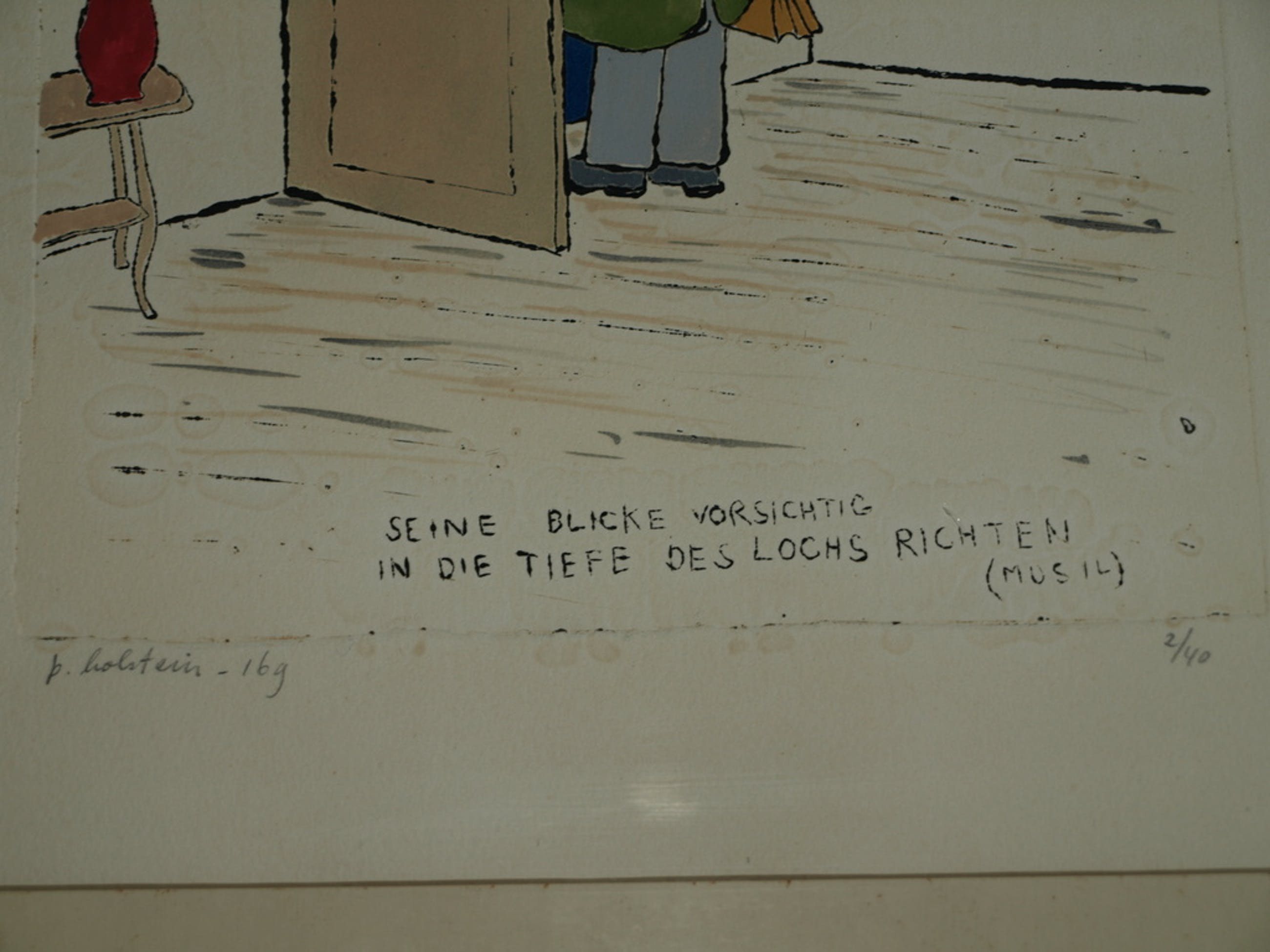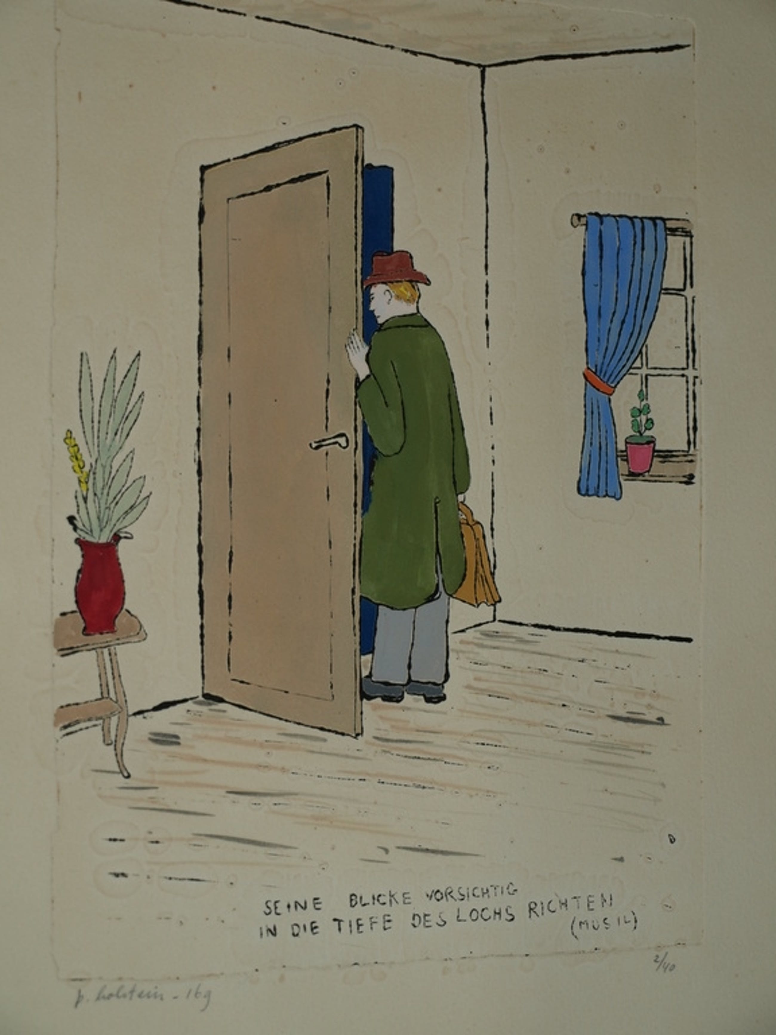 Titel: “Seine Blicke vorsichtig in die Tiefe des Lochs richten (musil)”. De titel staat handgeschreven middenonder.