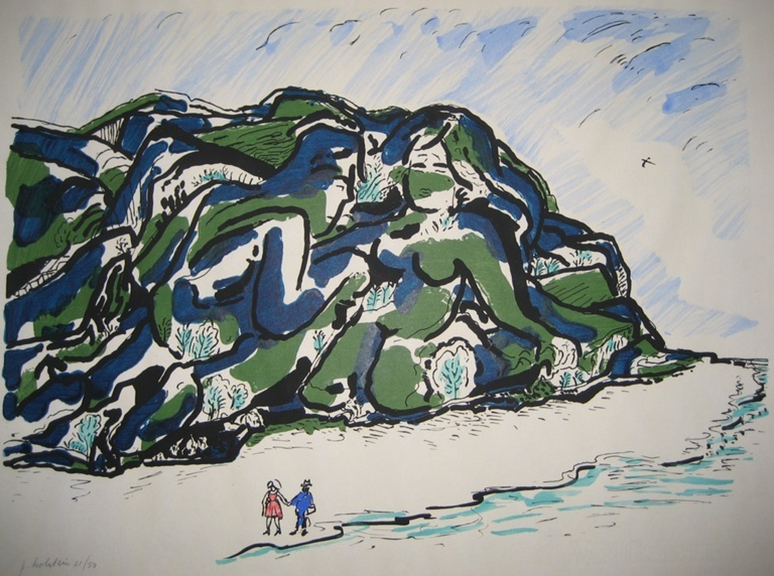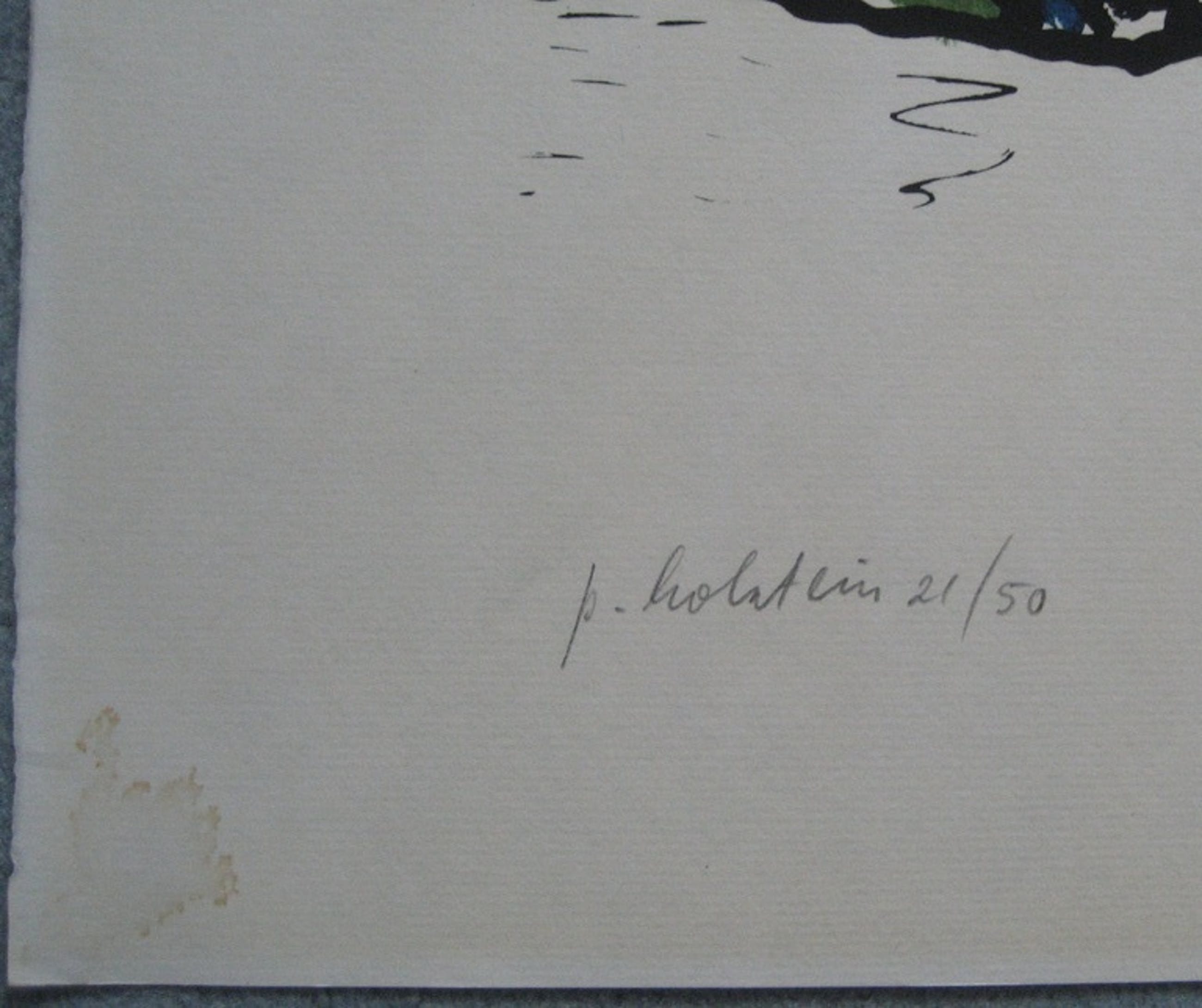 Speelse litho van Pieter Holstein, met de hand ingekleurd. Het werk is afgedrukt op Van Gelder Papier en meet 50 x 65 cm. Met potlood is het werk linksonder voorzien van signatuur en oplagenummer (21/50). Een titel of jaartal is niet vermeld. Het werk is in goede conditie. Er is een watervlekje aan de onderkant (zie foto), dat achter een passepartout niet zichtbaar is.