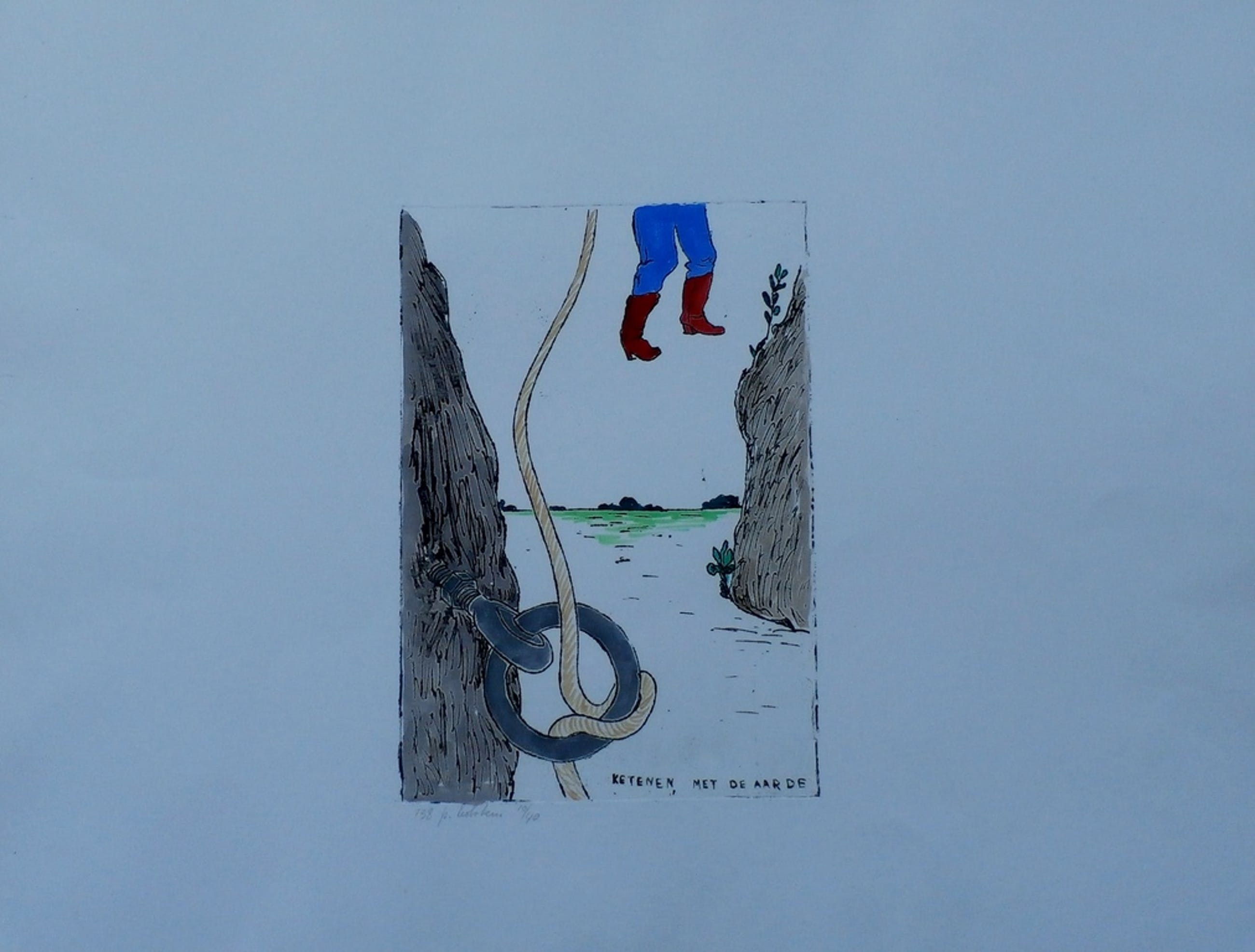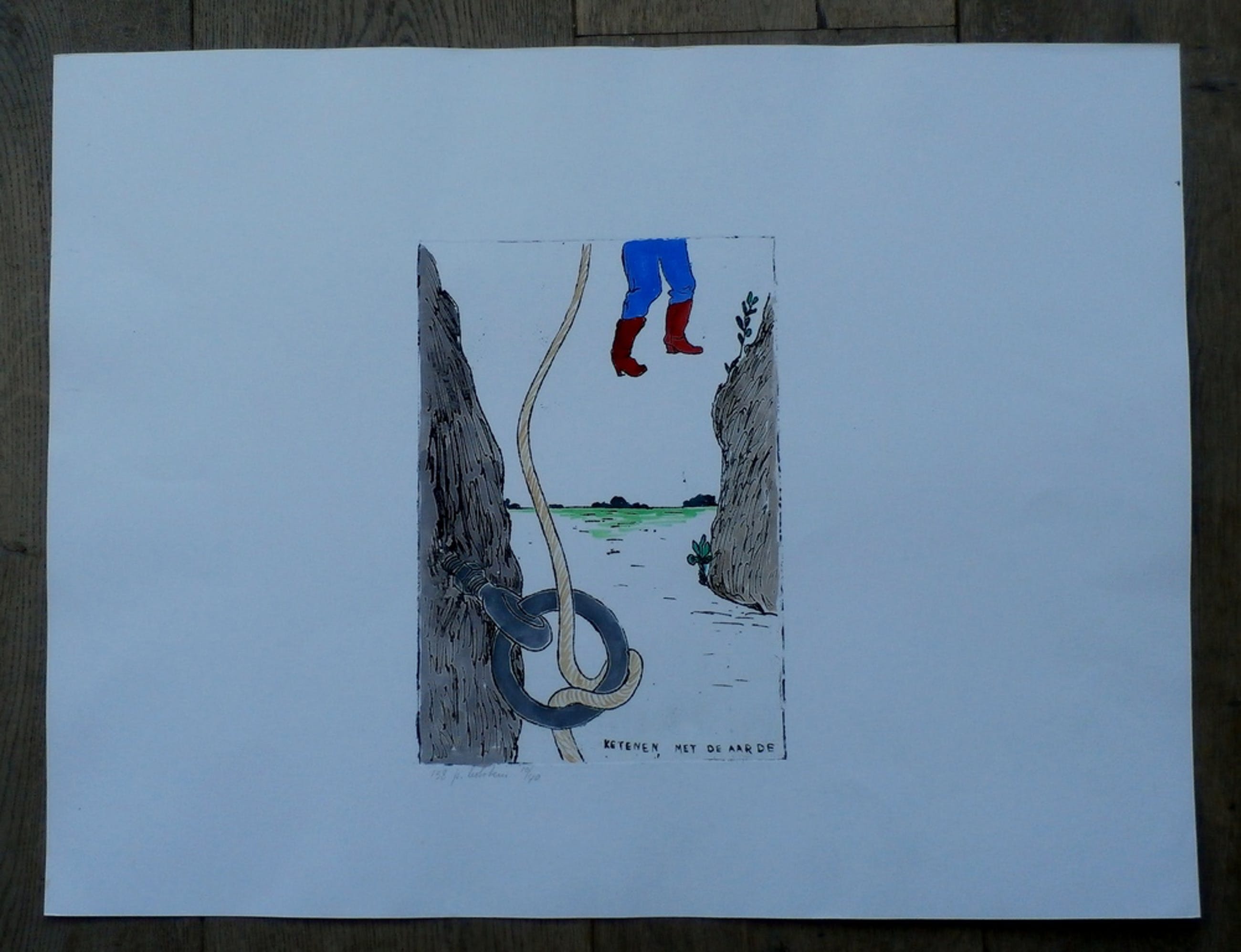 Mooie kleurenets van Pieter Holstein. Titel: Ketenen, met de aarde. Nummer 10/40, gesigneerd. Afmetingen beeld: 29,6 x 20,5 cm. Afmetingen totaal blad: 50 x 65 cm.