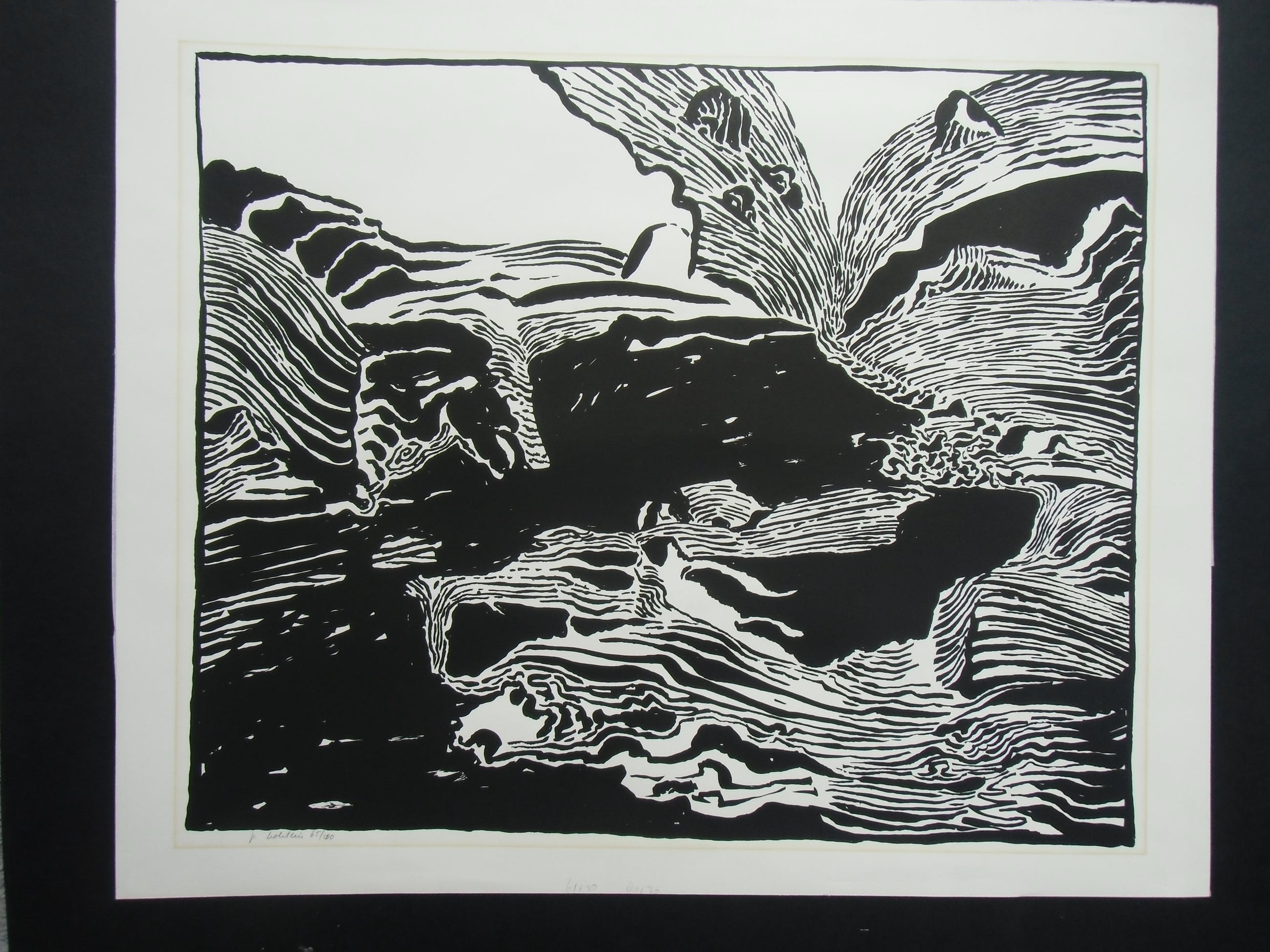 Abstracte linosnede van Pieter Holstein uit de tweede helft van de vorige eeuw. Zeer goede conditie. Oplage 100 exemplaren (dit is nr. 65). Gesigneerd met potlood. Geen lijst of passepartout.