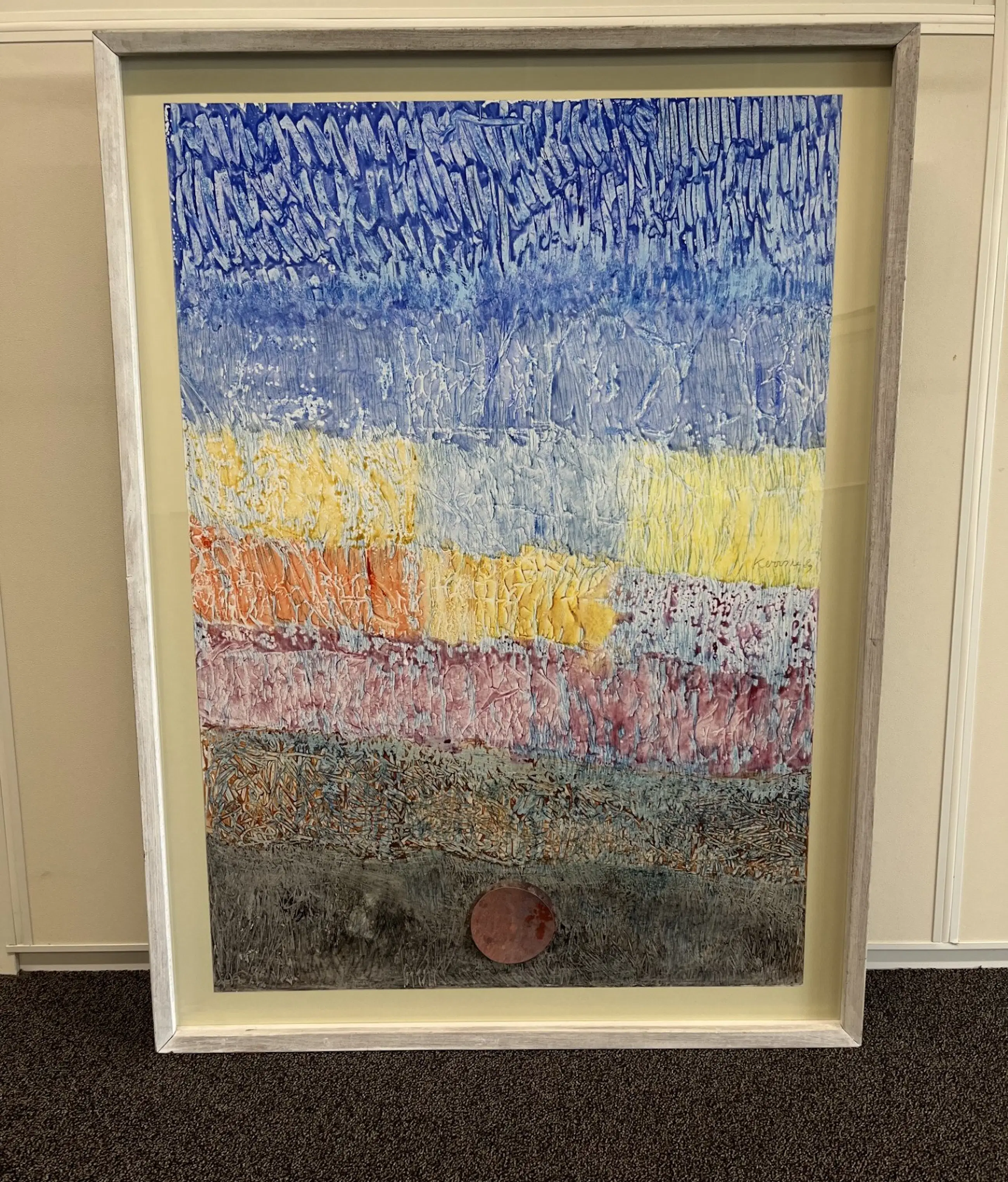 Een staand werk met zeven horizontale kleurzones/banden boven elkaar (van blauw via geel/oranje/roze naar grijs-bruin), opgebouwd uit korte, pasteuze verfstroken.