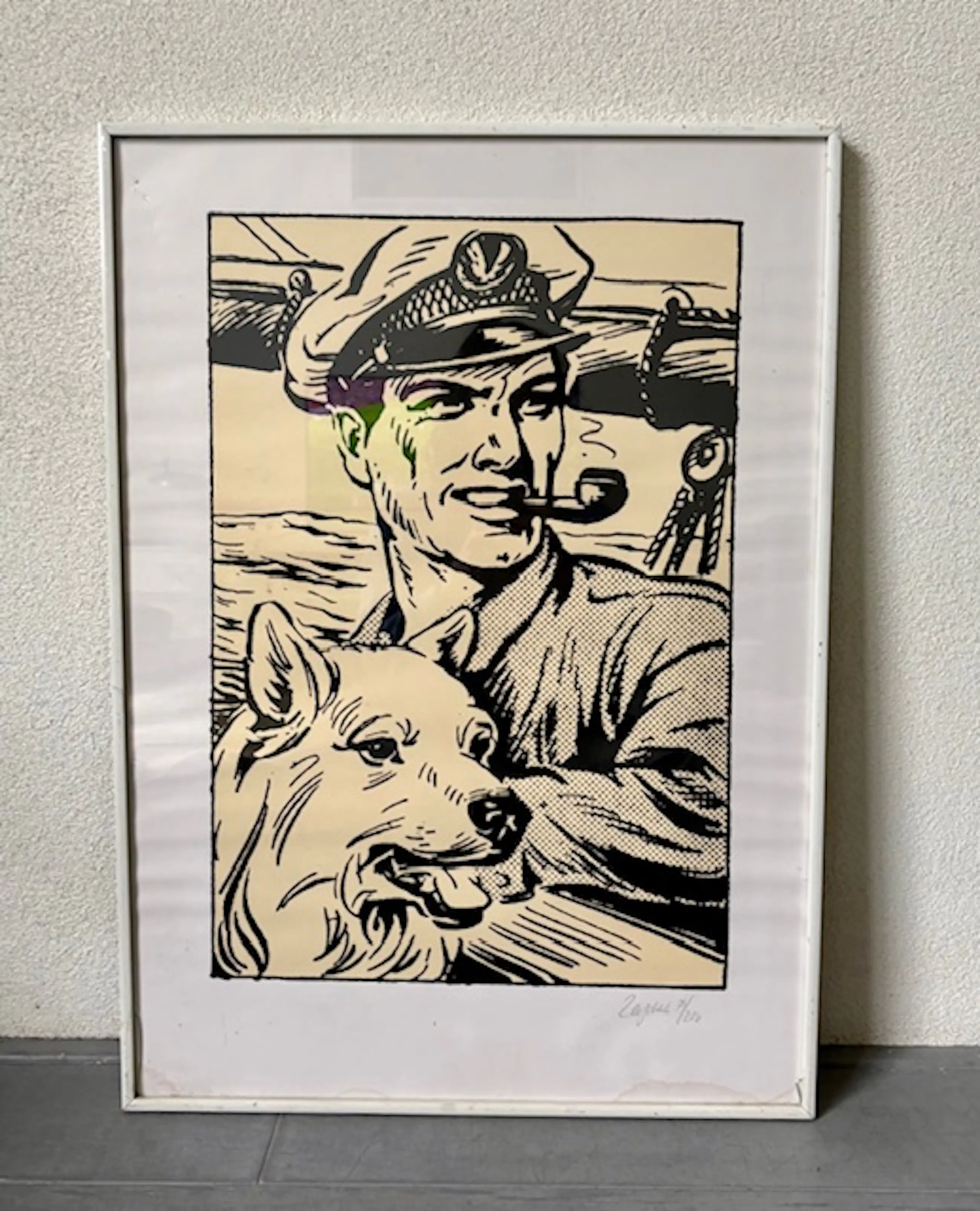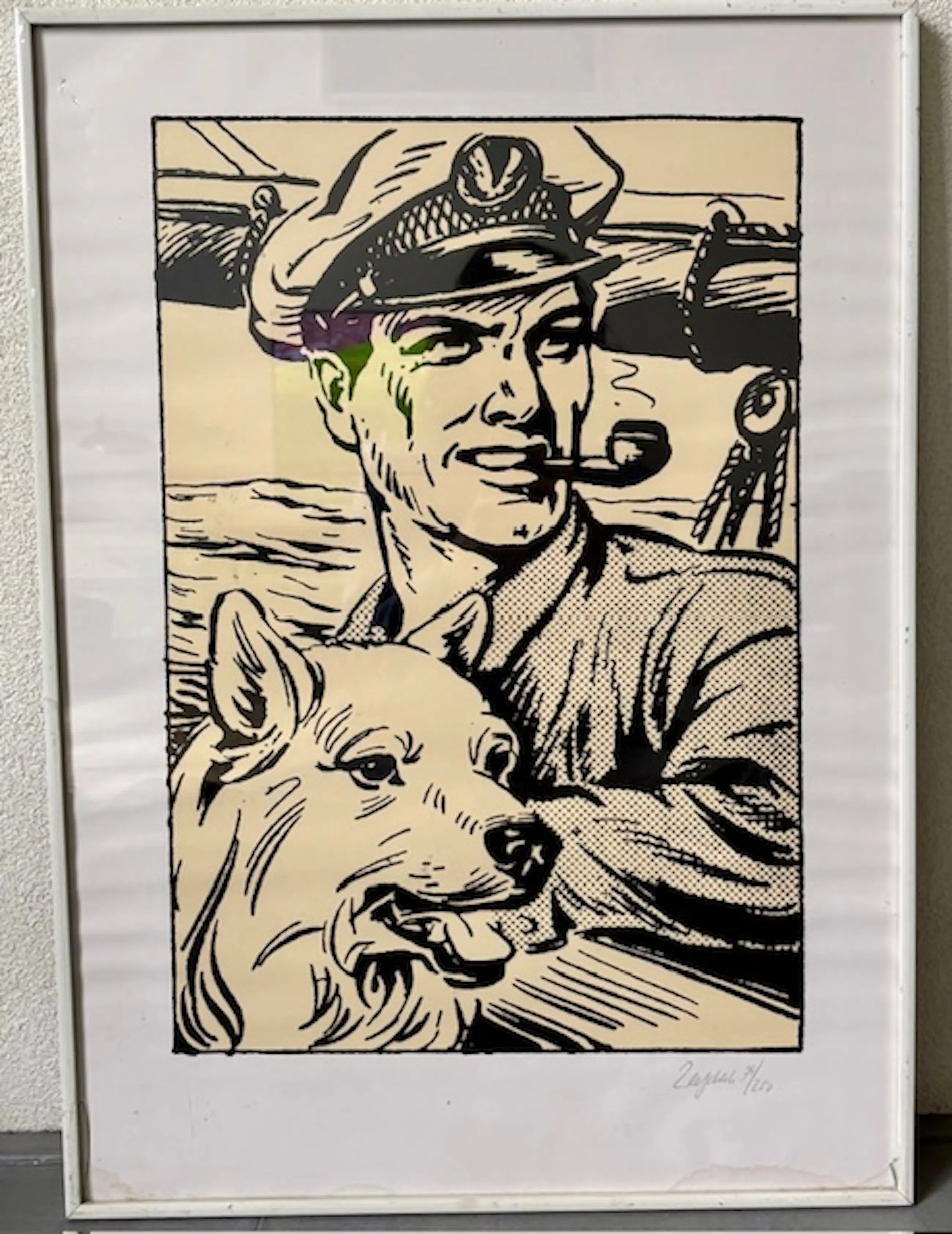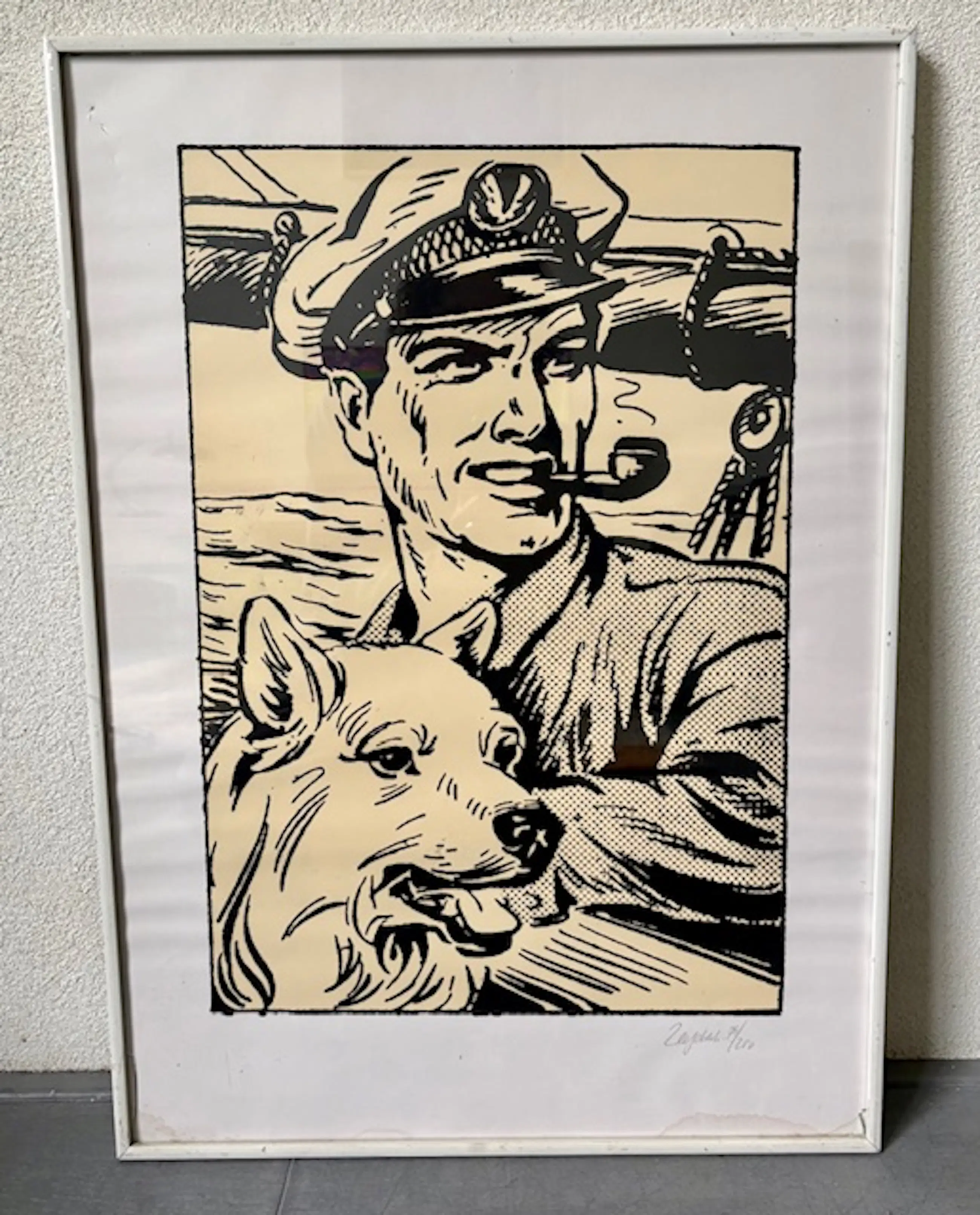 Zeefdruk van Pieter Kuhn, oplage 75 van 200, met titel "Kapitein Rob met hond Skip".