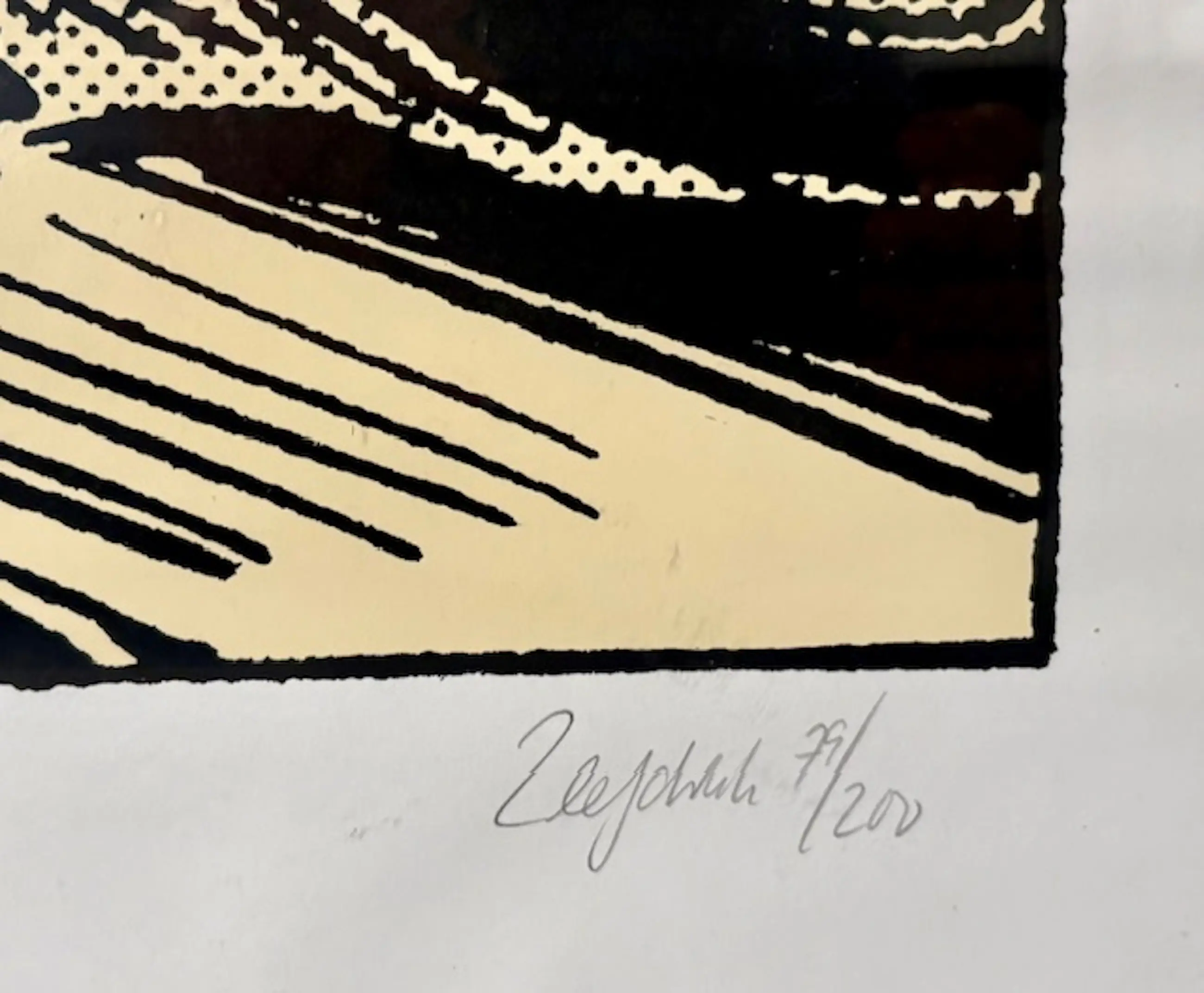Zeefdruk verkeerd is goede staat, het paspartout heeft wat reliëf, de glasplaat in de linker onderhoek heeft nauwelijks zichtbare schade. De lijst verkeerd in zeer goede staat.