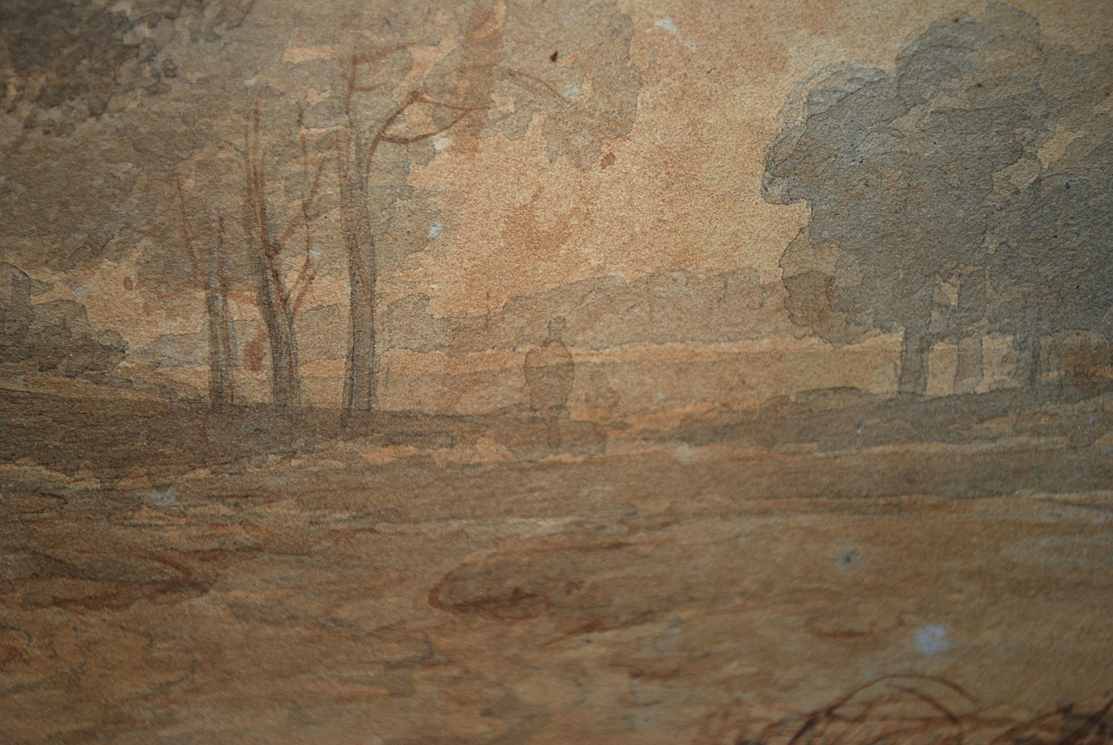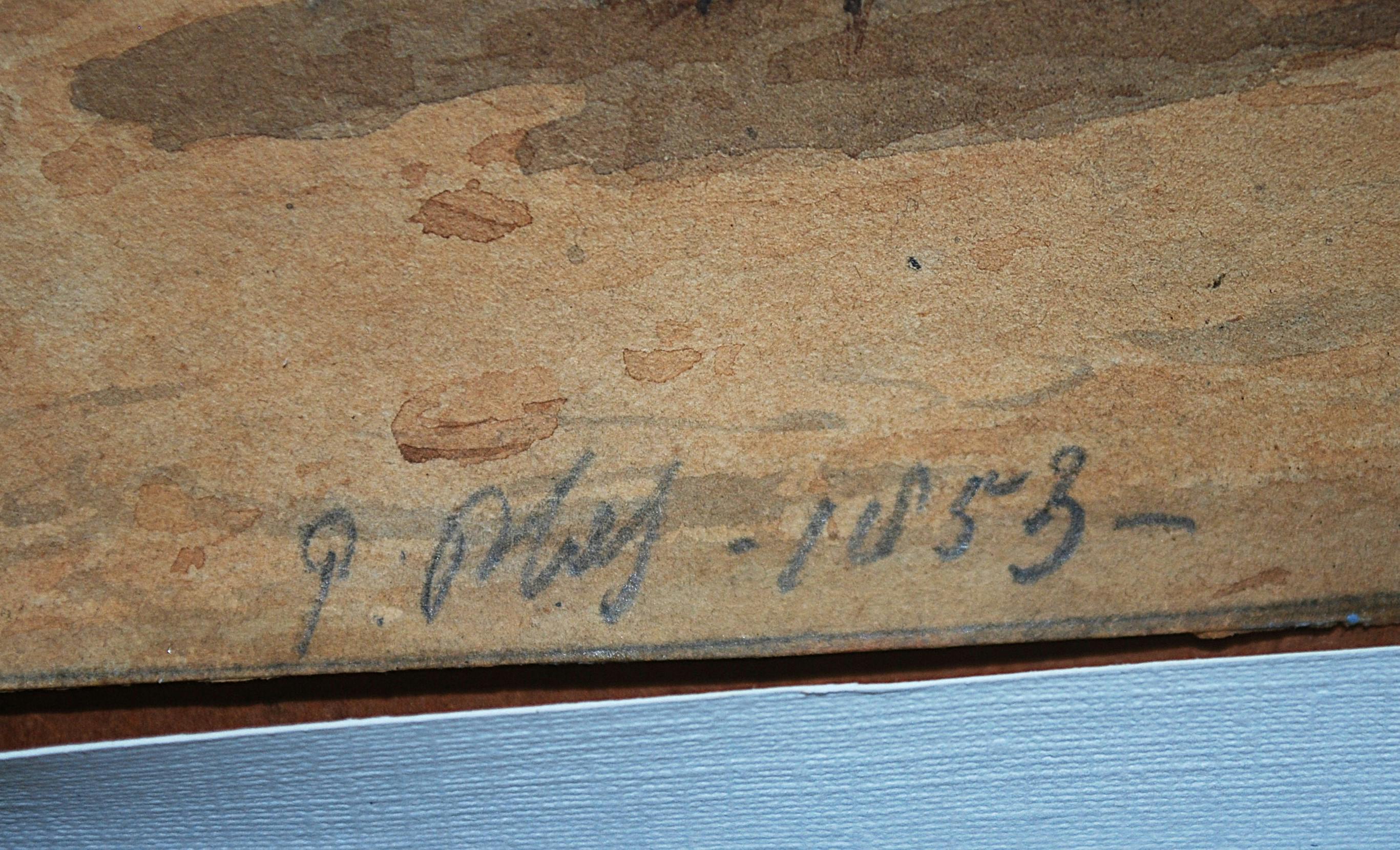 Dit werk is gemaakt in het jaar dat Plas overleed. Aquarel met wit opgehoogd (in de lucht). Het stevige papier is bovenaan op 2 plekken vastgelijmd op karton. Het papier is vergeeld, verder in goede staat. Achter 2 nieuw aangebrachte passepartouts. Achter glas, in een fraaie goudvergulde (+/-antieke) lijst; enige slijtschade.