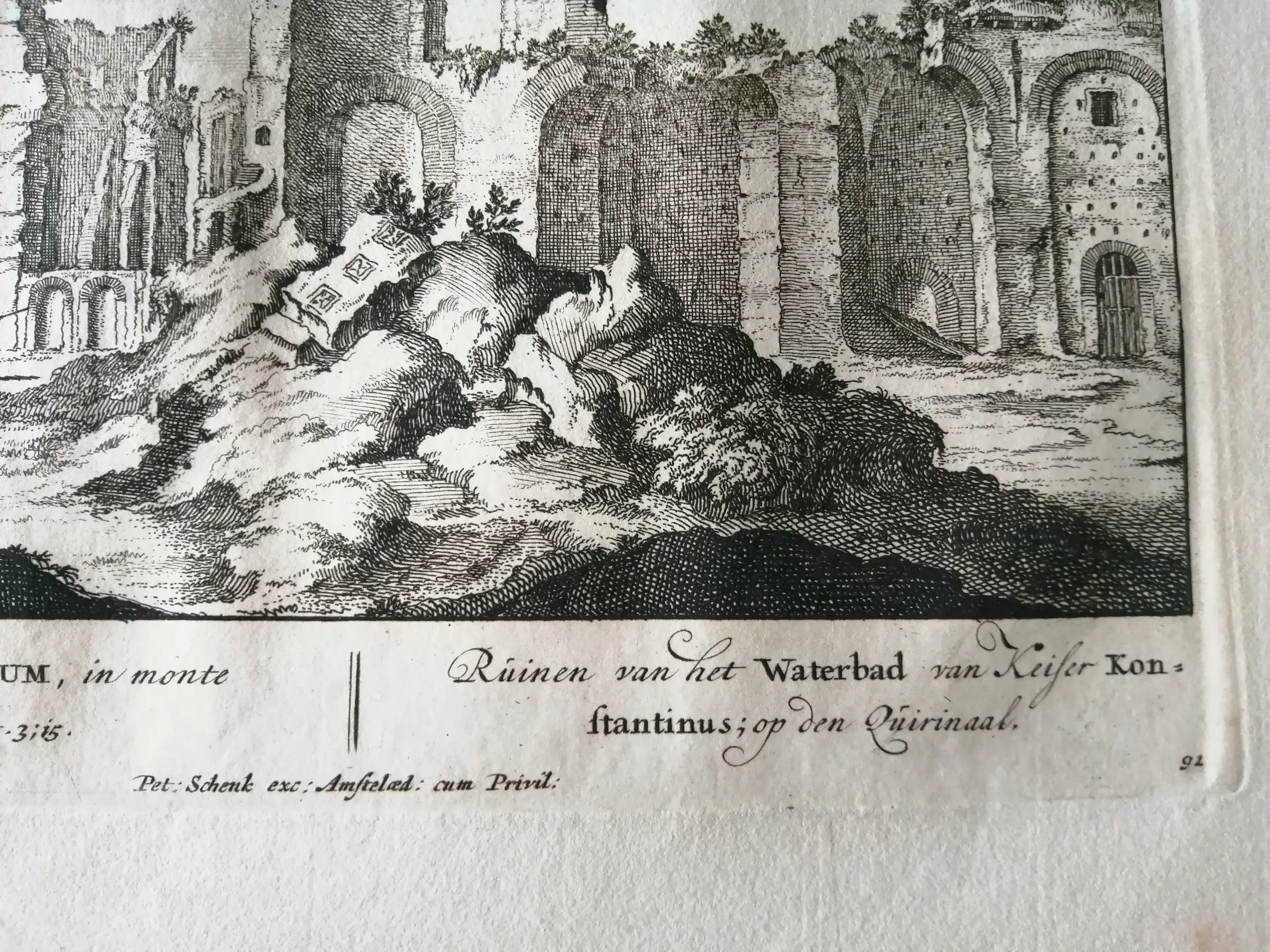 Gravure komt uit een zeldzame reeks prenten uitgegeven door Pieter Schenck in 1705 met veduta van moderne en antieke plaatsen in Rome.