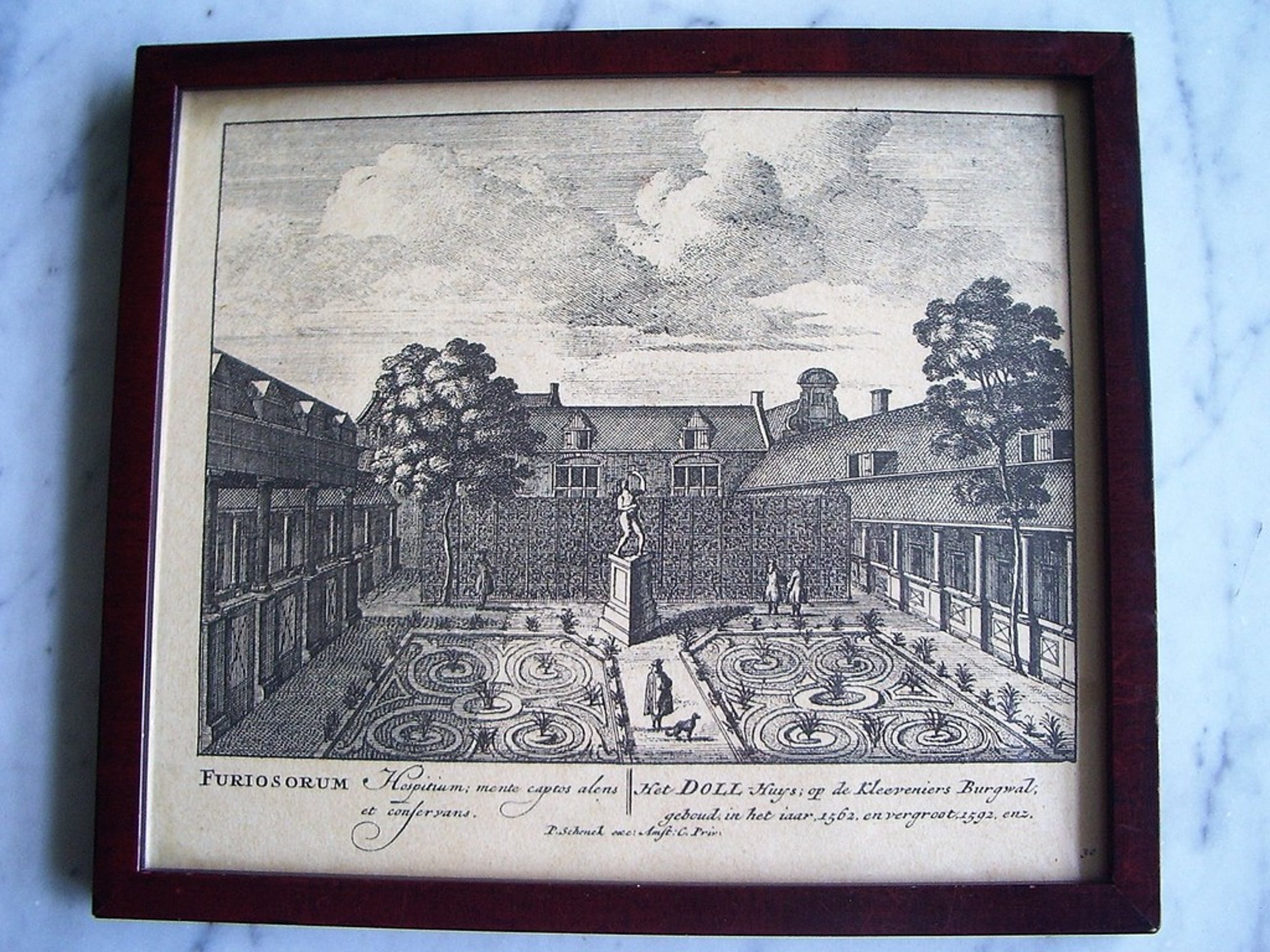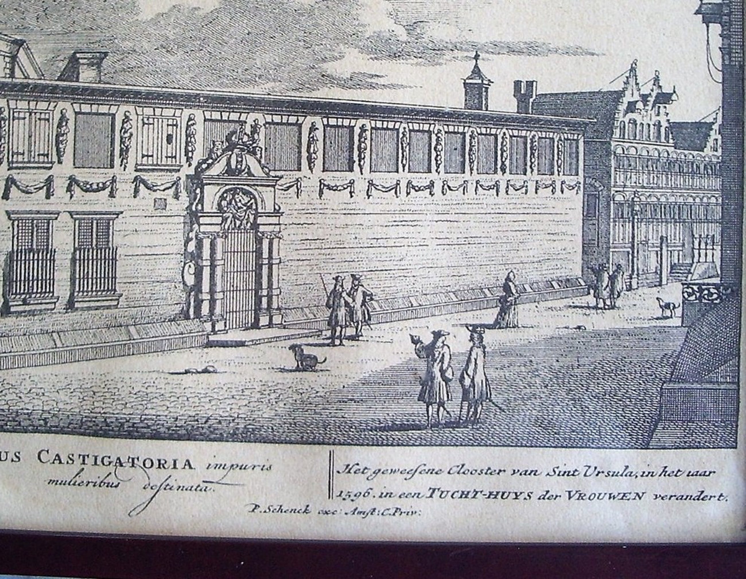 Schenk had kennelijk iets met gebouwen om mensen, waar iets goed mis mee was, op te sluiten. Afgebeeld: het '' Tuchthuys der Vrouwen '' en het '' Doll Huys ''