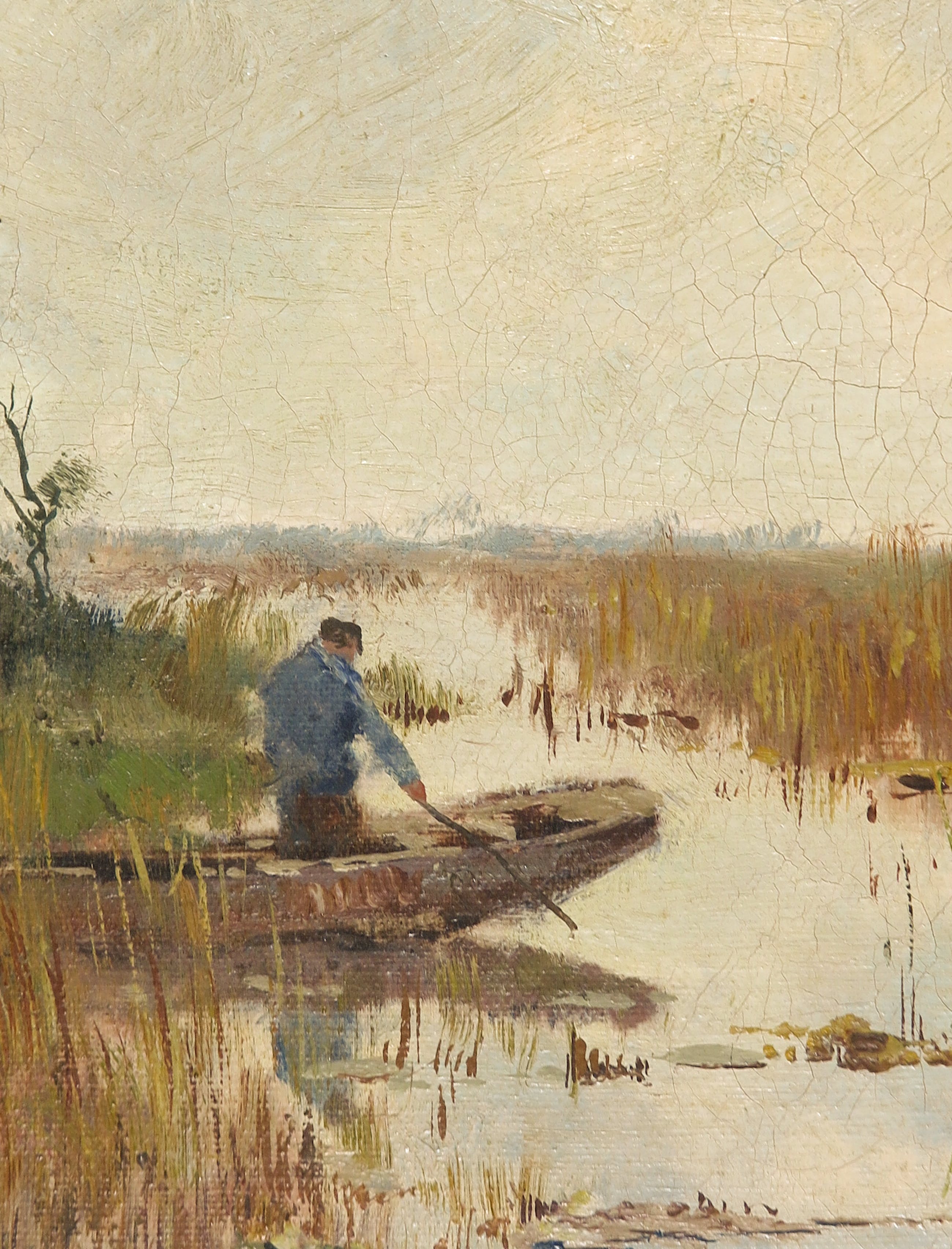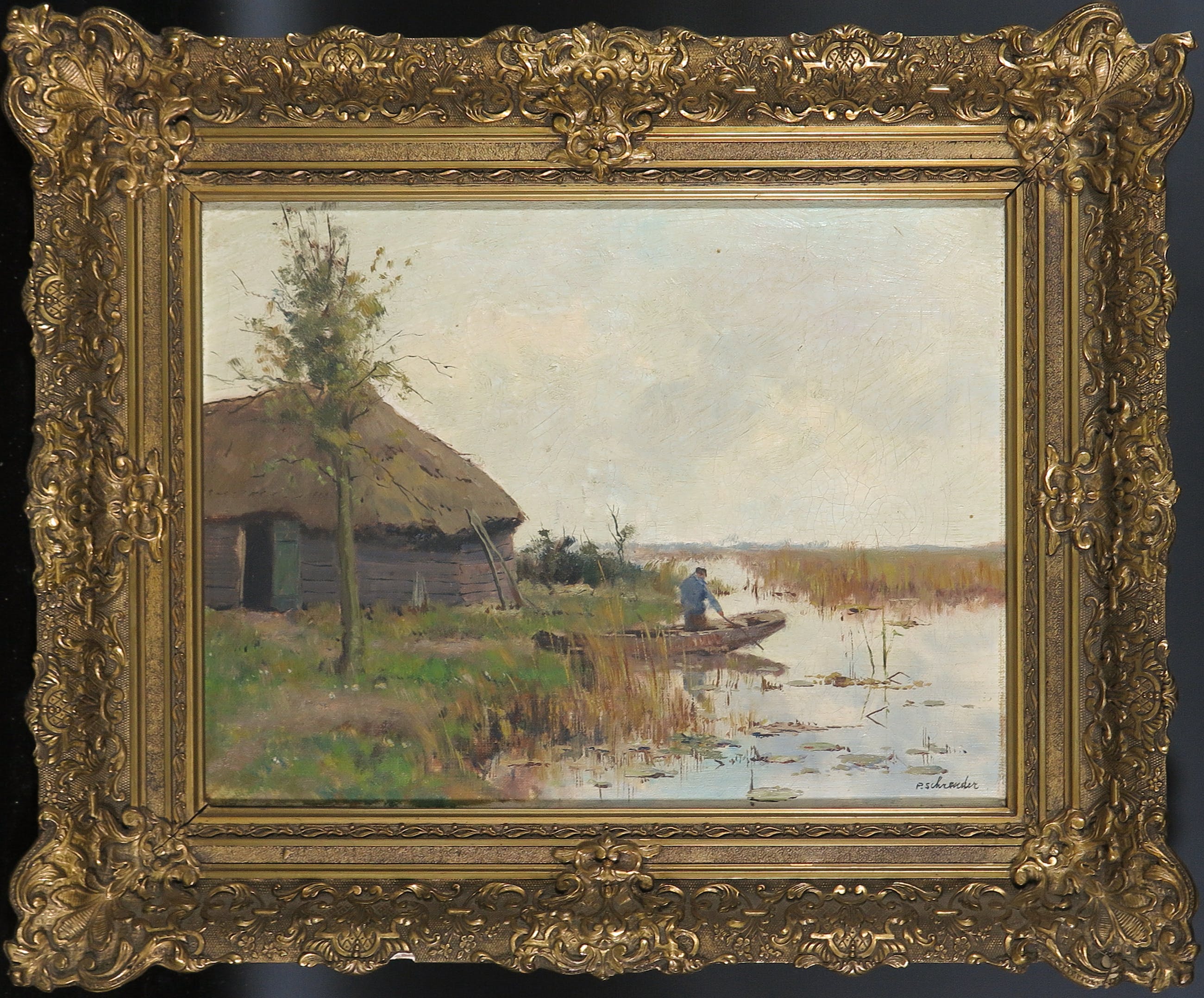 Goede staat, met oppervlatevuil/nicotineaanslag. Verspreid over het doek craquelé (zonder verfverlies). Beschadigingen aan de lijst. | |