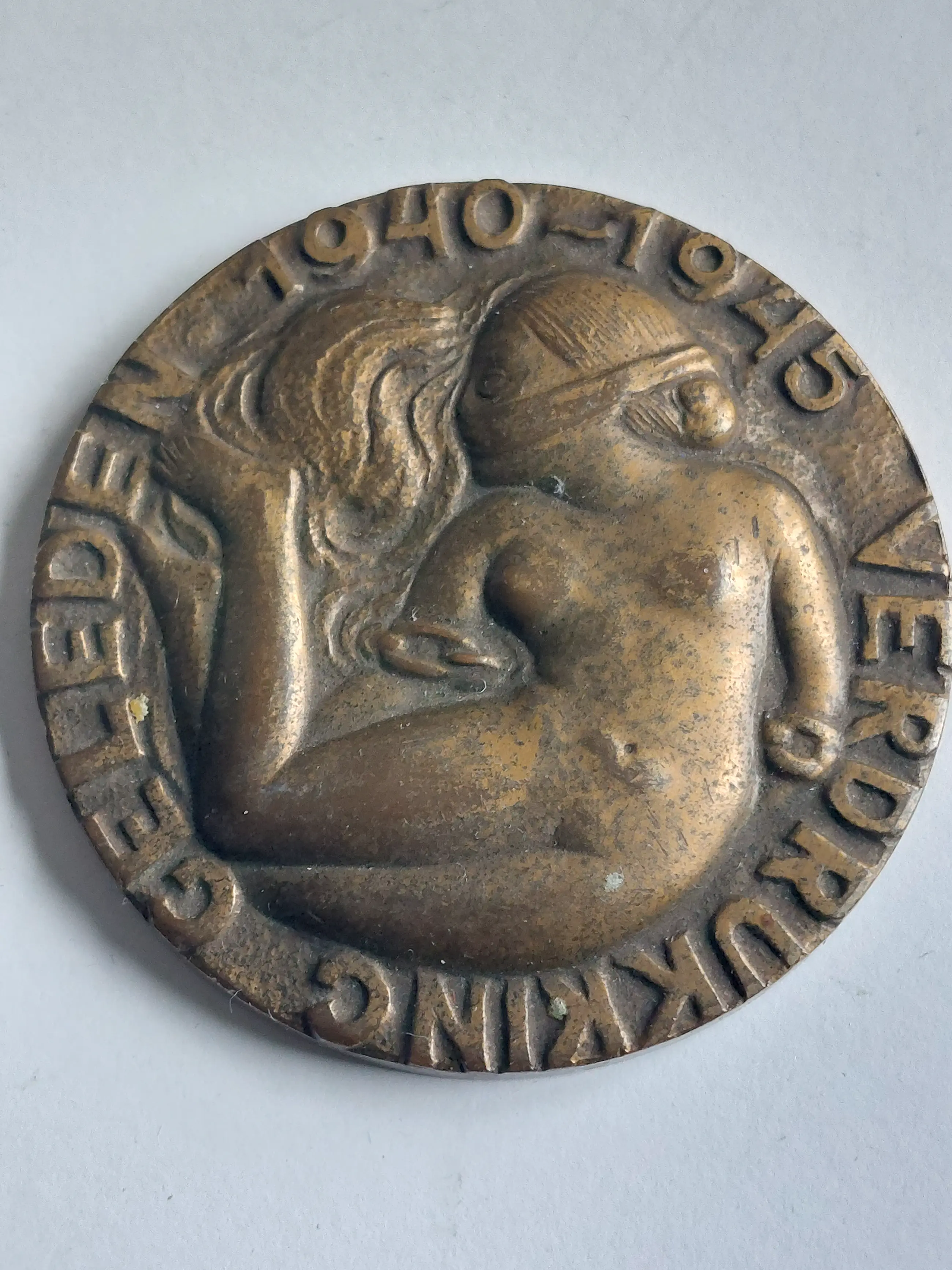 Starreveld heeft de stempels voor deze penning tijdens de beginjaren van de bezetting al gesneden. Dit is er 1 van een drieluik. De stempels zijn later bij de Koninklijke Begeer in bewaring gegeven waar ze achter een muur zijn verstopt. Na de oorlog was de exacte locatie niet meer beschikbaar en werd de hele muur gesloopt. Starreveld heeft in het totaal maar 7 penningen gemaakt. op de voorzijde geblinddoekte en geboeide naakte vrouw, VERDRUKKING GELEDEN 1940 ~ 1945