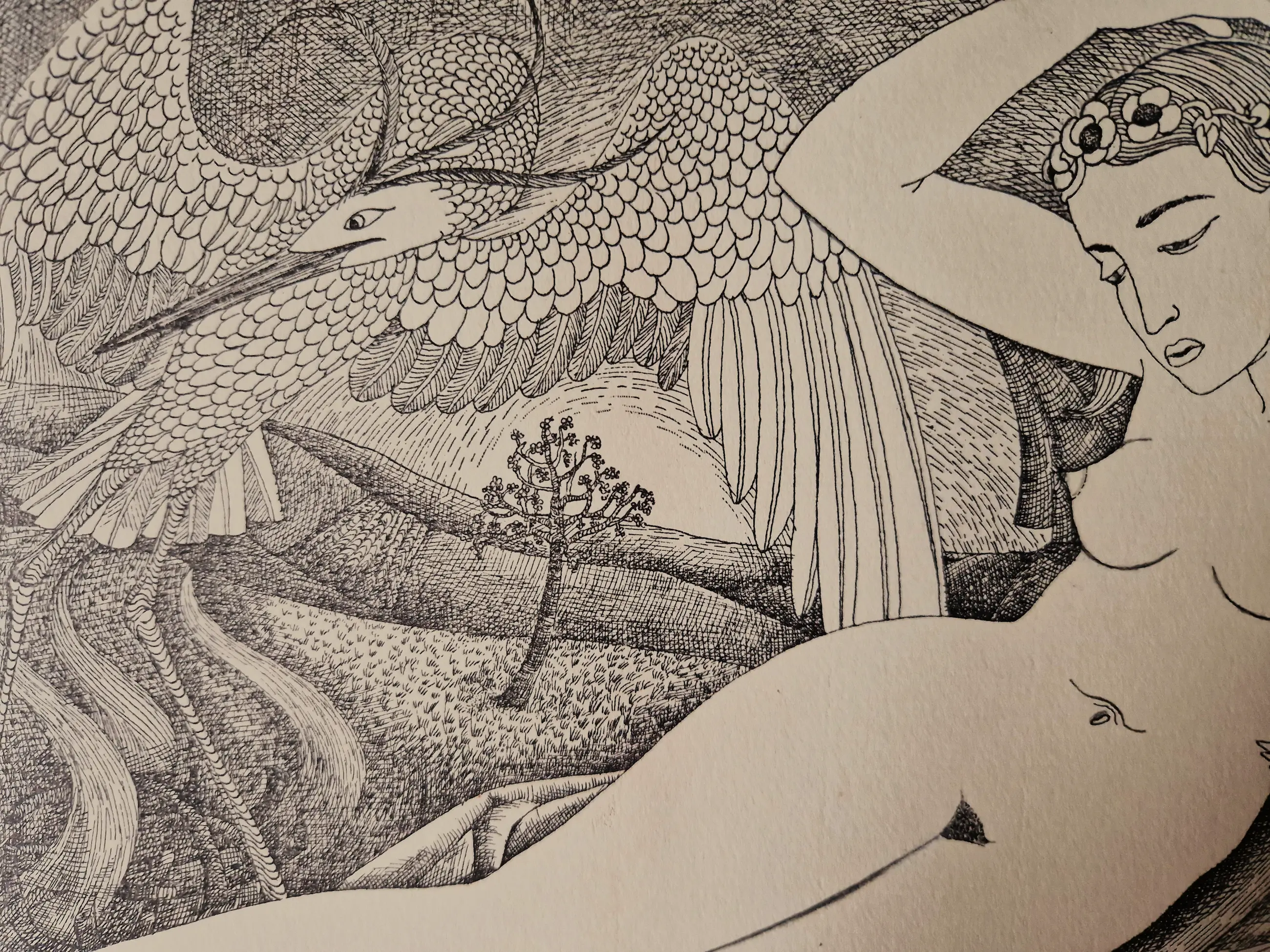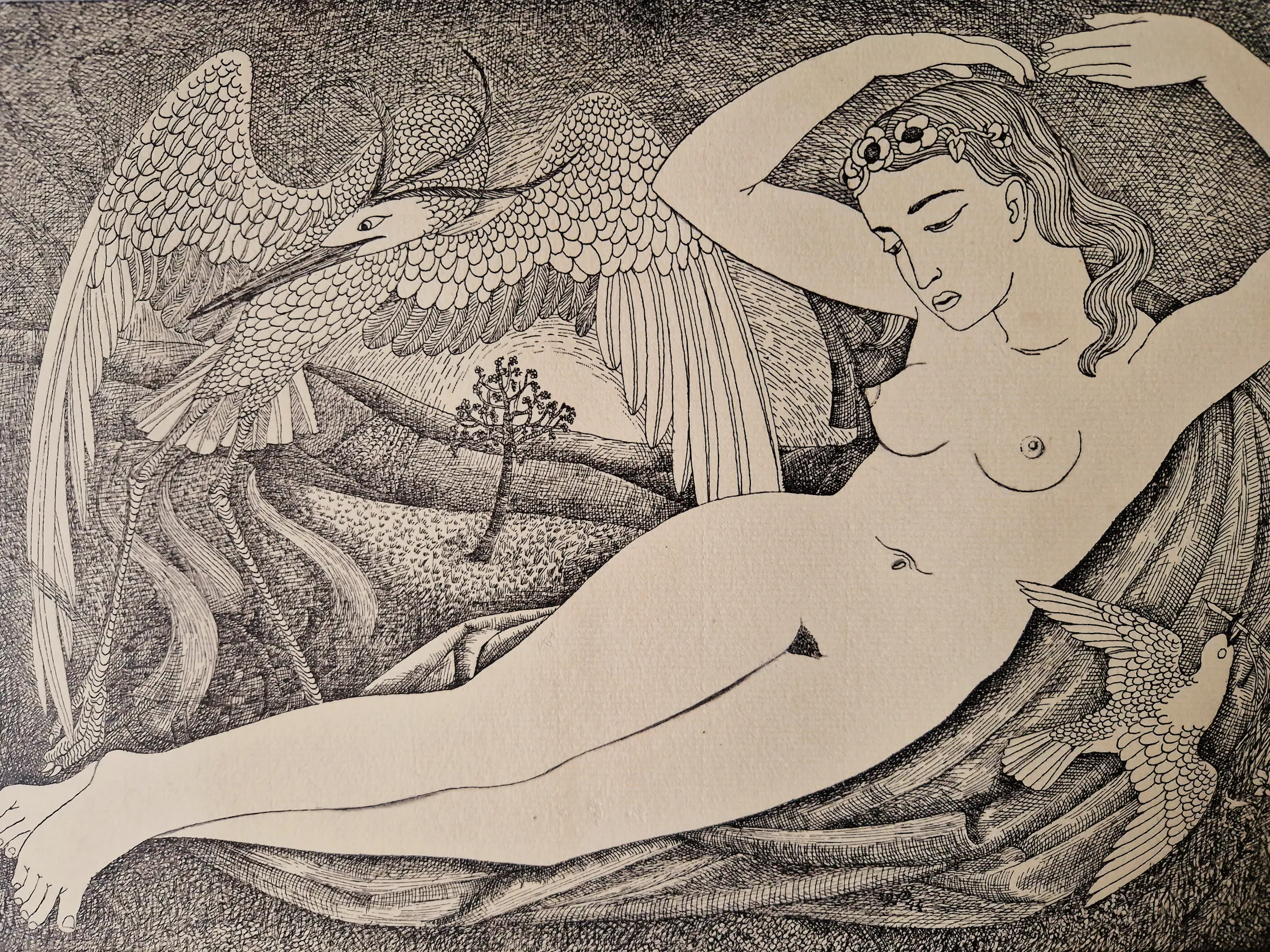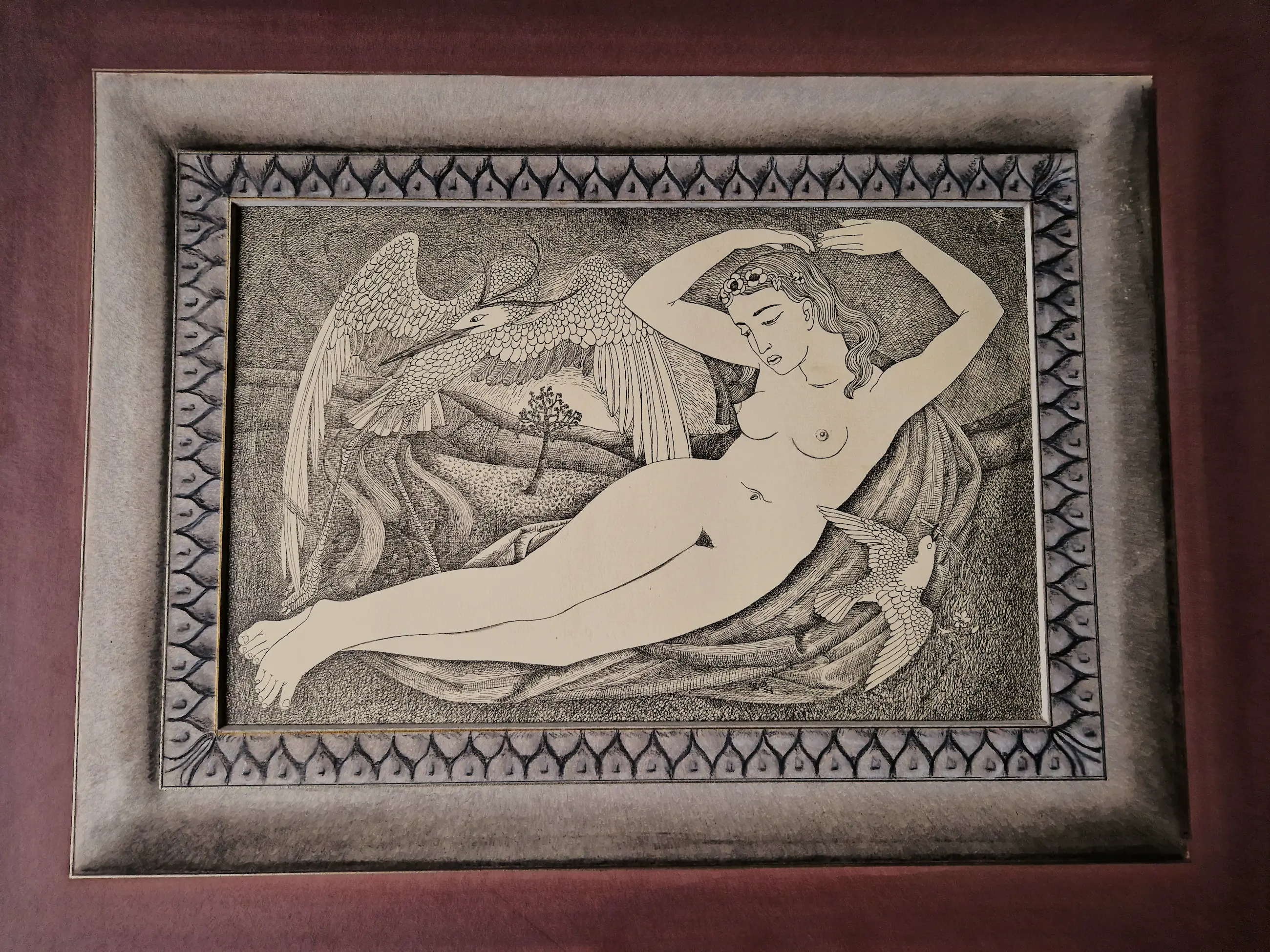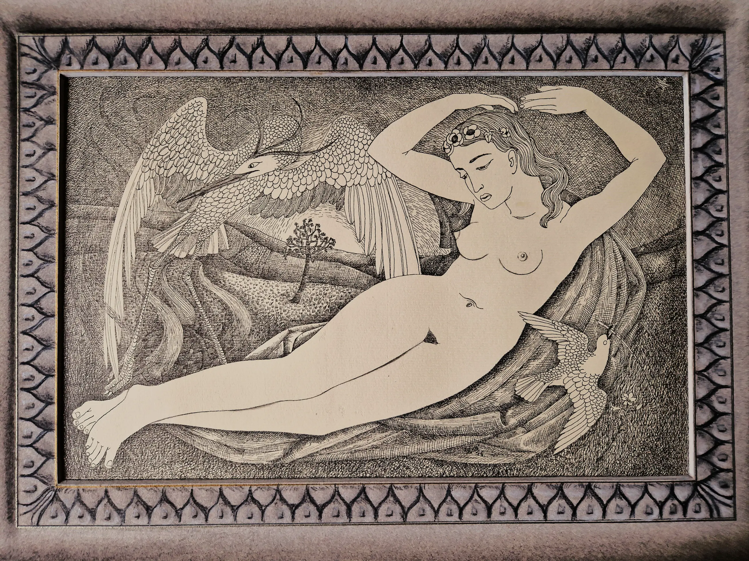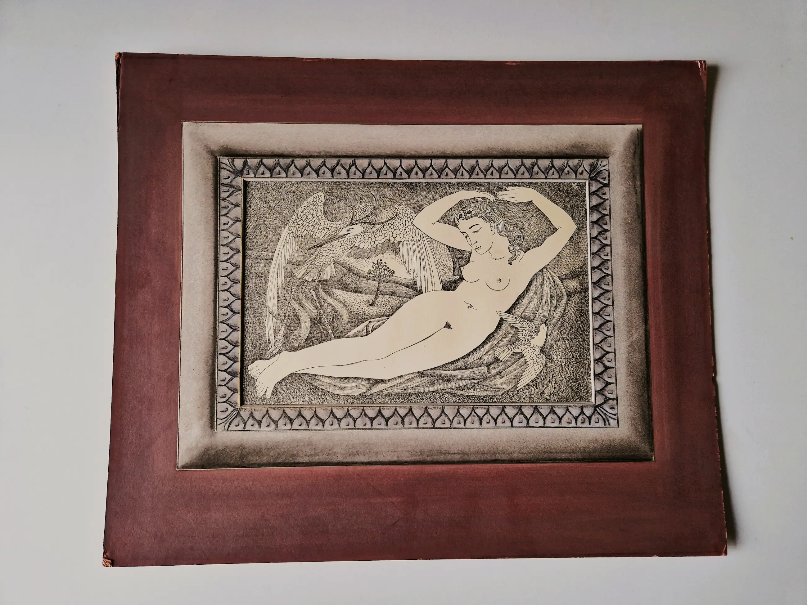 Bijzondere, door pieter Starreveld in 1944 gemaakte Lithografie op papier met liggend vrouwelijk naakt. In de plaat gesigneerd met monogram en datering. De fraaie (getekende) omlijsting is speciaal voor deze serie litho's ontworpen door architect en meubelmaker Jacob Cornelis Jongens (1898-1986). Afmetingen litho 20x30cm en incl. omlijsting 40x50cm.