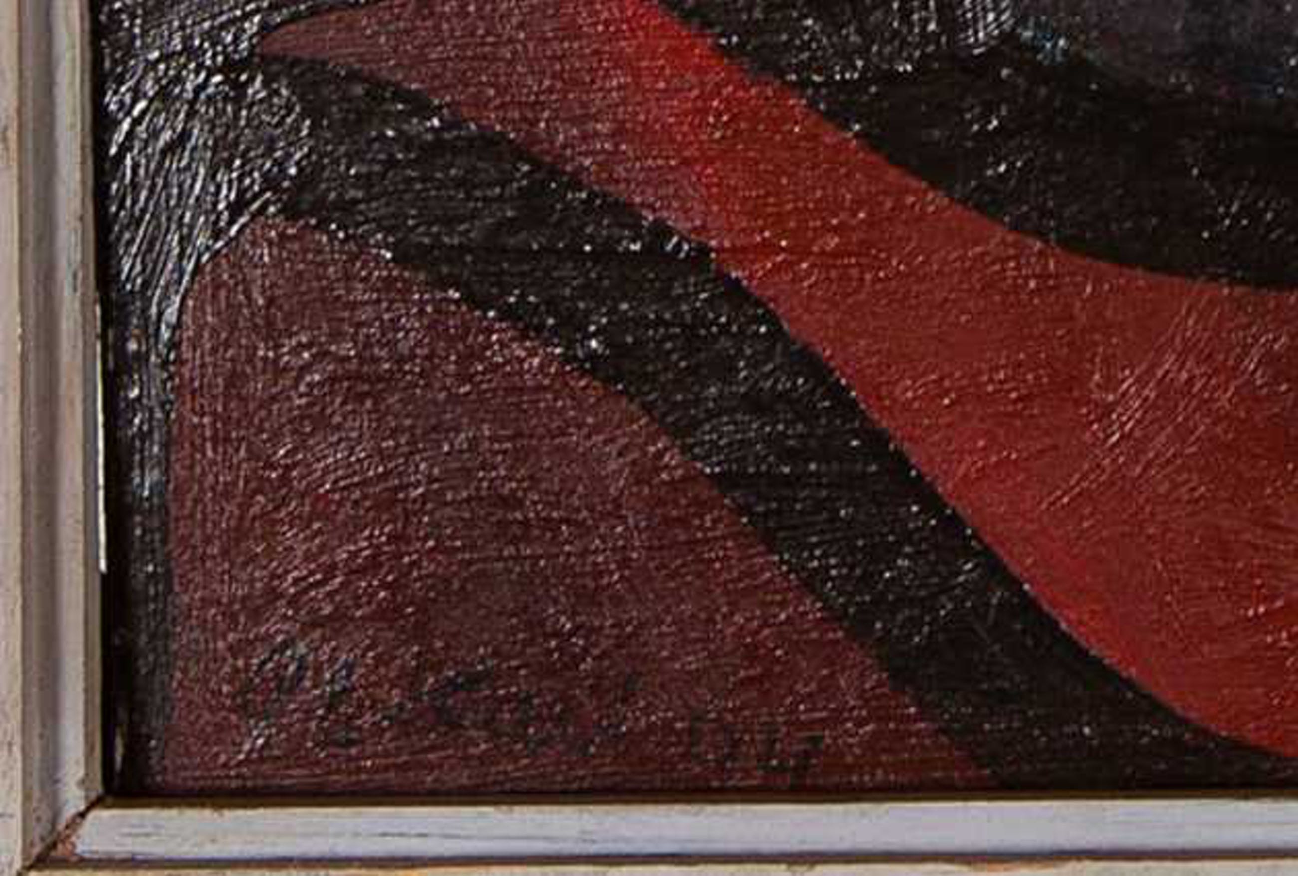 | De ondergrond is vervormd en past niet meer in de lijst. Vochtschade is zichtbaar onderaan op achterzijde. Het werk is dof en stoffig. Er zitten enkele kleine krasjes die de dik opgezette verflaag over verschillende dieptes doorbreken. | |