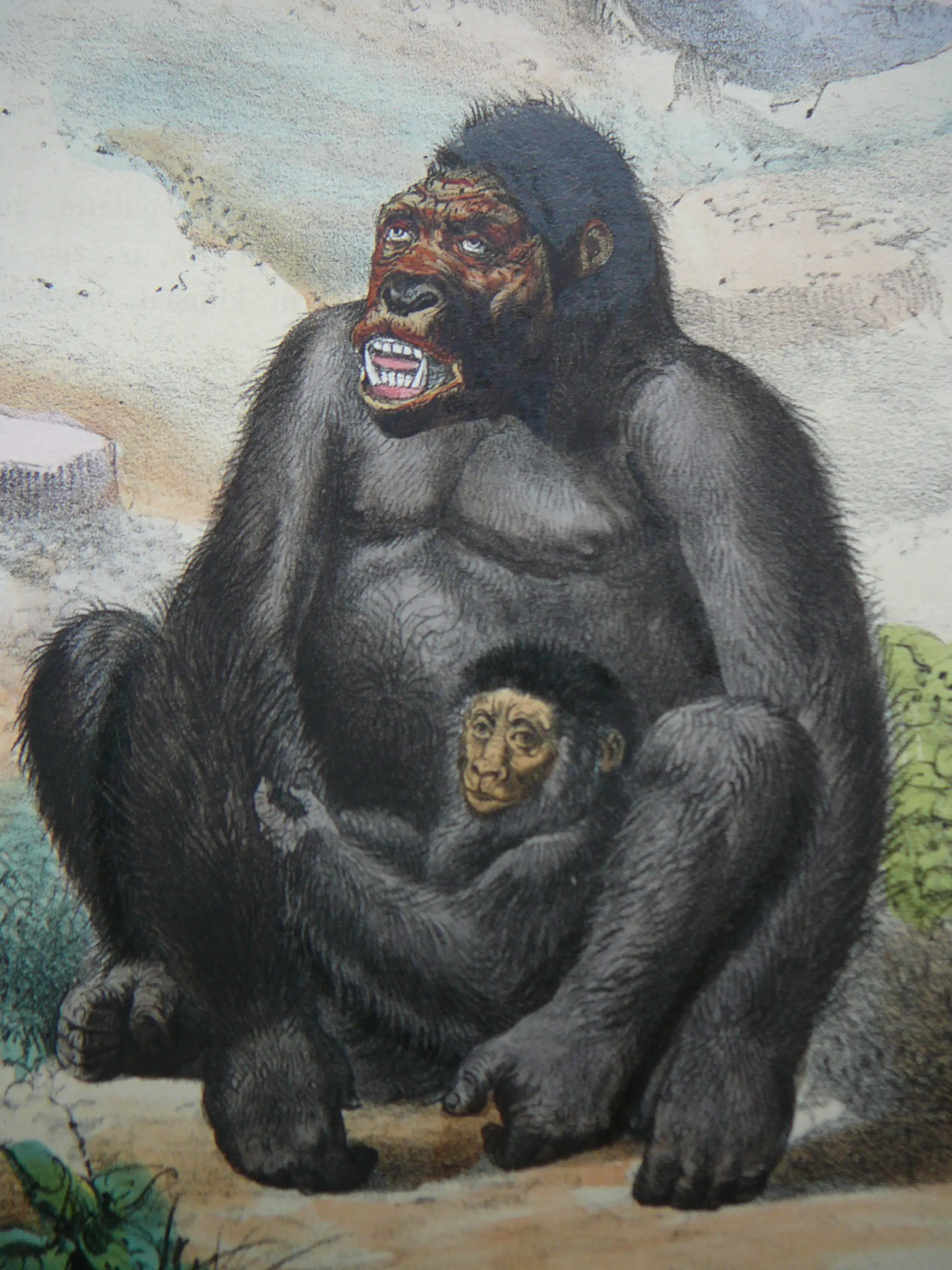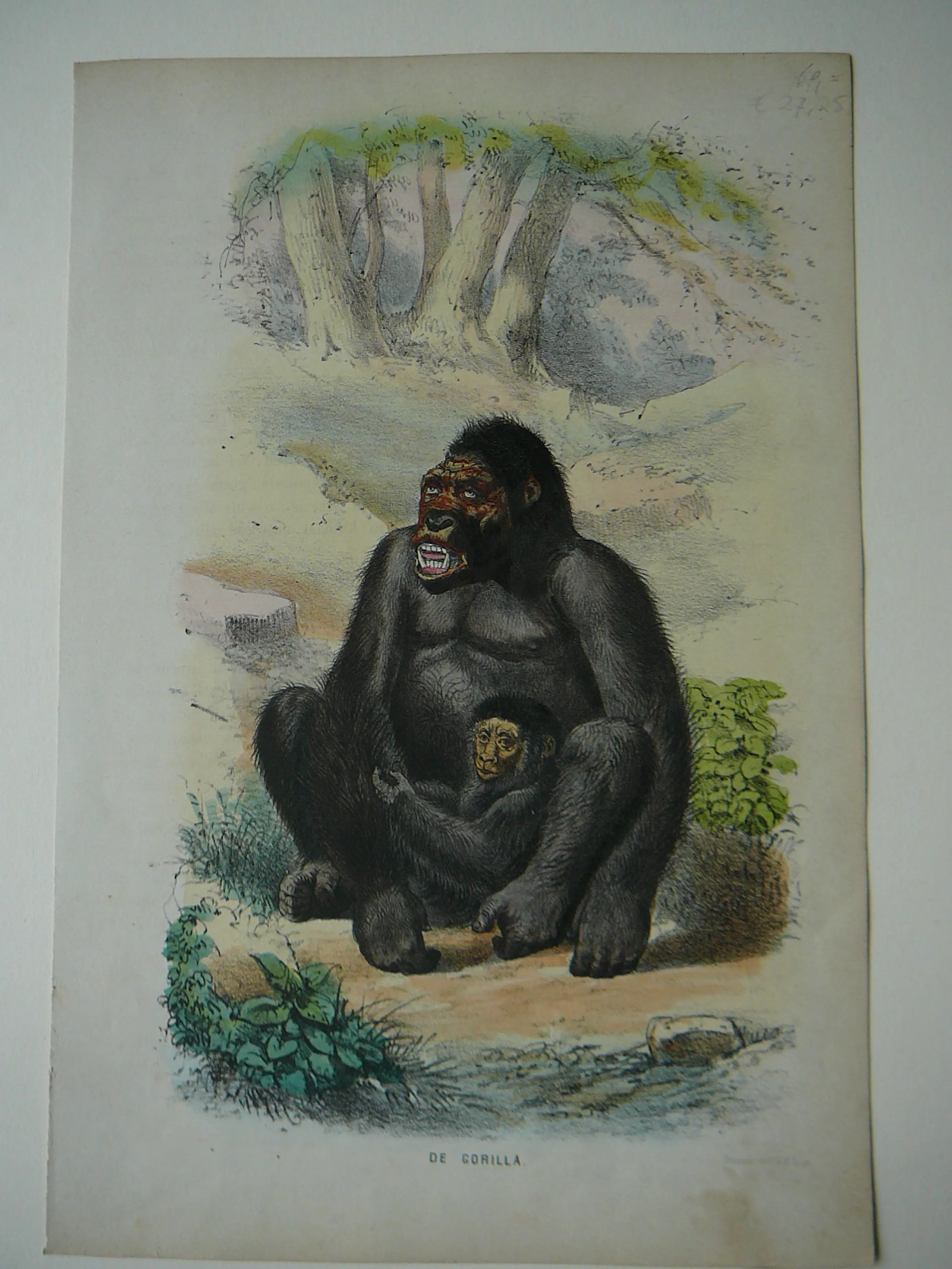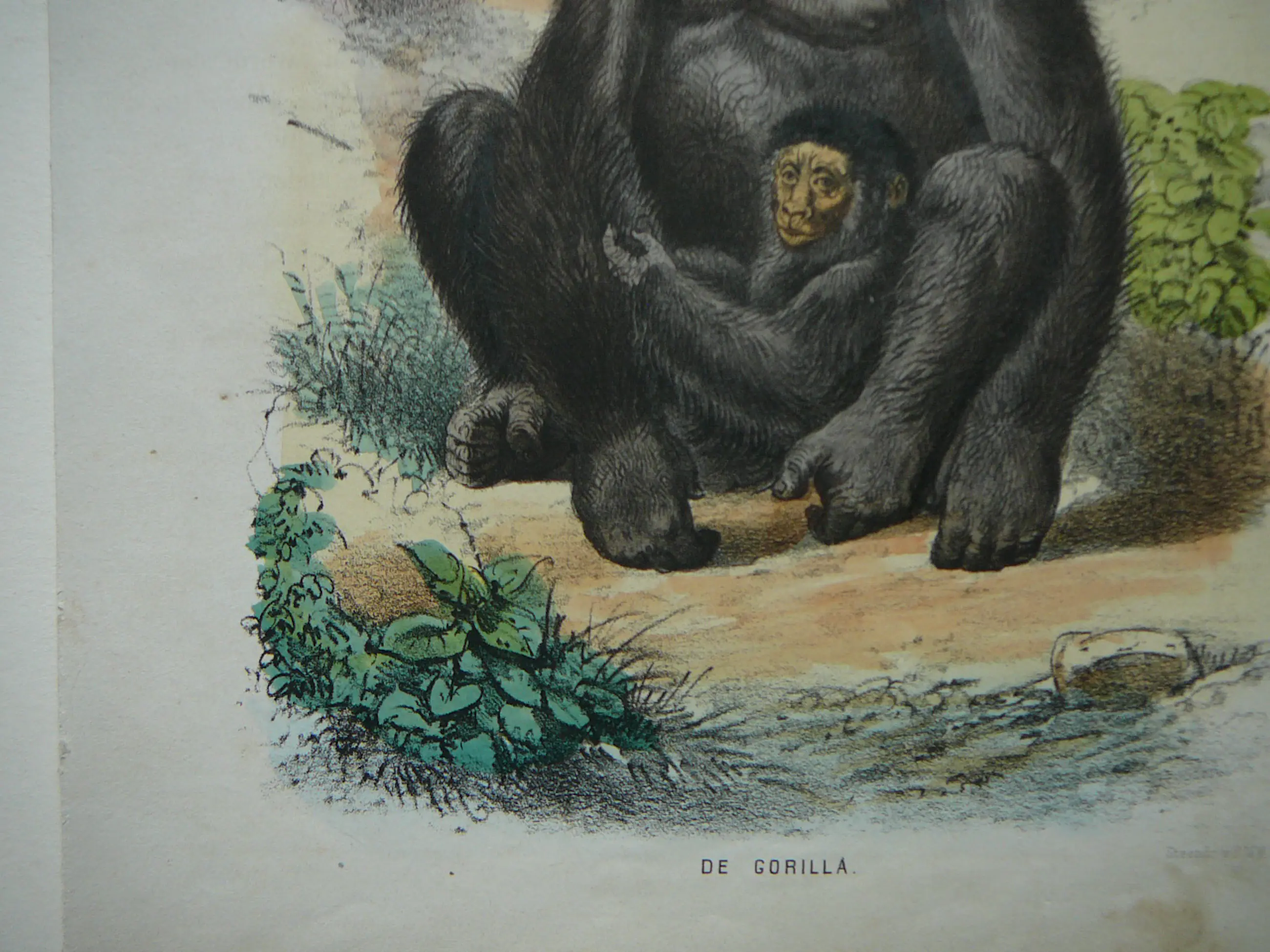 Zeer mooie chromolitho gehoogd van de Gorilla aap door P.W.M. Trap 1821-1905 Gorilla aap met jong