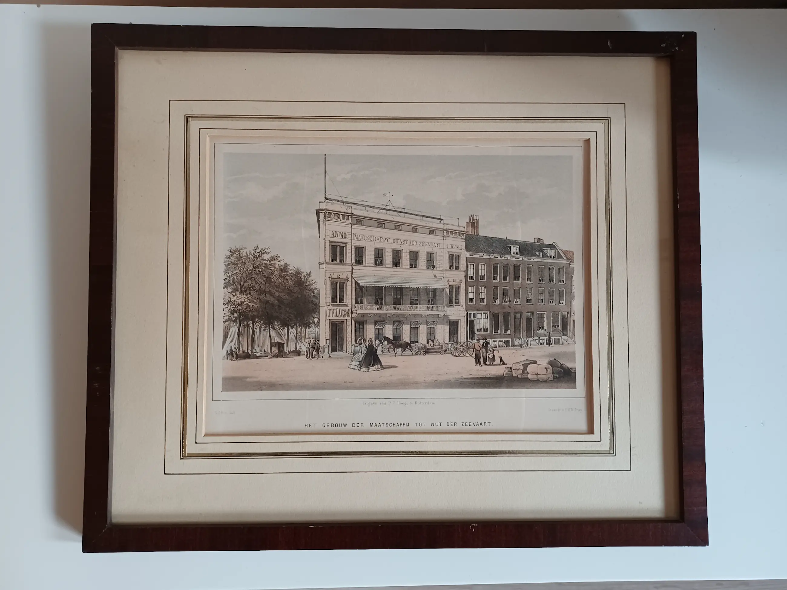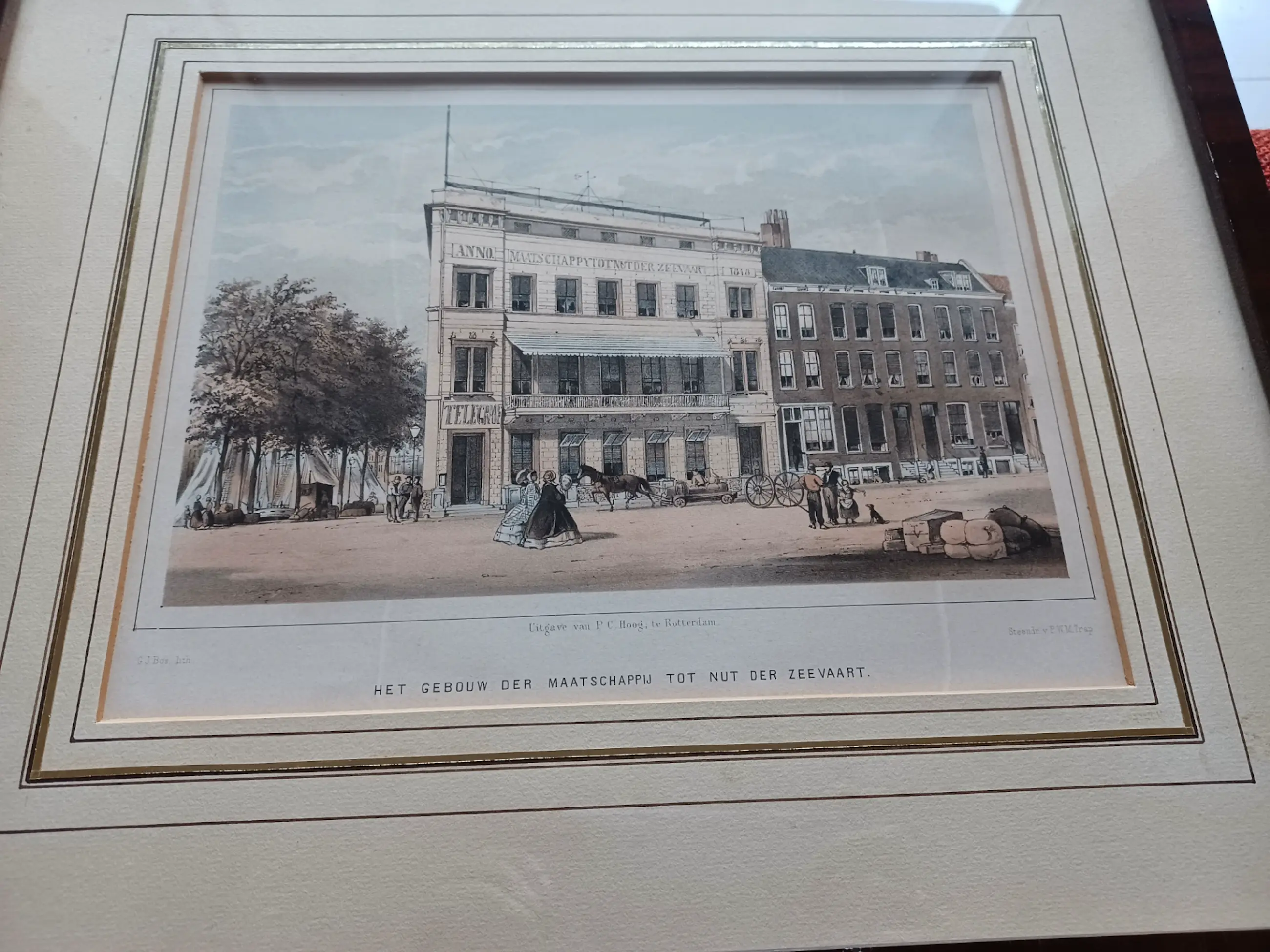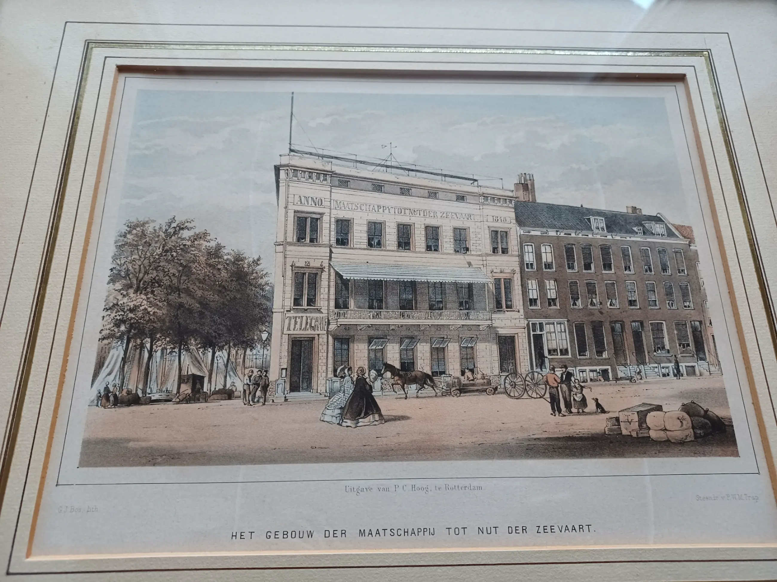 G.J. Bos Lithografieën Uitgave van P.C. Hoogt Rotterdam Steendrukkerij Pieter Willem Marinus Trap Gezicht op het sociëteitsgebouw van de Maatschappij tot Nut der Zeevaart en de Rotterdamse Telegraaf Maatschappij. De telegraaf verbinding tussen Rotterdam en Brouwershaven (halverwege Rotterdam en Batavia) werd onderhouden vanuit het oude gebouw van de Maatschappij tot Nut der Zeevaart (op het dak de antenne voor de telegraafverbinding).