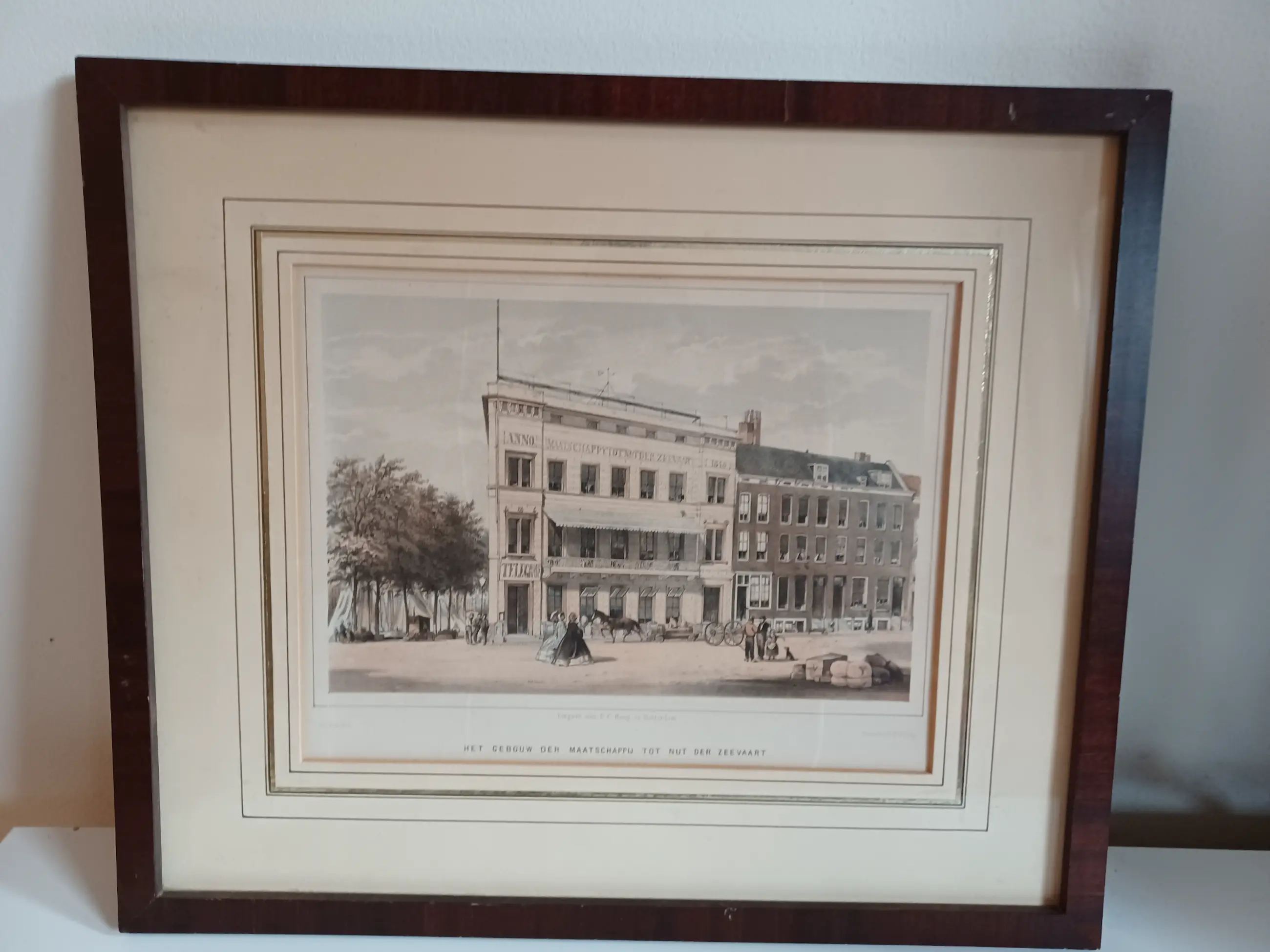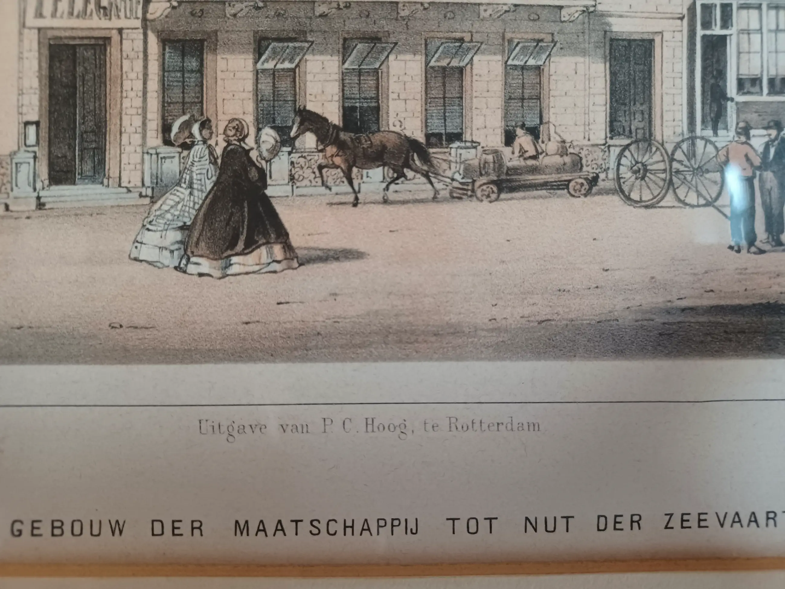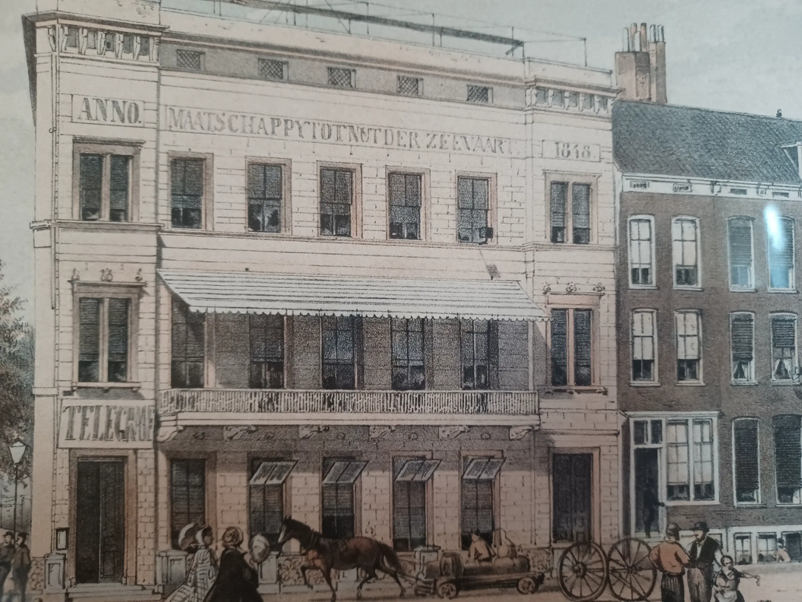 G.J. Bos Lithografieën Uitgave van P.C. Hoogt Rotterdam Steendrukkerij Pieter Willem Marinus Trap Gezicht op het sociëteitsgebouw van de Maatschappij tot Nut der Zeevaart en de Rotterdamse Telegraaf Maatschappij. De telegraaf verbinding tussen Rotterdam en Brouwershaven (halverwege Rotterdam en Batavia) werd onderhouden vanuit het oude gebouw van de Maatschappij tot Nut der Zeevaart (op het dak de antenne voor de telegraafverbinding).