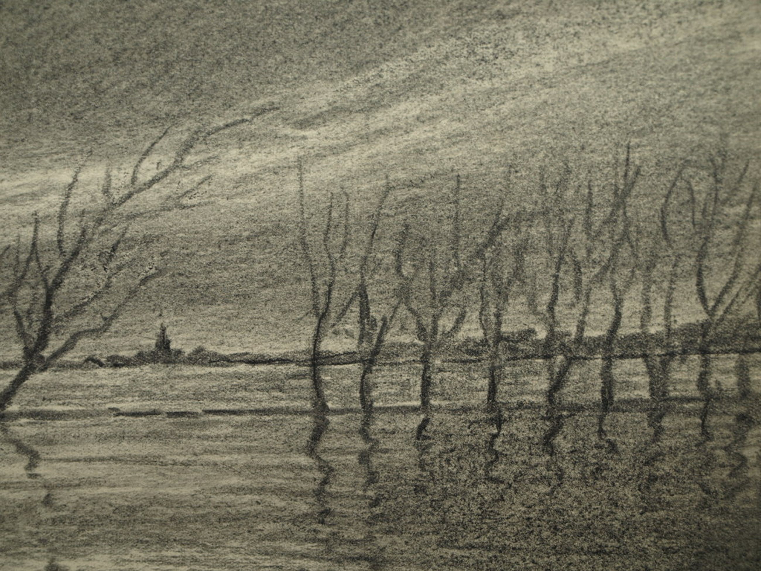 Een tekening van de Friese kunstenaar Pieter van der Brug met een voorstelling van een ondergelopen landschap.