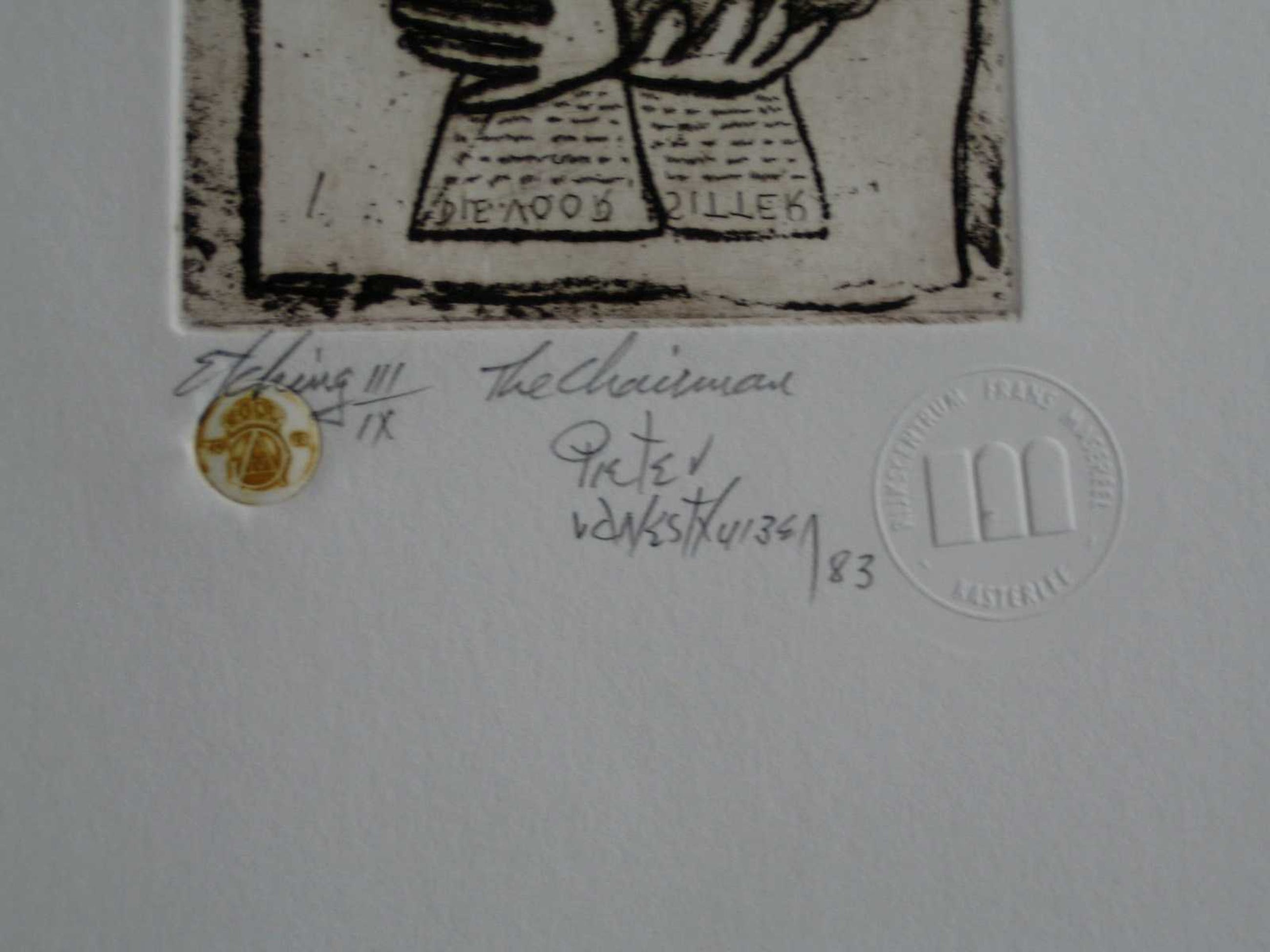 | Pieter Van der Westhuizen ( Zuid-Afrika 1931-2008) The chairman Ets, Handgesigneerd, met potlood, rechts onder, genummerd III/IX eigen druk, 1983 Pieter Van der Westhuizen is één van de meest bekende kunstenaars in Zuid-Afrika. Hij genoot een internationale reputatie voor zijn etsen en schilderijen . Titel: The Chairman Jaar: 1983 Techniek: Ets Signatuur: met potlood gesigneerd Oplage: III/IX, eigen druk met blindstempel van Frans Masereel centrum, Kasterlee , en een afdruk van een Belgisch muntje Staat: In goede staat Afmetingen: 14,8 ×10 cm op 50 x33 cm | |||||||||