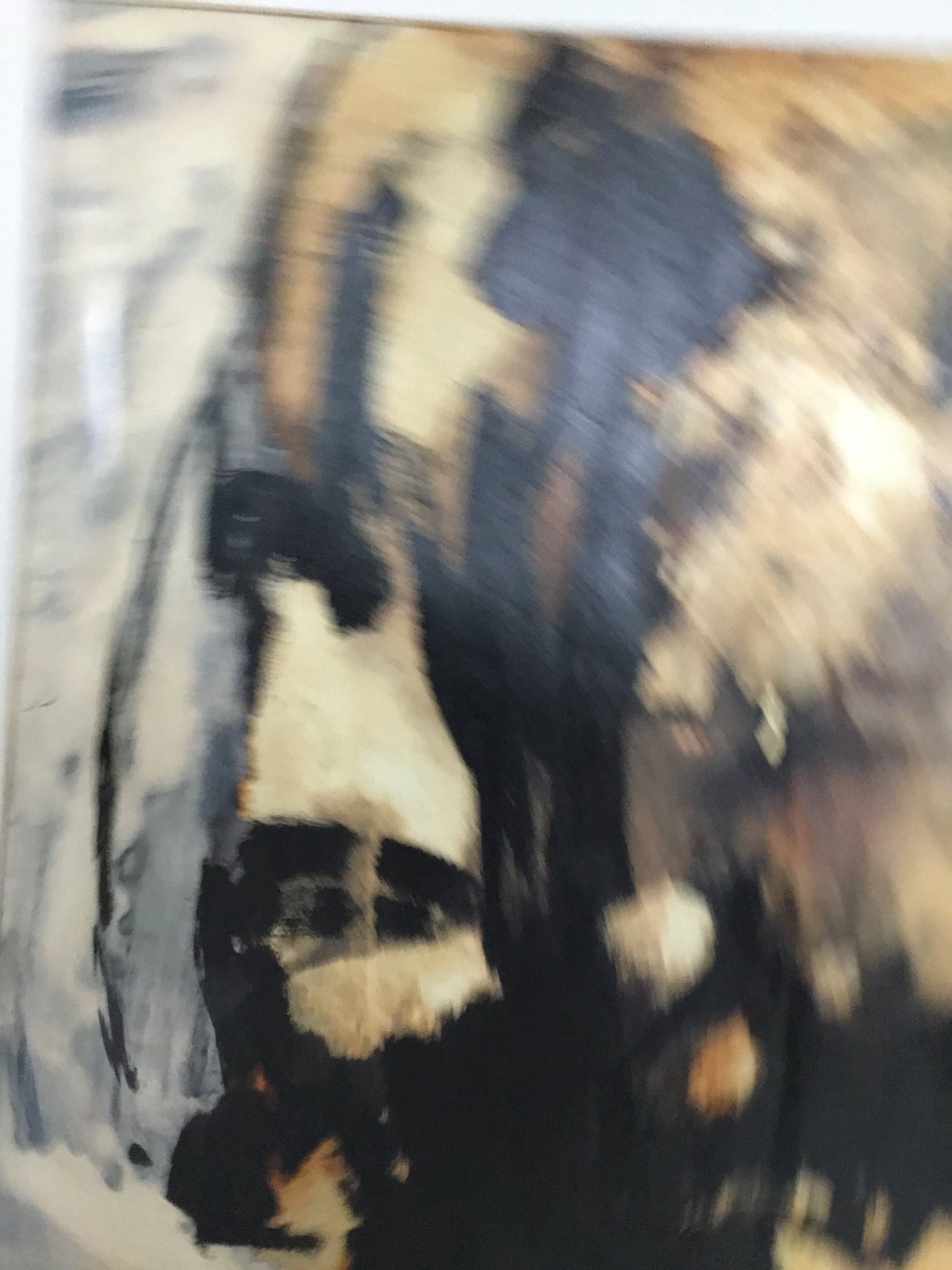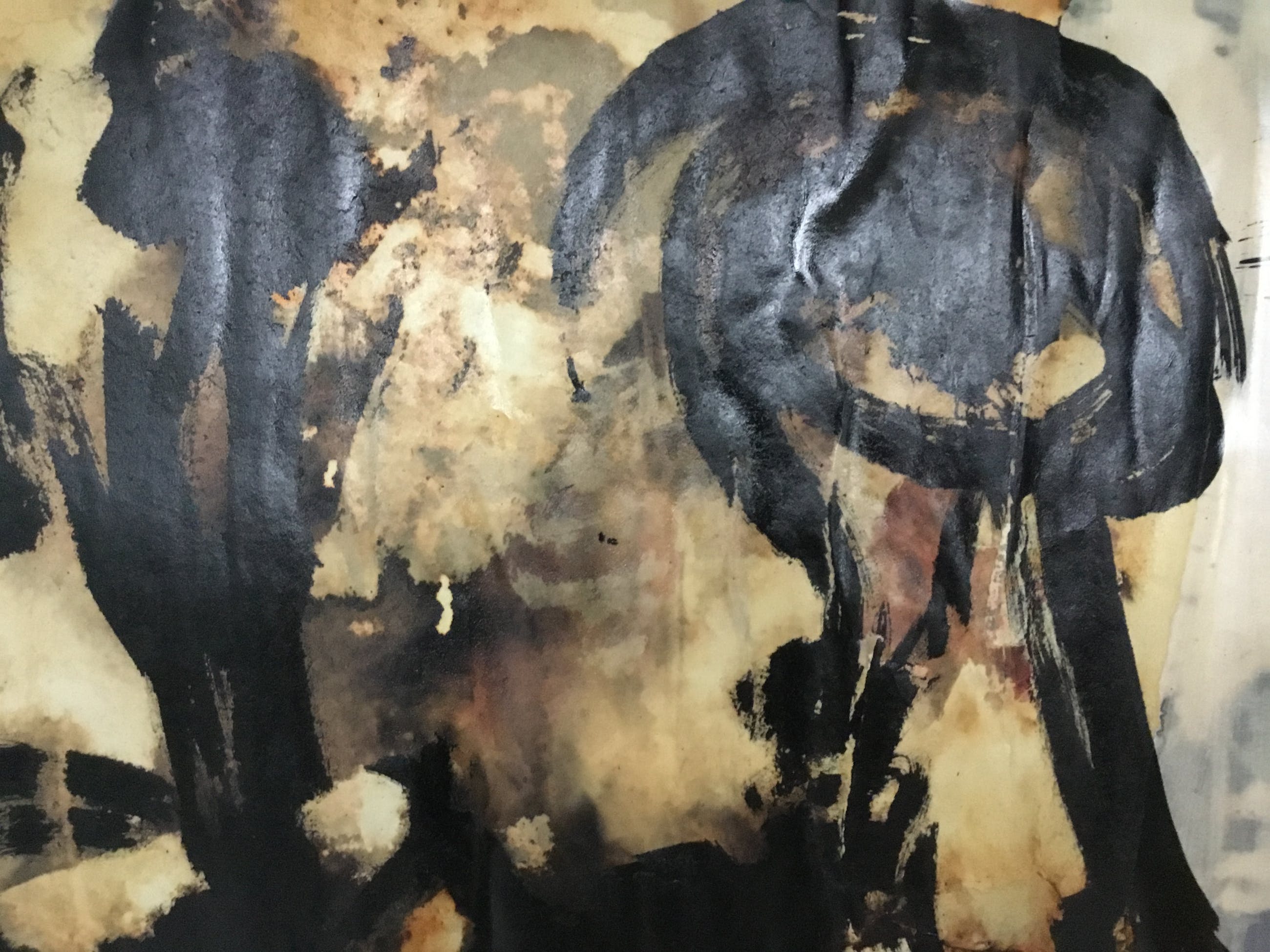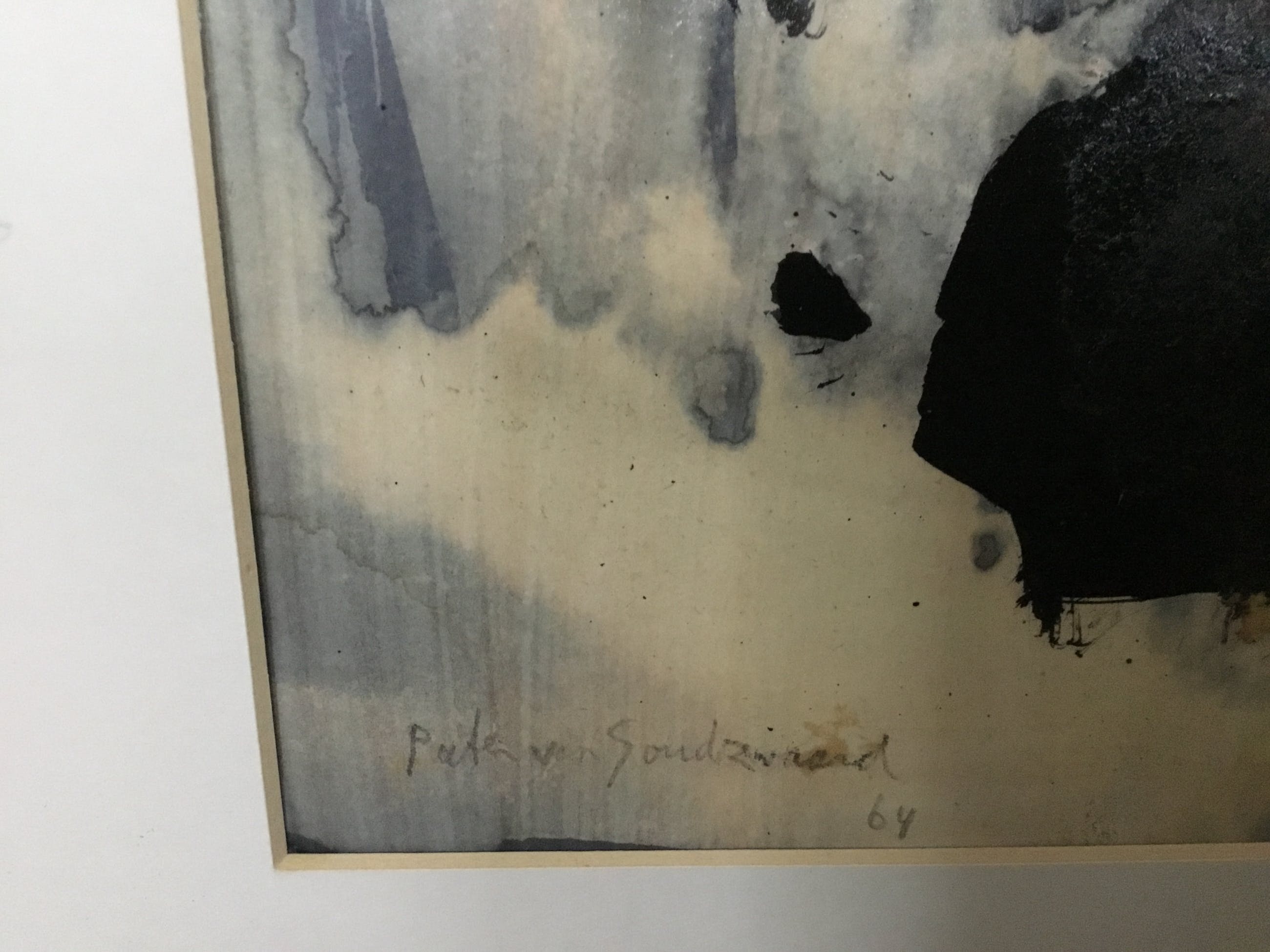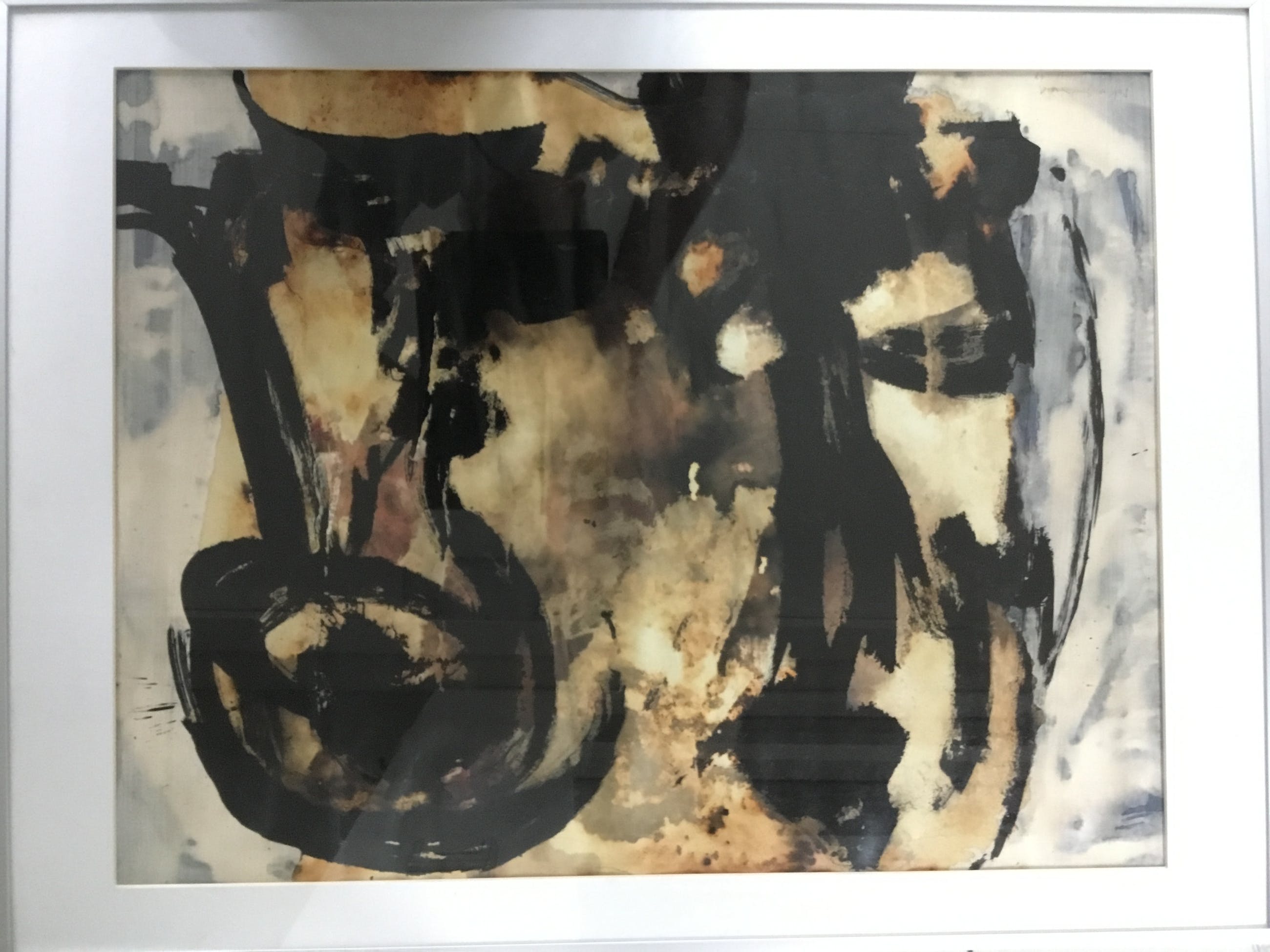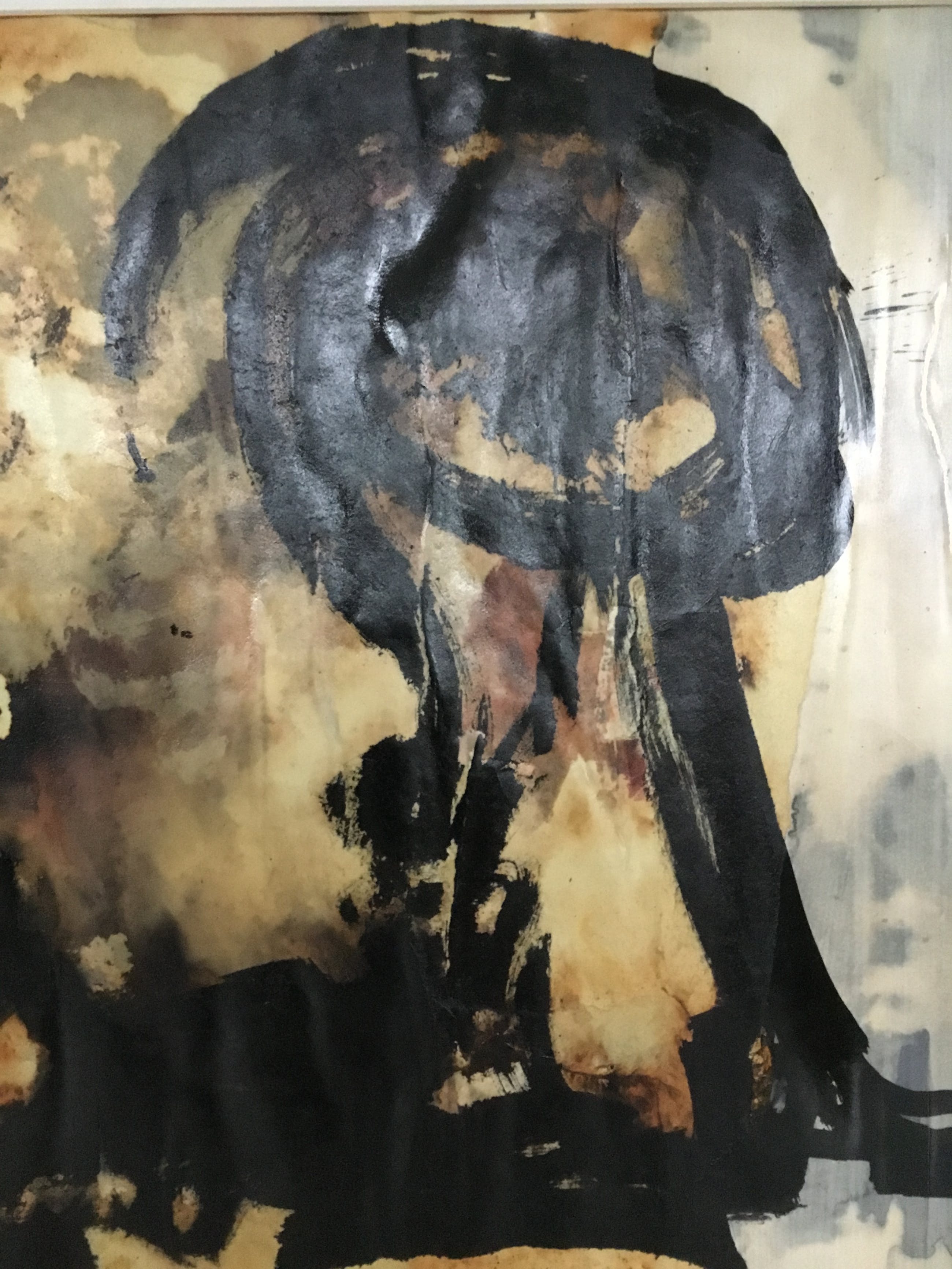Het werk is geschilderd met veel verf dit zorgt er voor dat het papier licht is gaan golven. Het werk is geïnspireerd op de prehistorische grotten van lascaux. In verso staat de datum 16-5-1965