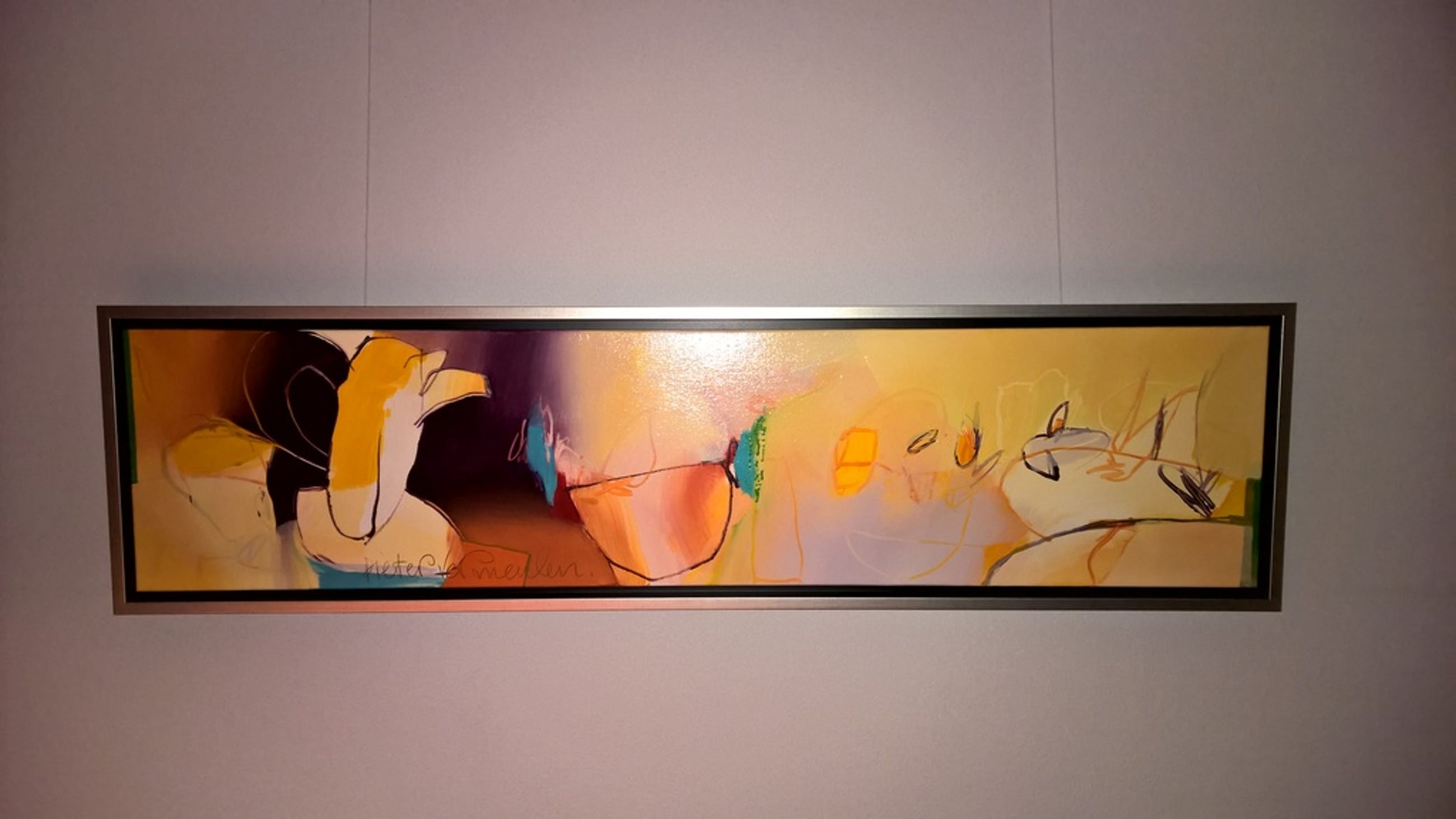 Het werk heet 'Tuintafel'. Een prachtig kleurrijk schilderij in een strakke baklijst.