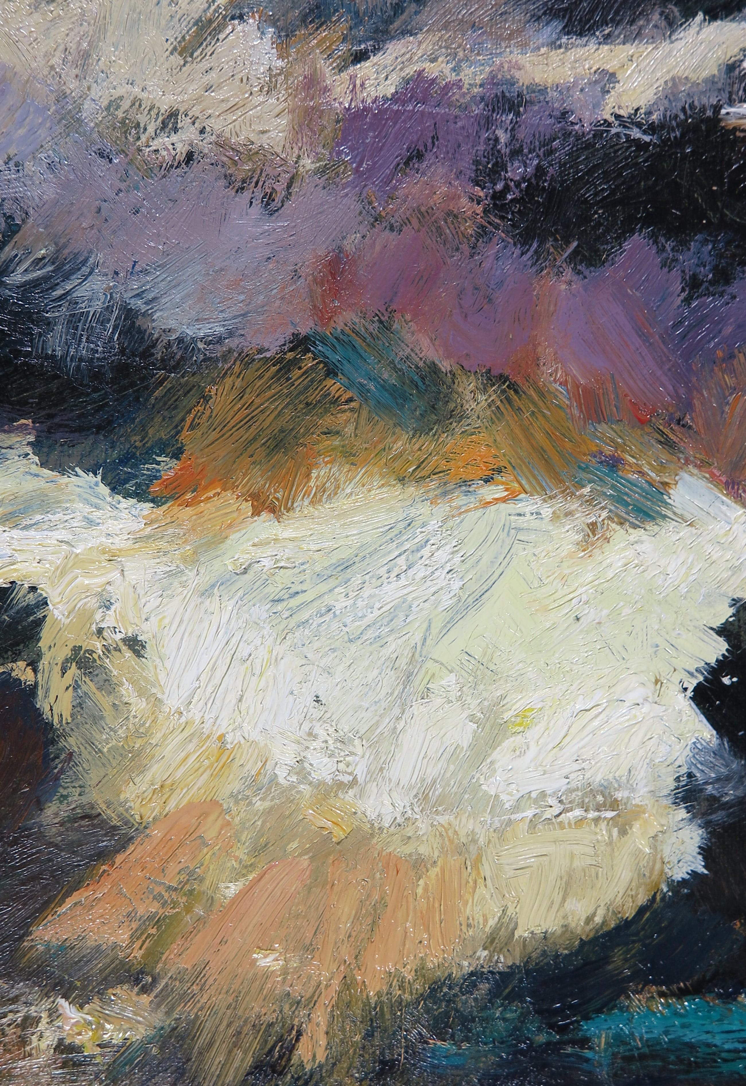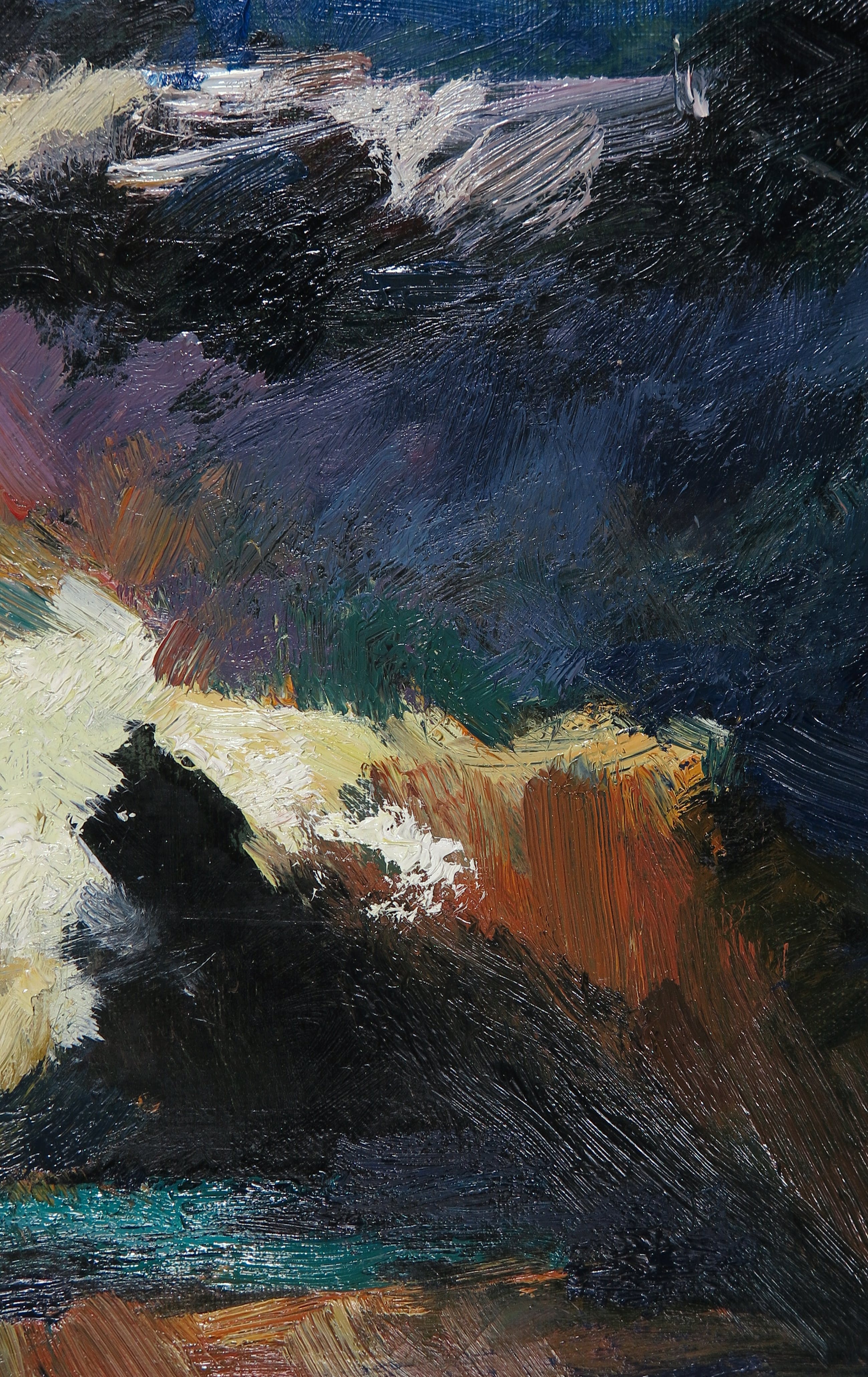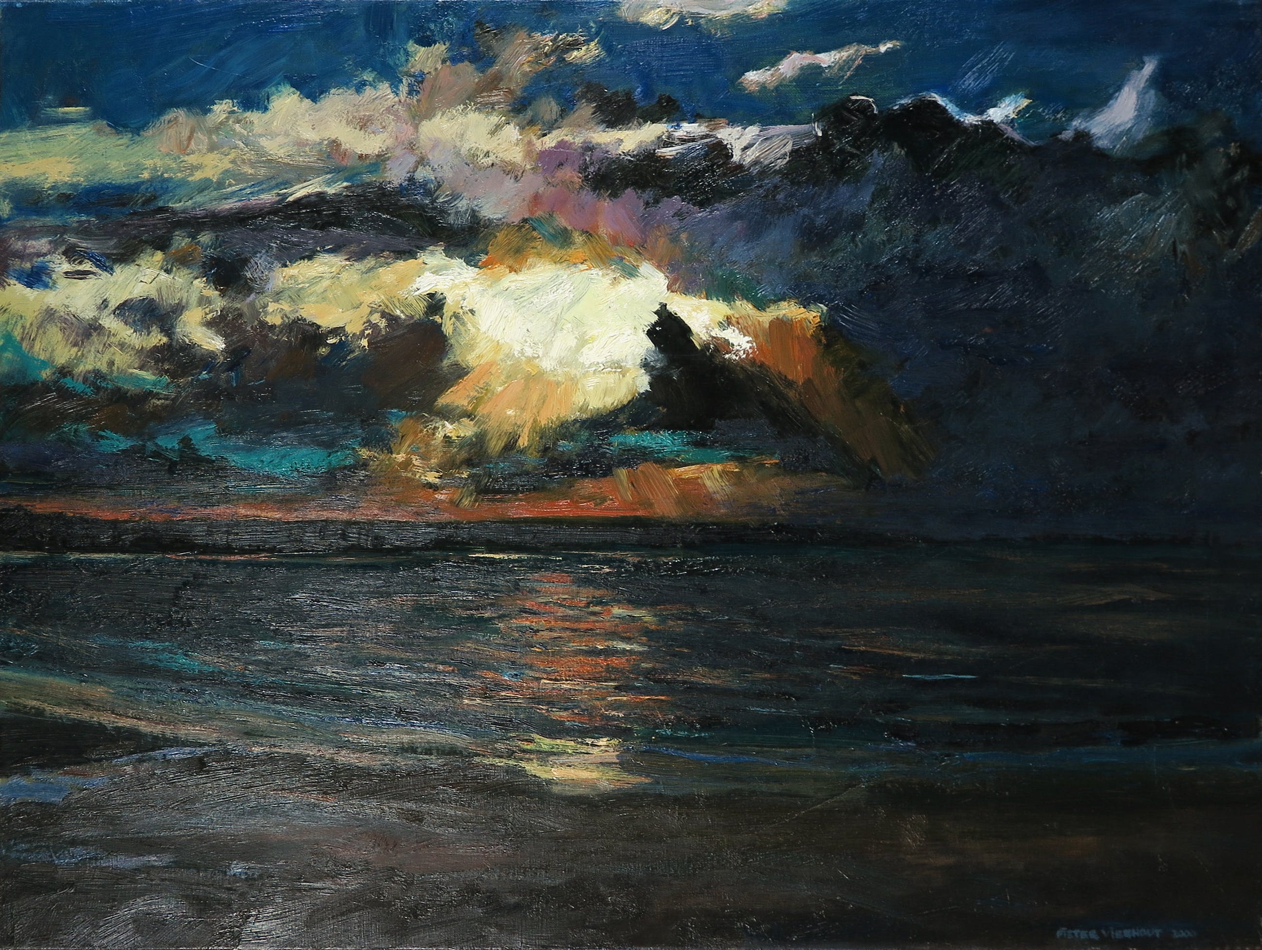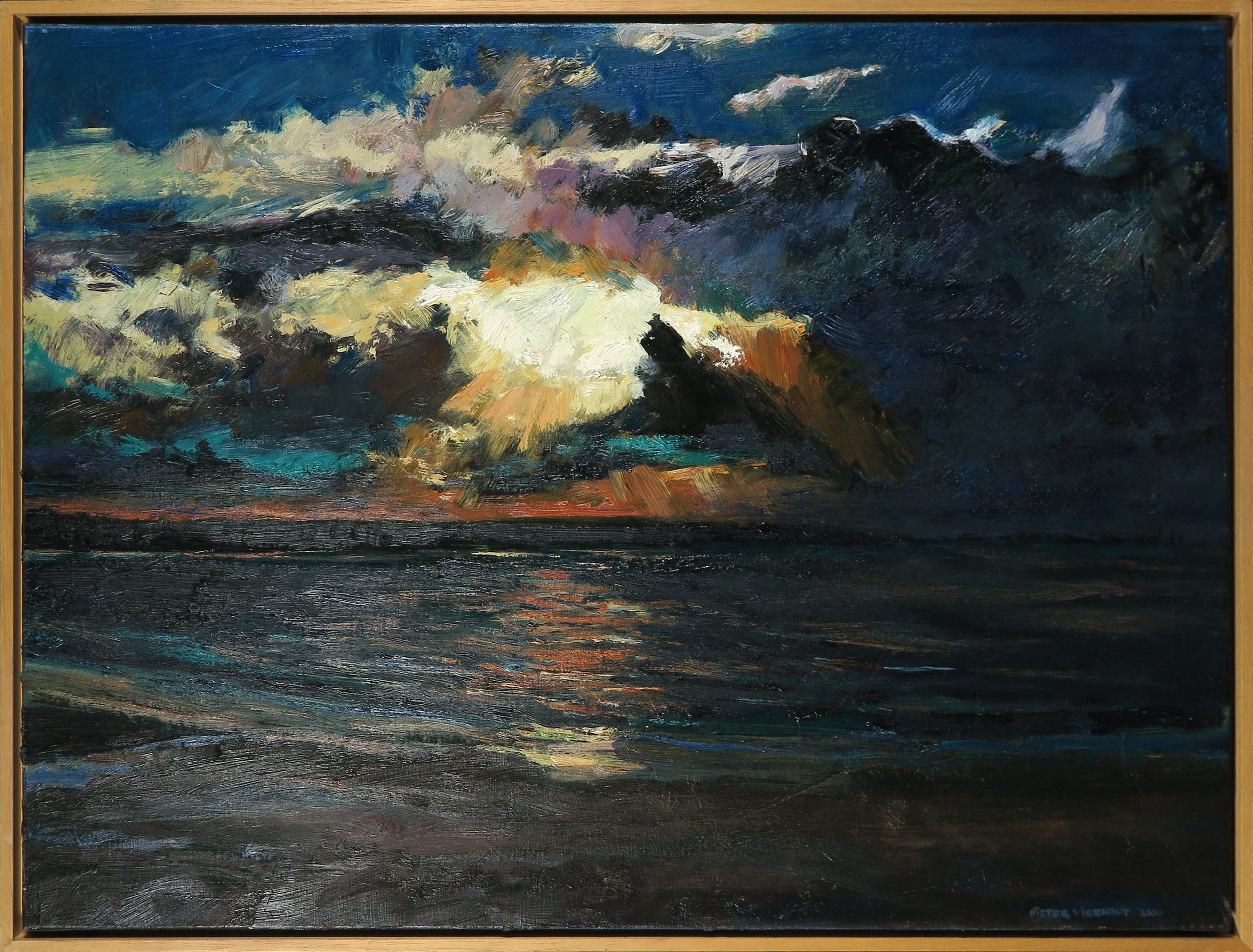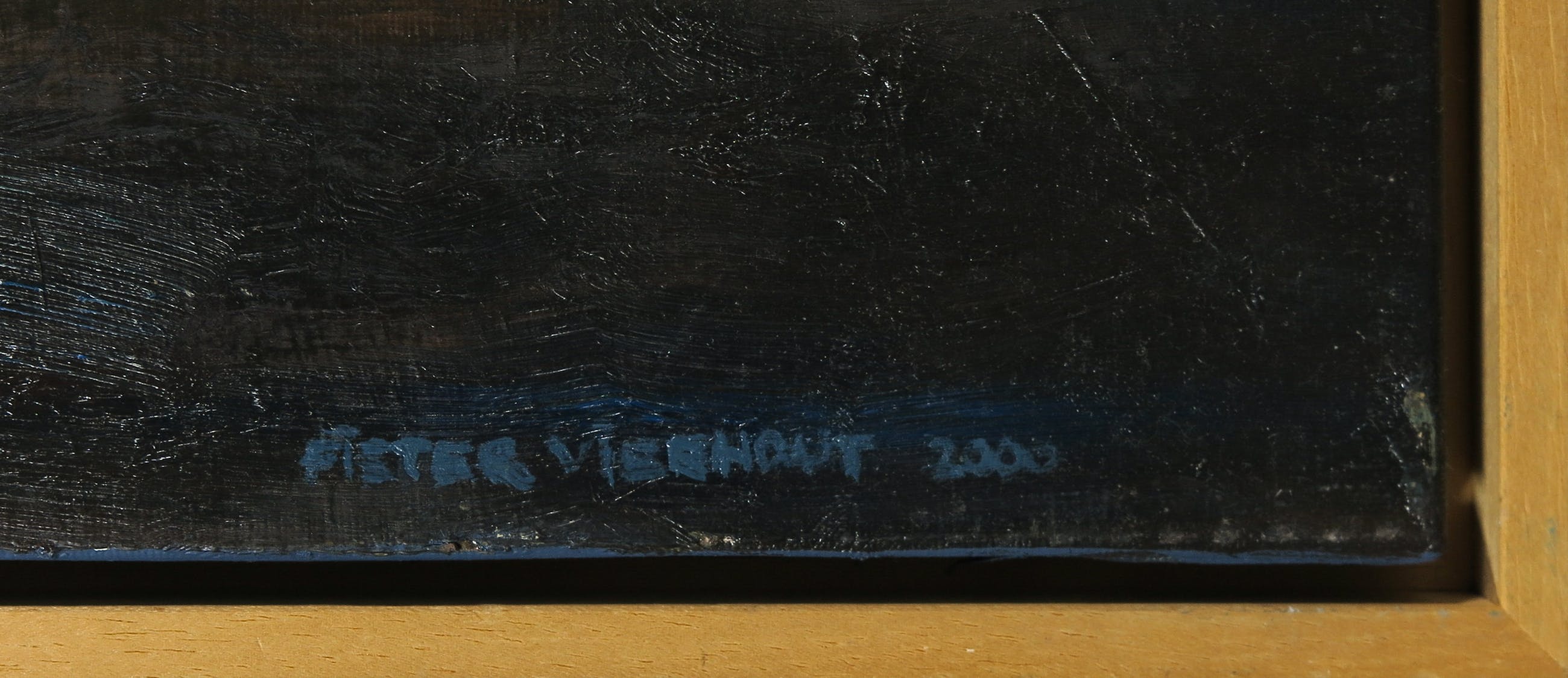 Expressief geschilderd zeegezicht door de Almelose schilder Pieter Vierhout. In de hoek rechtsonder gesigneerd en gedateerd.