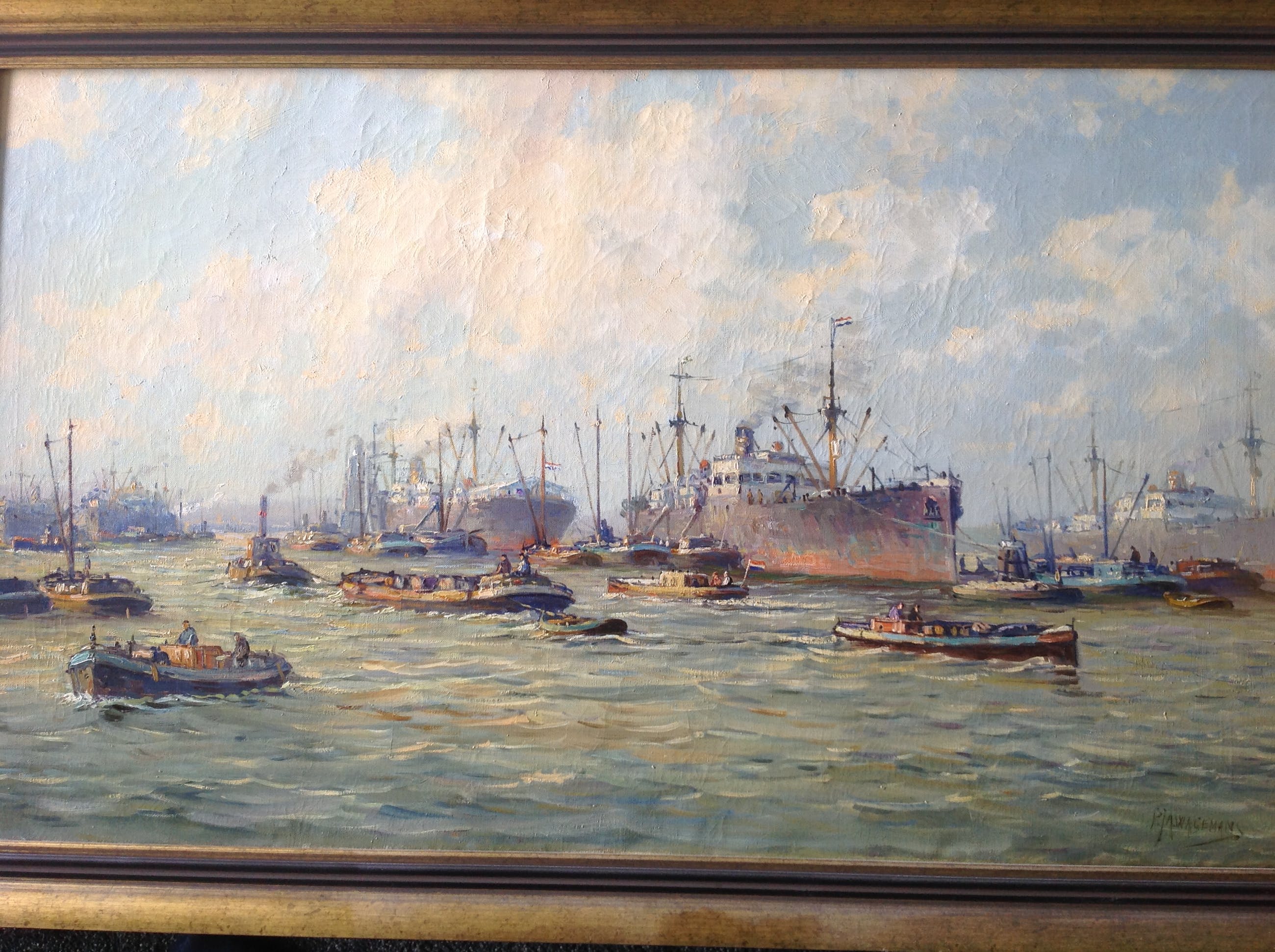 Een bijzonder afbeelding met veel details van scheepactiviteit in de haven.