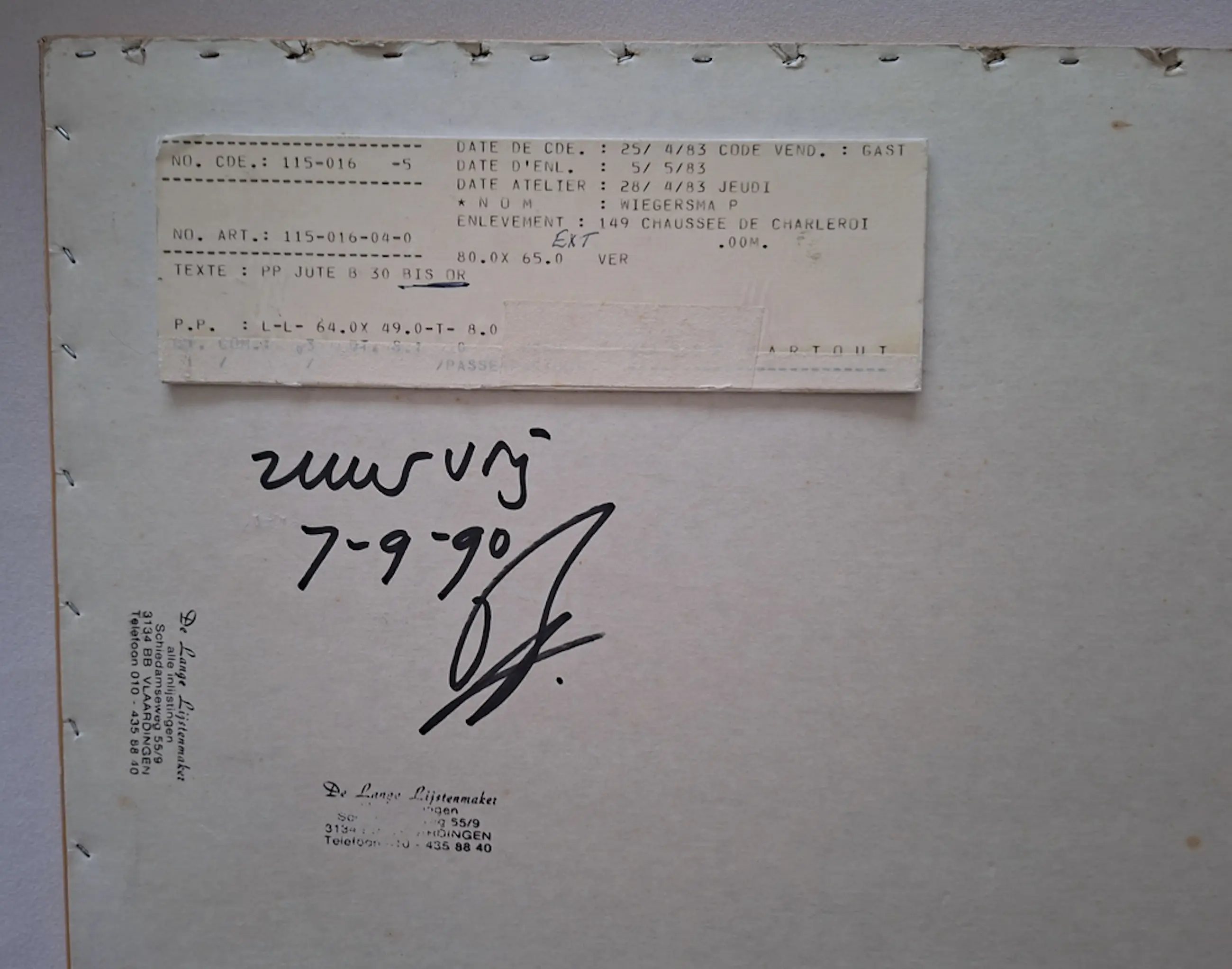 | Afhalen | Het werk is af te halen op locatie. Als koper dient u zelf verpakkingsmateriaal mee te nemen. De locatie is: Capelle aan den ijssel, Nederland |
