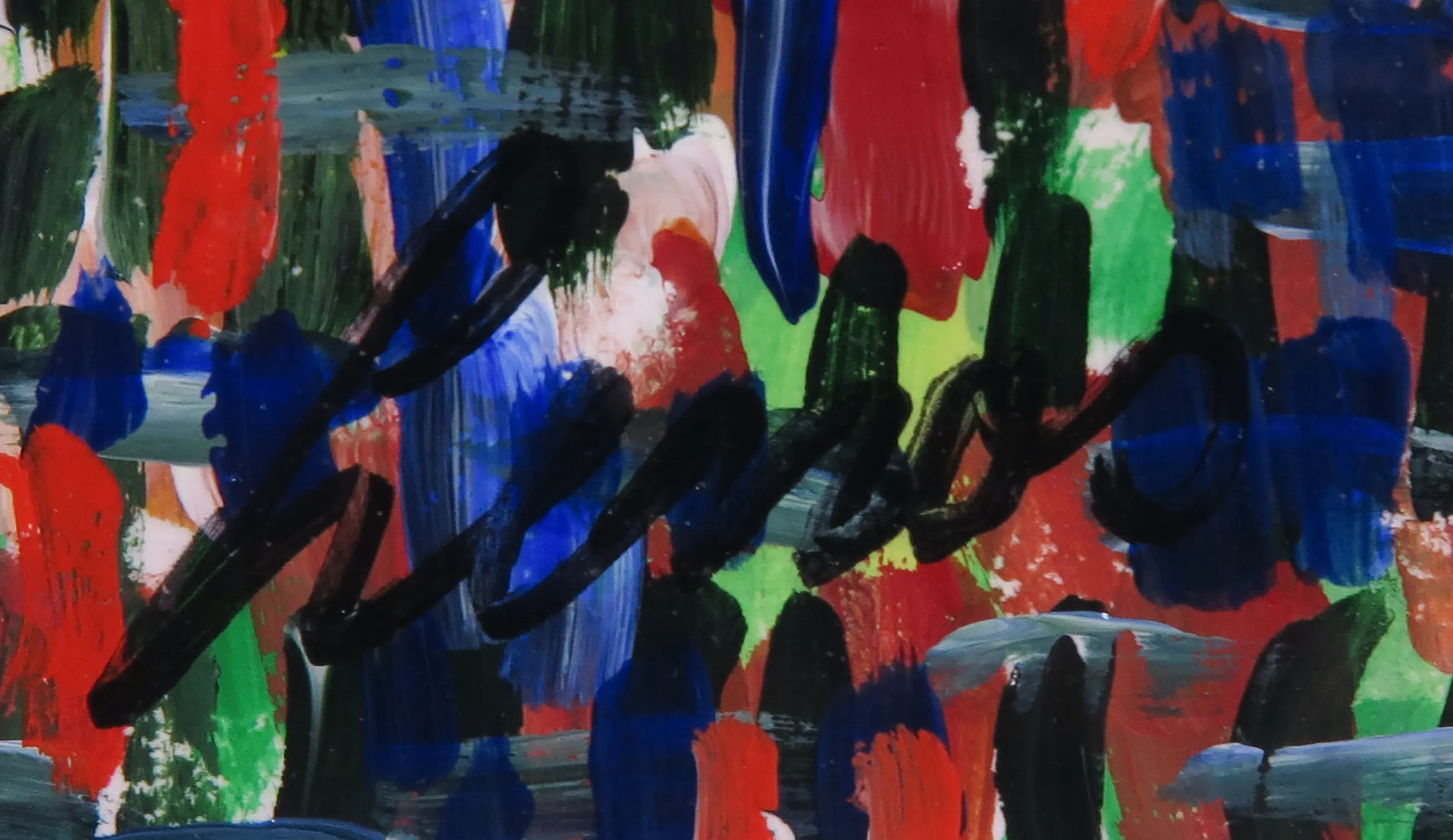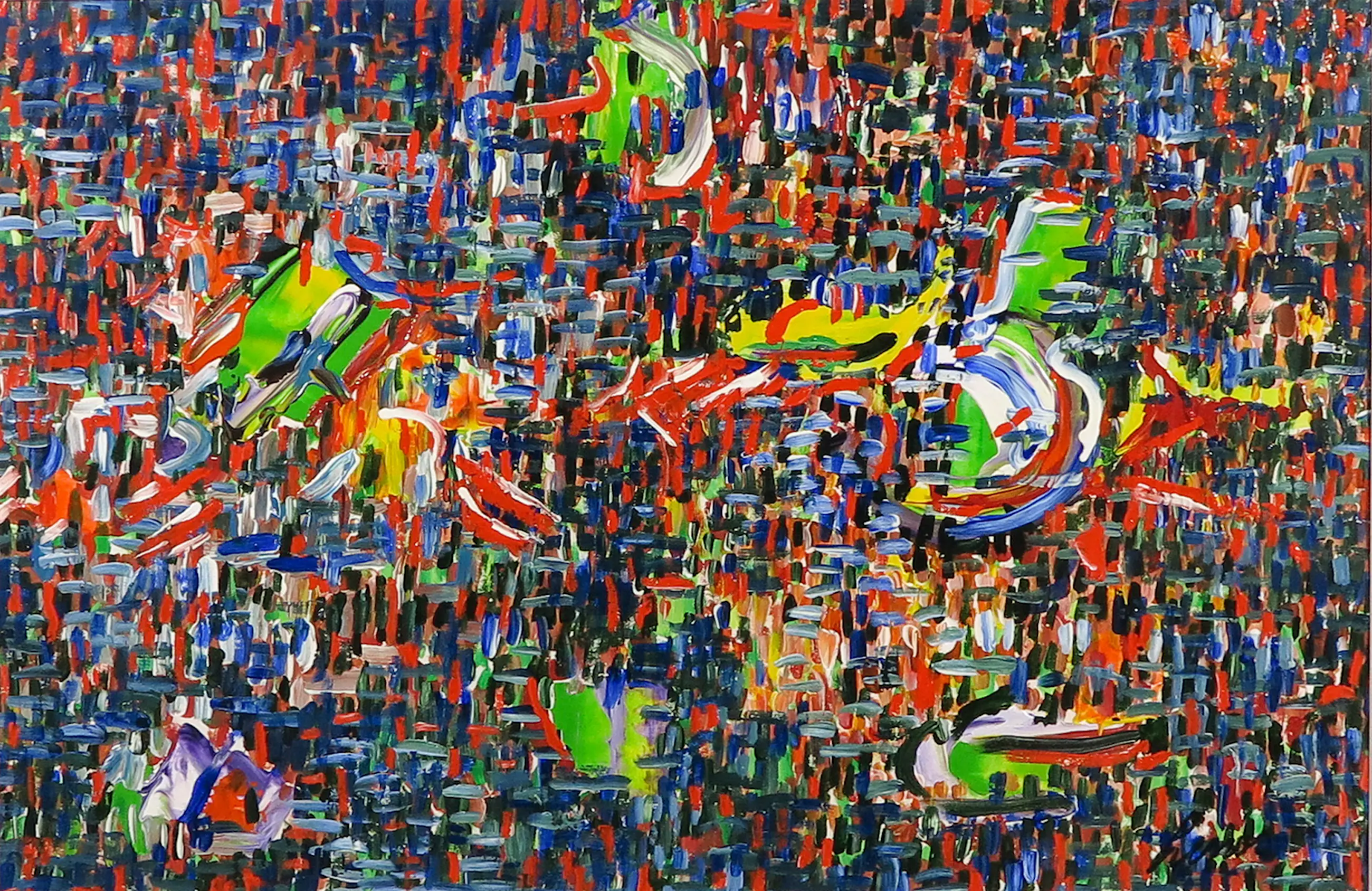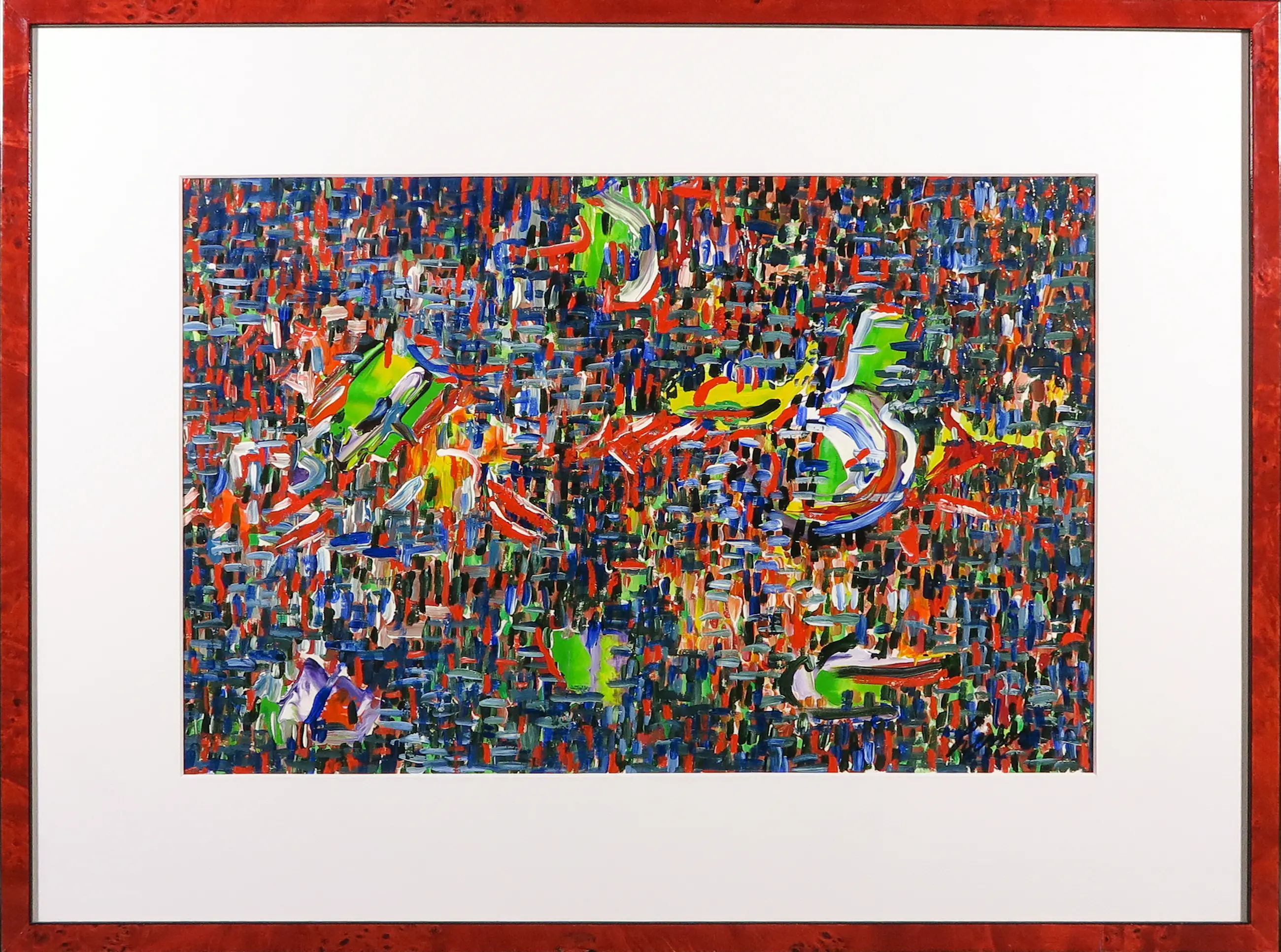 Levendige voorstelling met licht reliëf van Nederlandse kunstenaar Pim Lenos in acryl op papier.