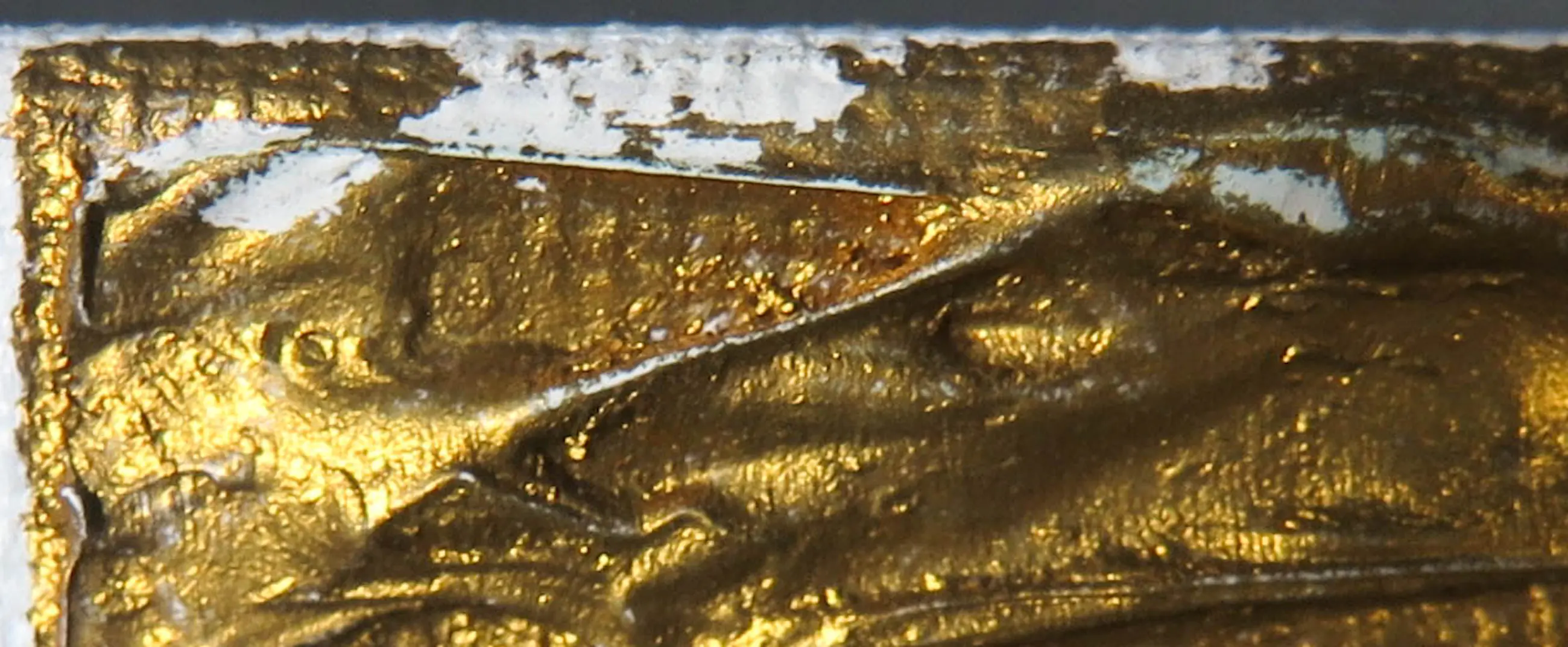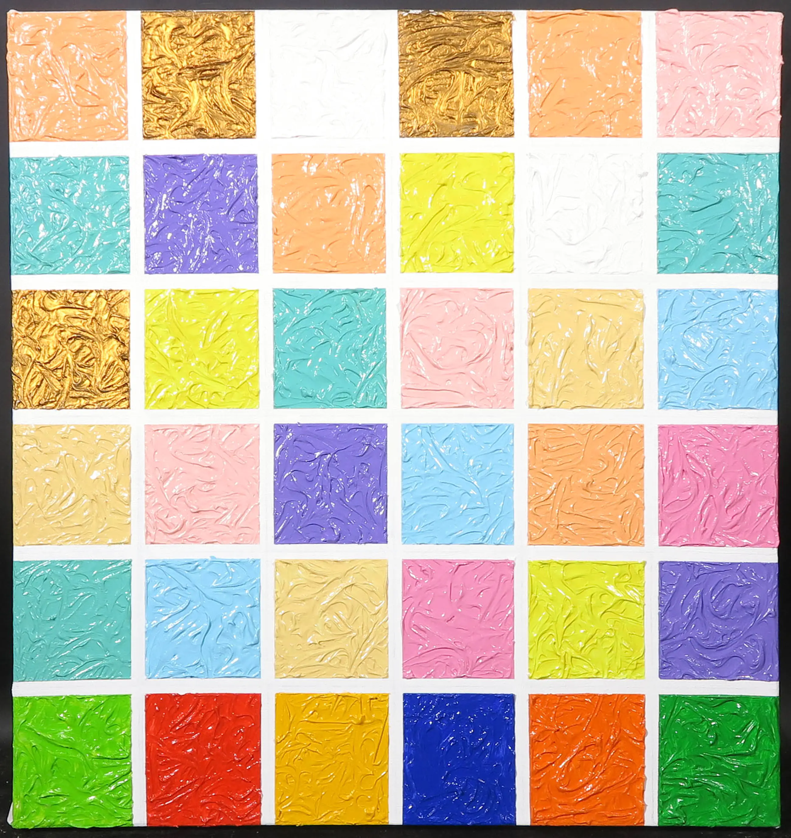 Werk waarbij er is gewerkt met verf en gesso, waardoor er een reliëf is ontstaan. Verso gesigneerd.