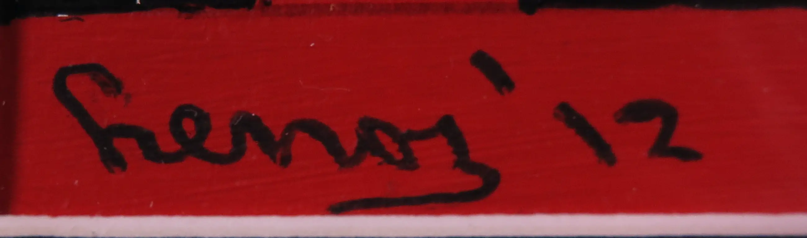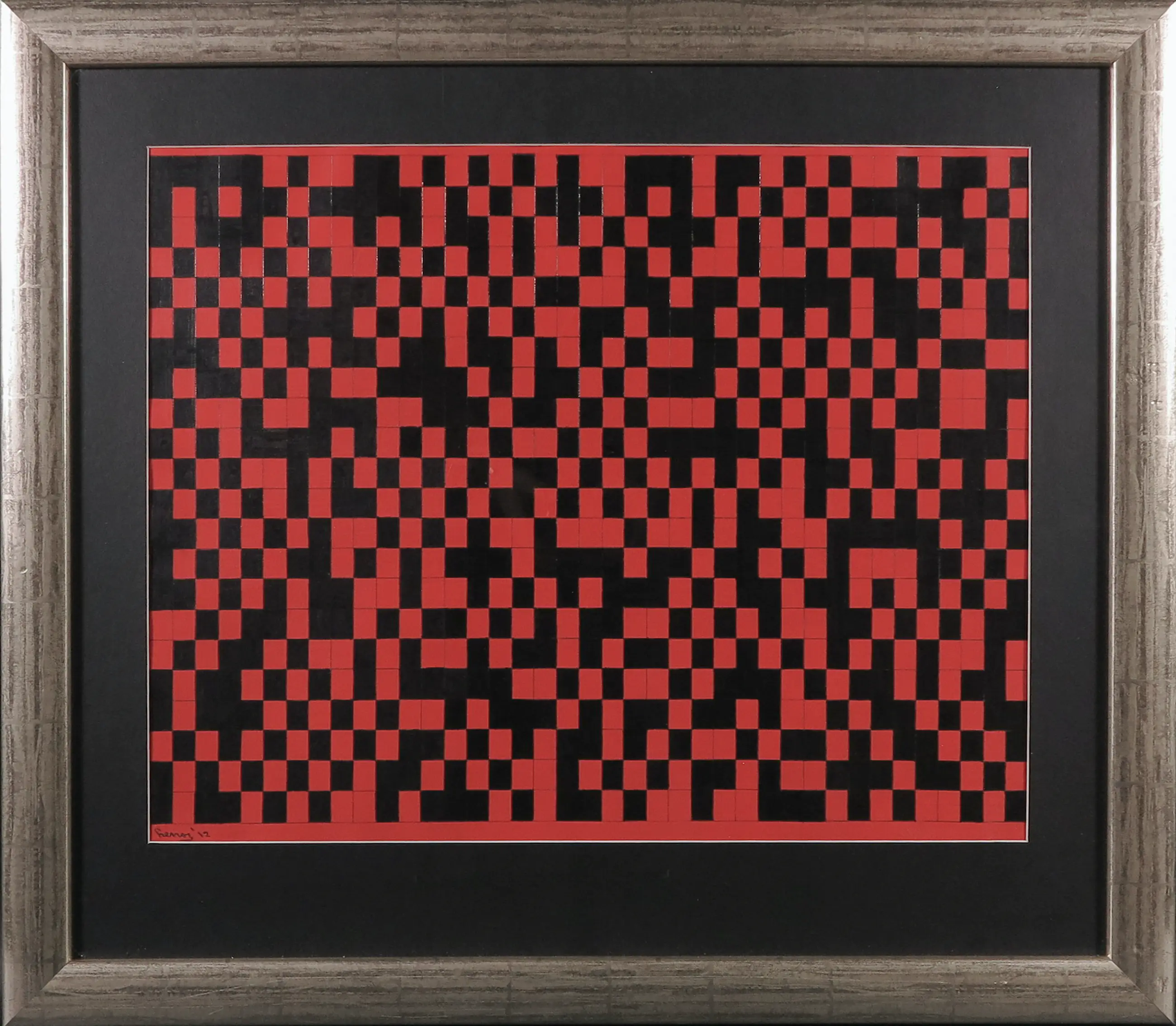 Werk van Nederlandse kunstenaar Pim Lenos in gemengde techniek op papier, in een bijzondere licht goudgekleurde lijst. Linksonder gesigneerd door de kunstenaar.