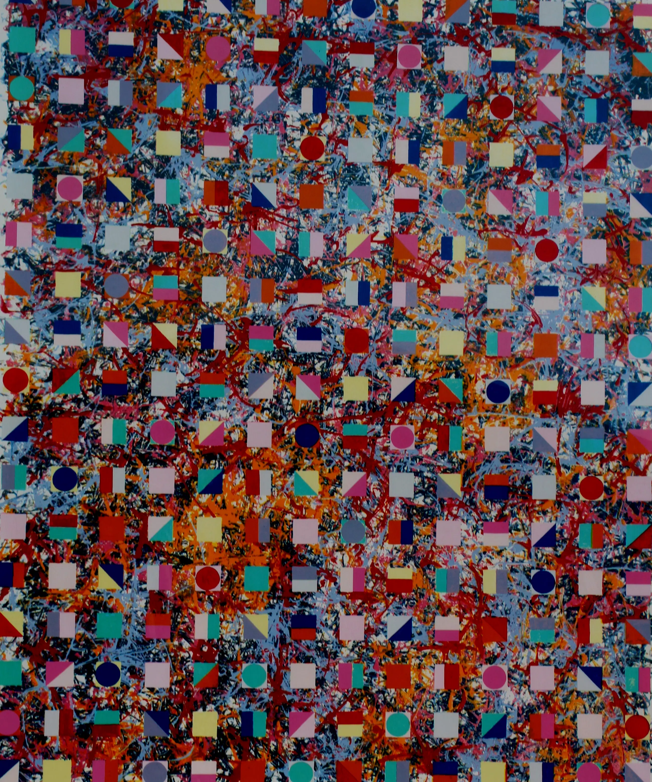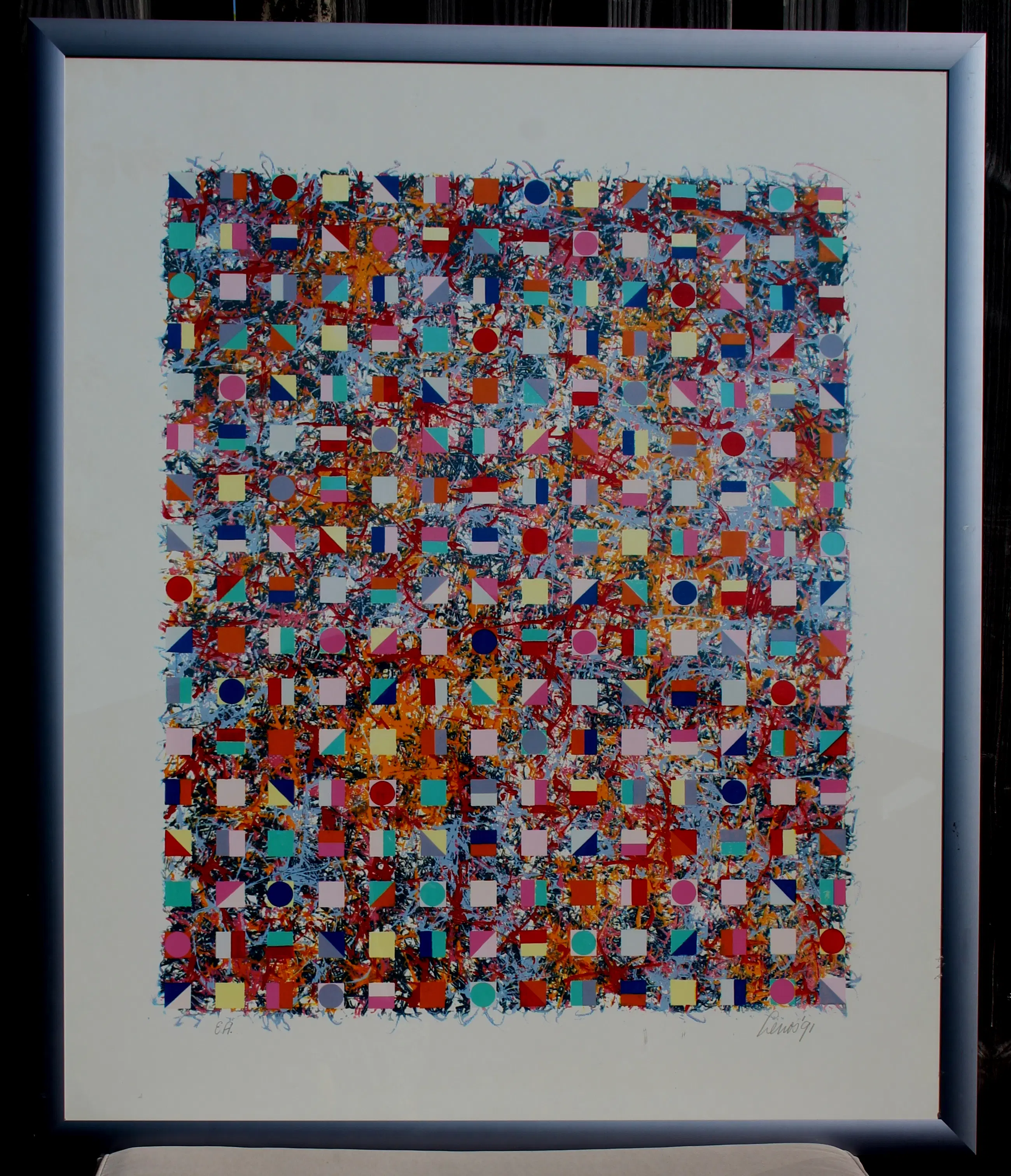Ingelijste kleuren zeefdruk van Pim Lenos. Compositie, zonder titel. Jaar: 1991. Oplage: EA. Afmetingen incl lijst: H116 x b98cm. Afmetingen voorstelling: H90 x B74cm.