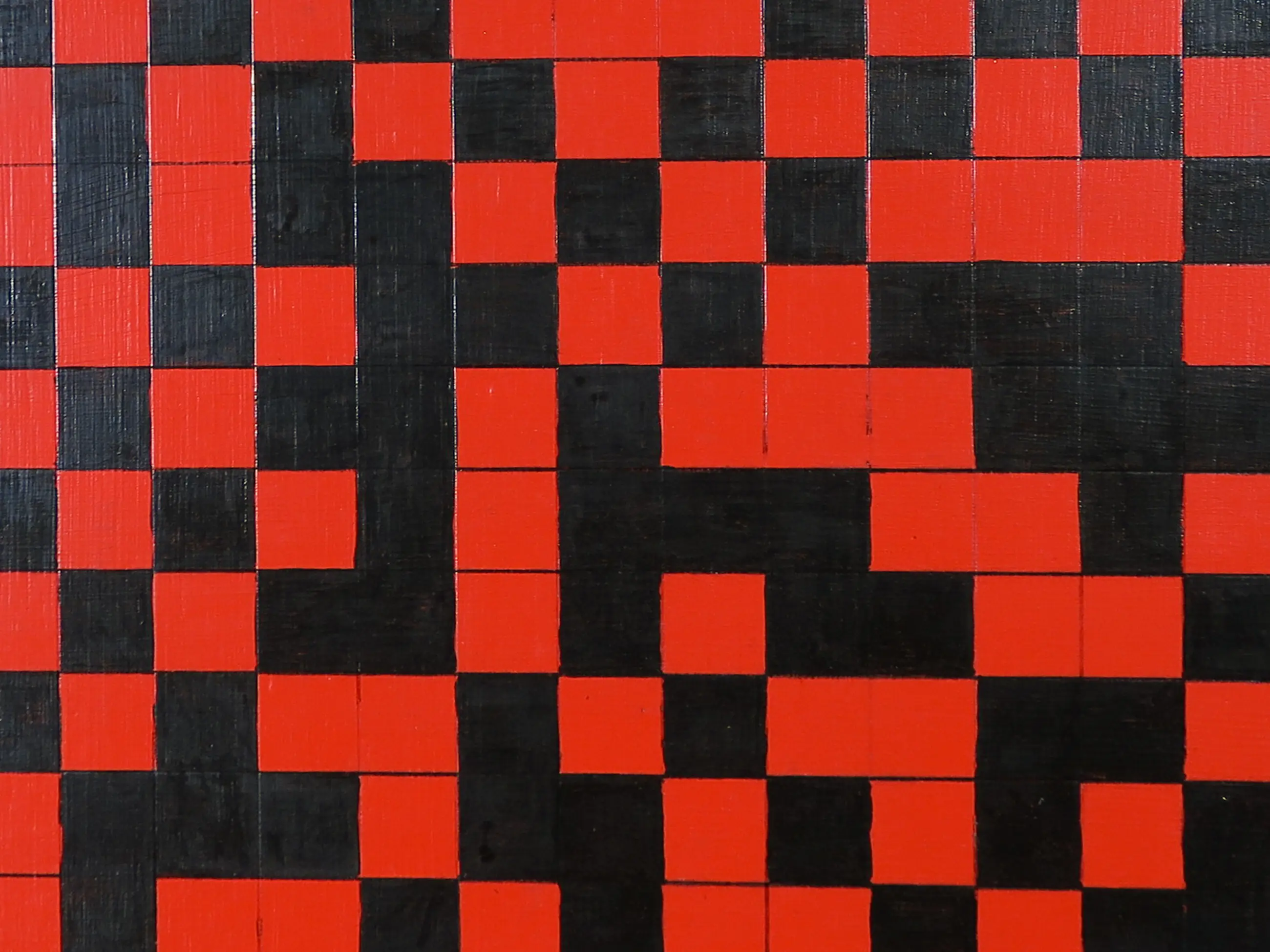 Wat minimale craquelé zichtbaar in de zwarte vlakken. Lichte slijtage en gebruikssporen aan de randen van het board. Aan de onderrand er wat meer schade te zien, zoals op de foto's ook zichtbaar is.